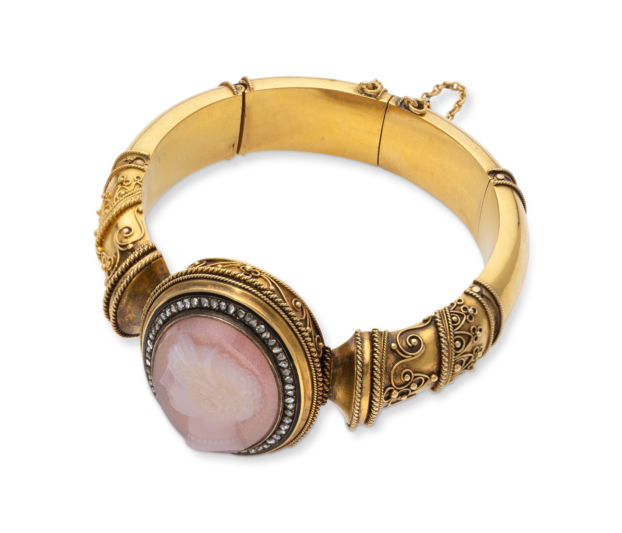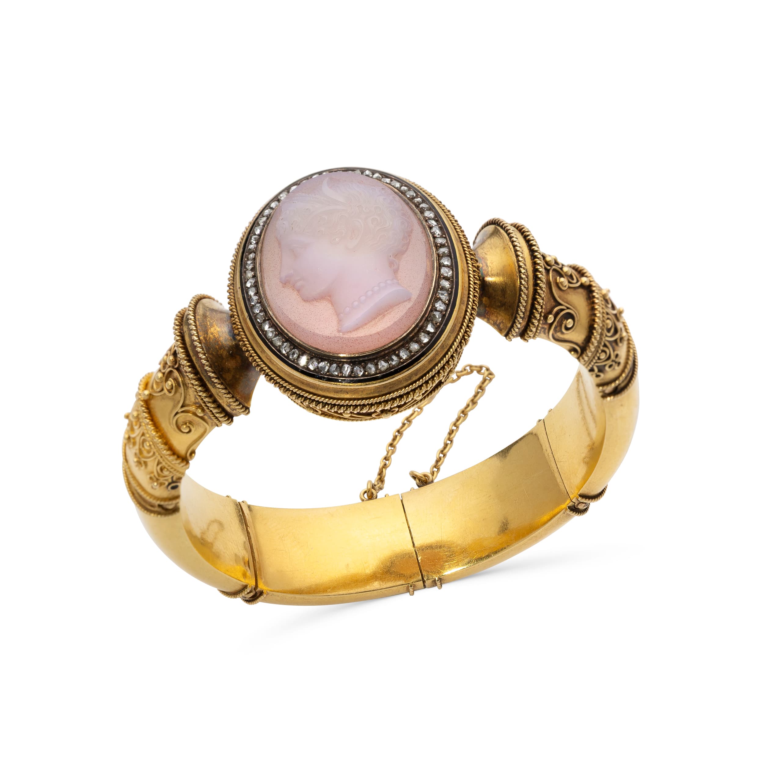 19th CENTURY NEO-CLASSIQUE 18K YELLOW GOLD, CAMEO, DIAMOND BANGLE BRACELET, circa 1848