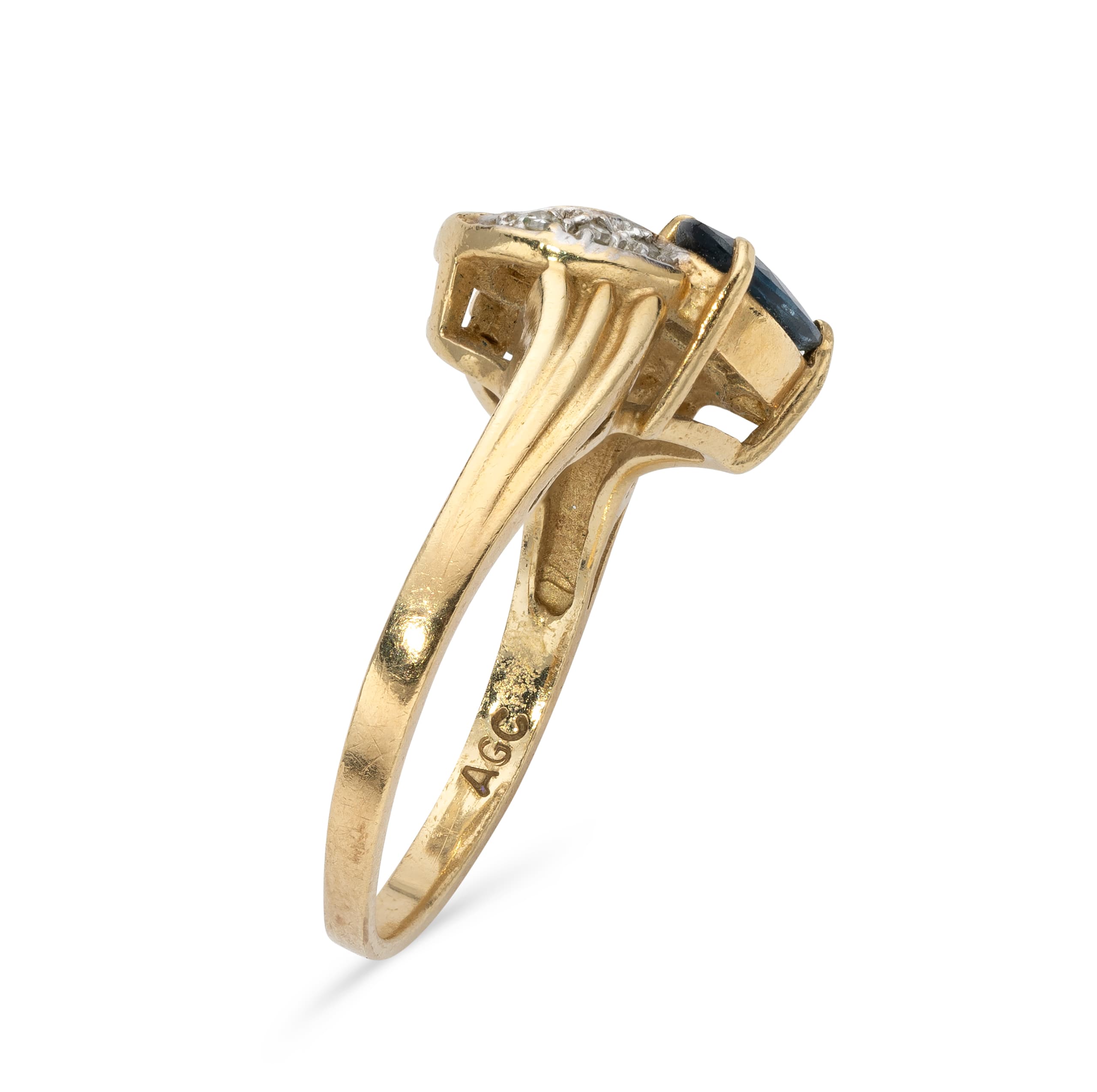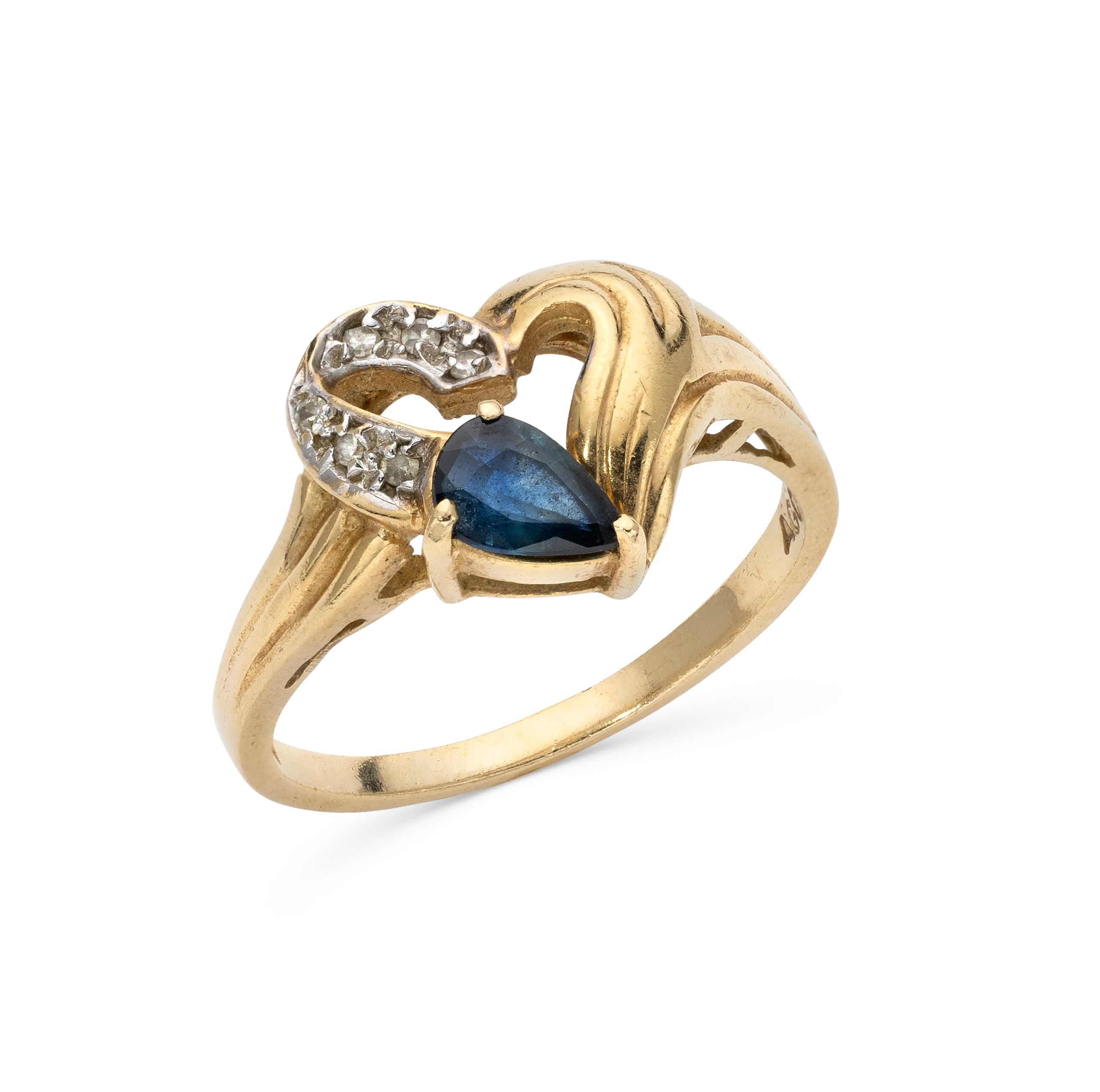 14k yellow gold ring depicting a stylized heart set with a pear-shape sapphire and ponctuated with brilliant-cut diamonds