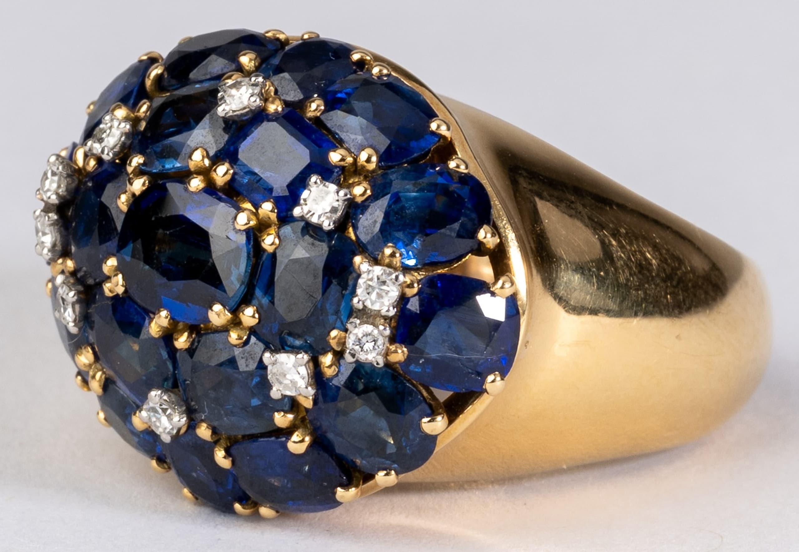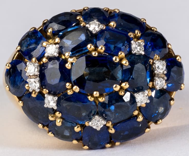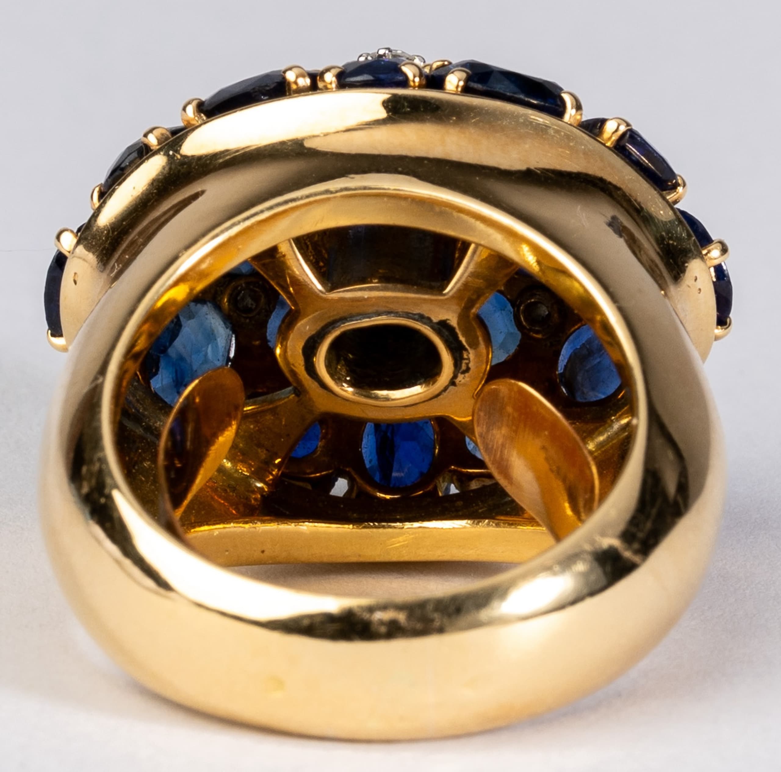 vintage cocktail ring in 18K yellow gold set with 8/8-cut diamonds weighing approximately 0,40 ct. and cushion-cut sapphires weighing approximately 11 ct.