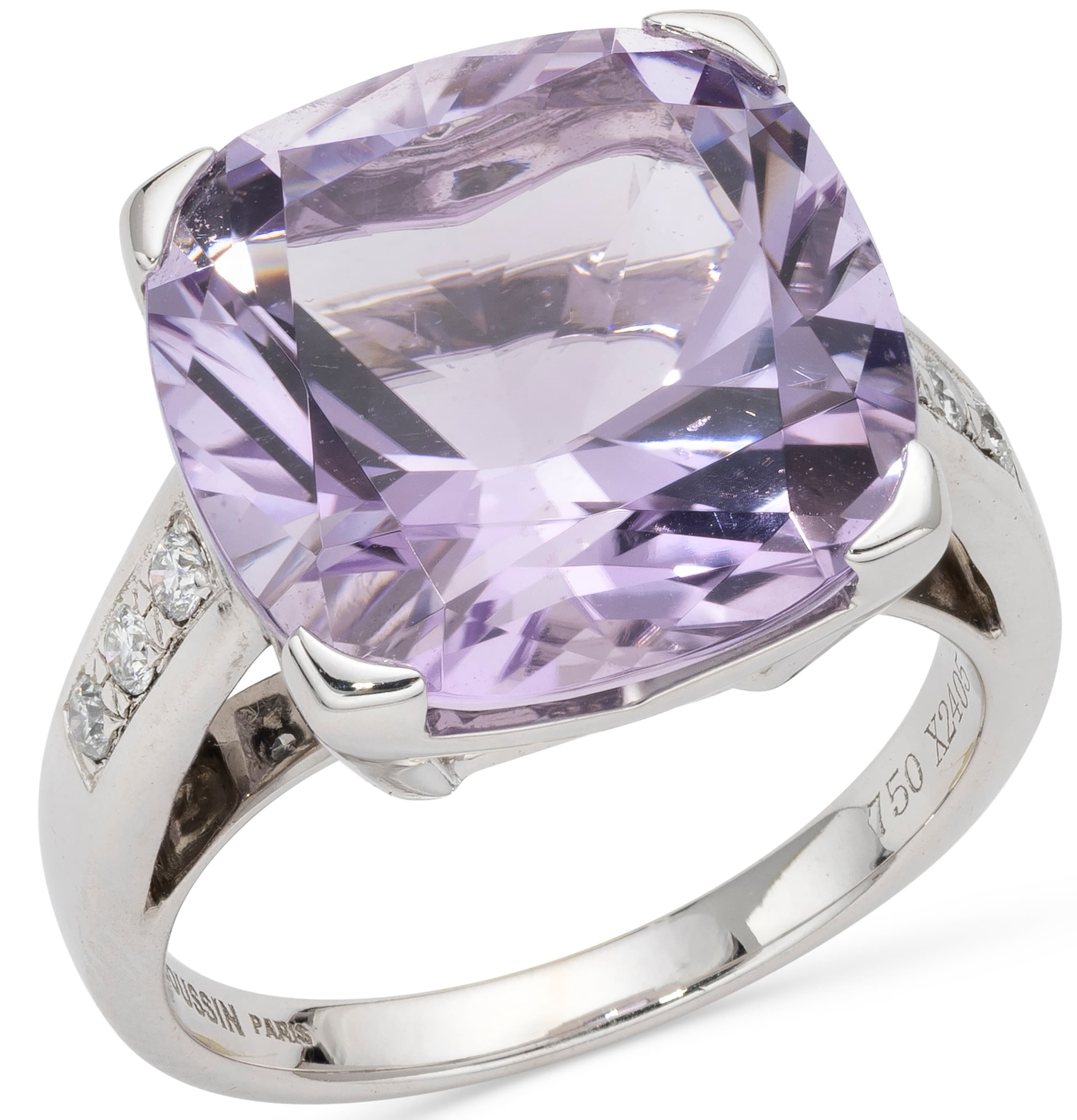 Mauboussin ring made in 18k white gold set with a cushion-cut amethyst weighing approximately 8 ct. and brilliant-cut diamonds weighing approximately 0.20 ct.