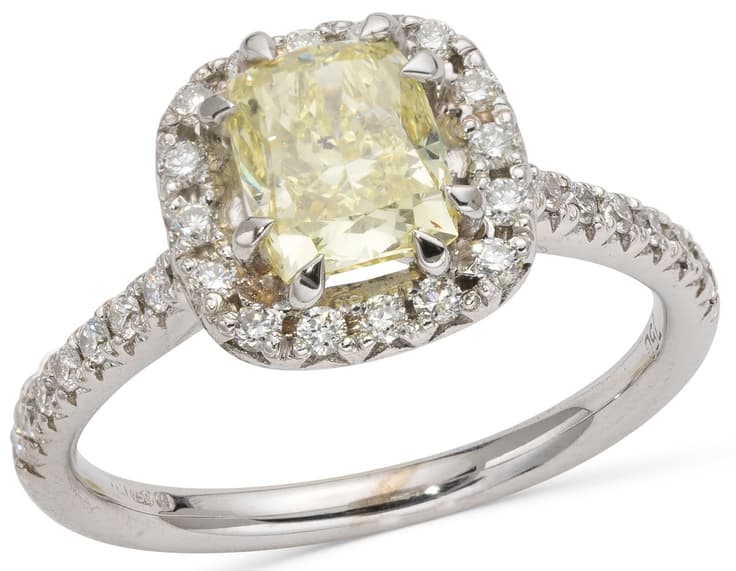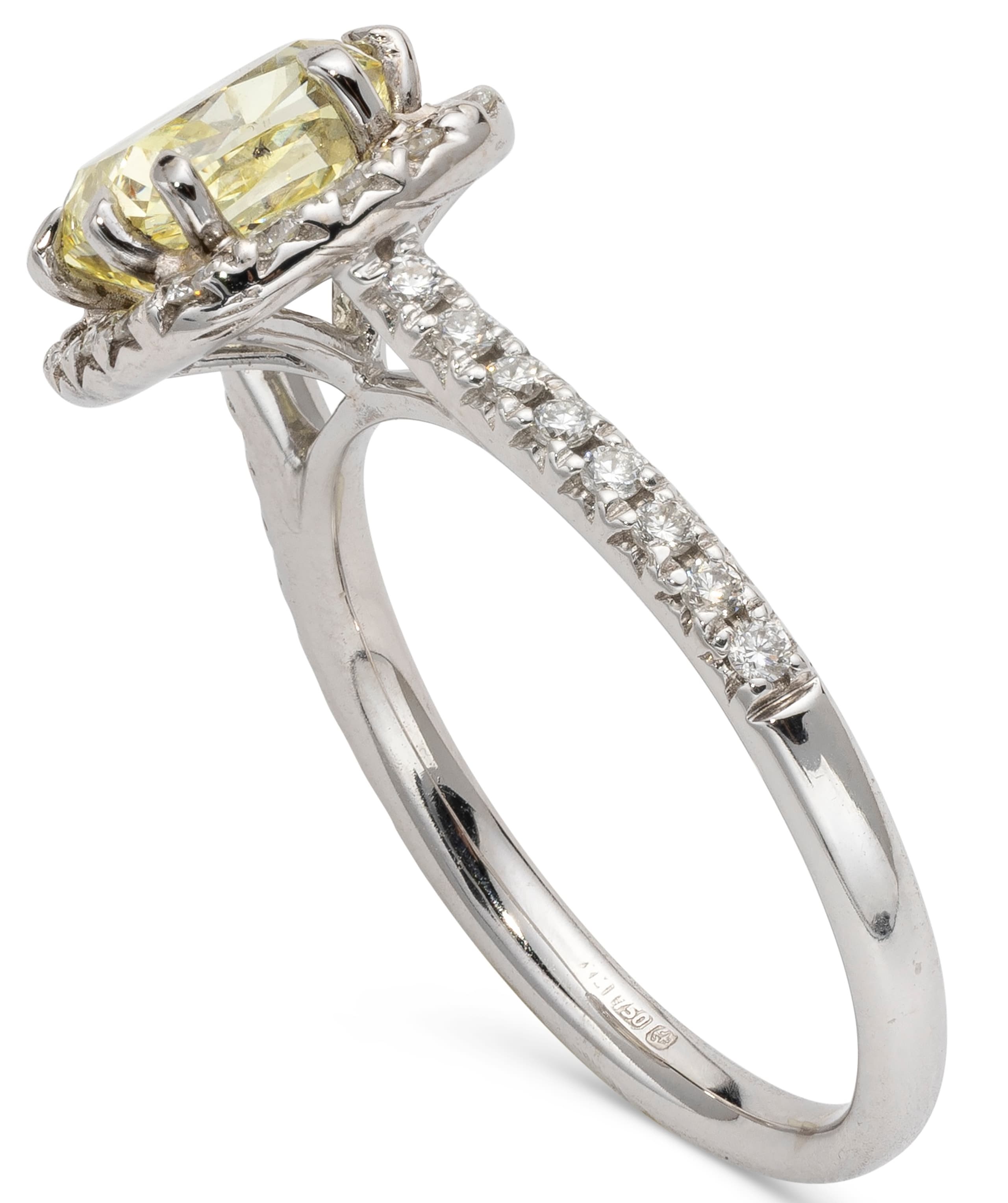 18k white gold rong set with a cushion-cut fancy yellow diamond weighing 1,37 ct. framed with brilliant-cut diamonds weighing 0,39 ct.