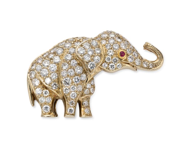 14k yellow gold brooch depicting an elephant paved with brilliant-cut diamonds weighing approximately 1.50 ct. with a facetted ruby as the eye