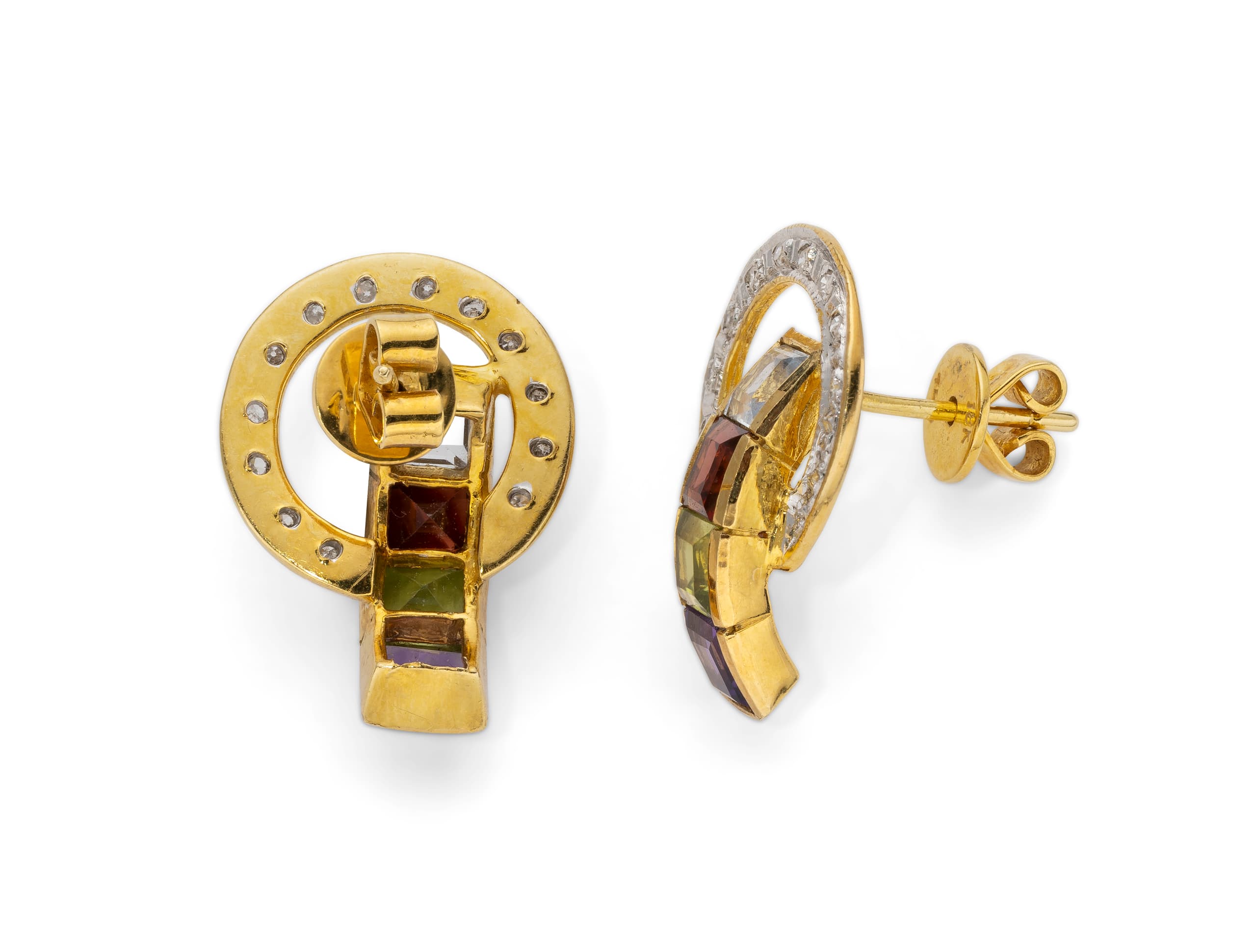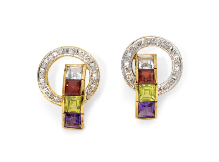 pair of earrings in 18K yellow gold set with brilliant-cut diamonds weighing approximately 0,08 ct. and enhanced with prasiolites, aquamarines, amethysts, peridots and garnets