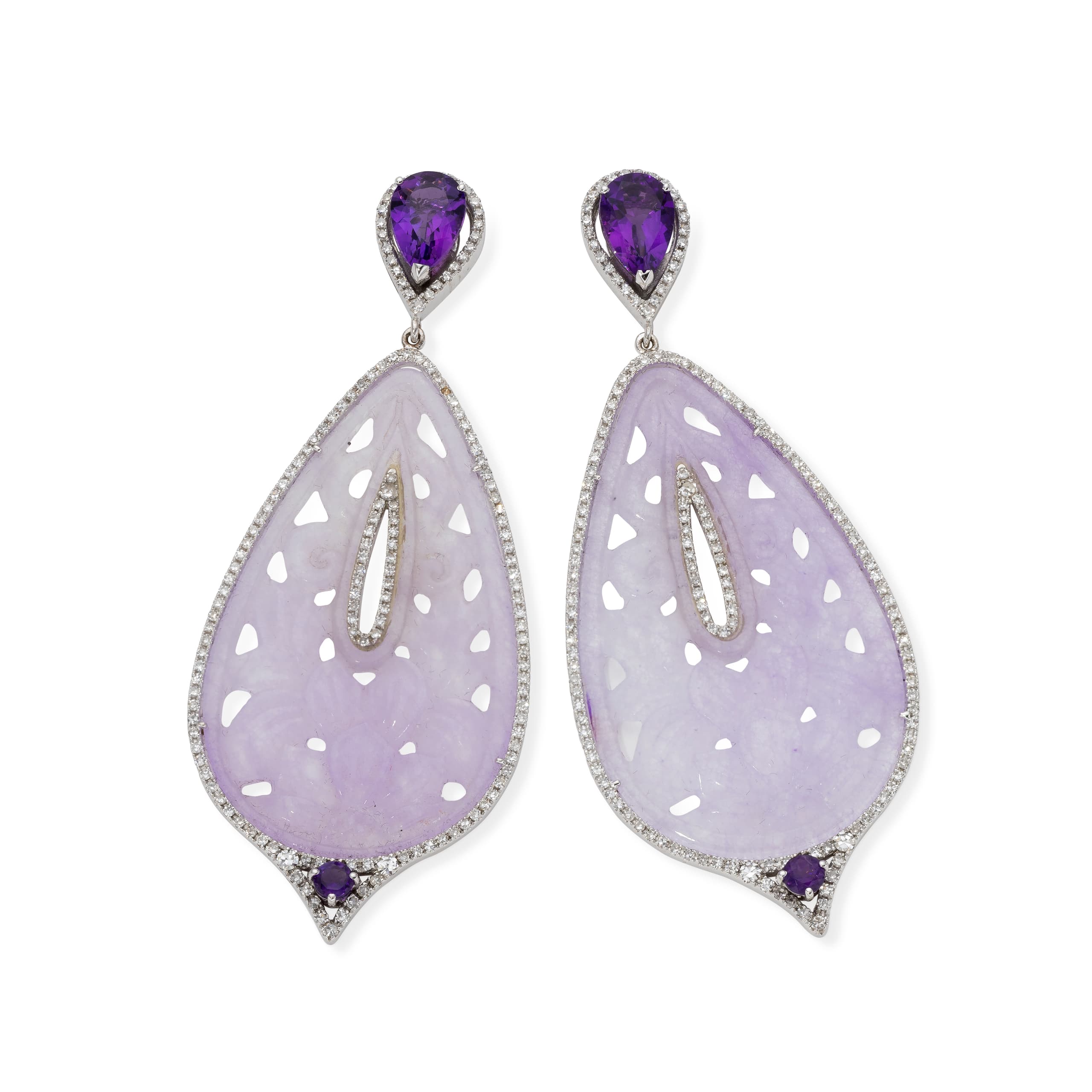 pair of pendant earrings made in 18k white gold adorned with engraved purple jade and set with purple sapphires weighing approximately 3 ct. and brilliant-cut diamonds weighing 0.5 ct.