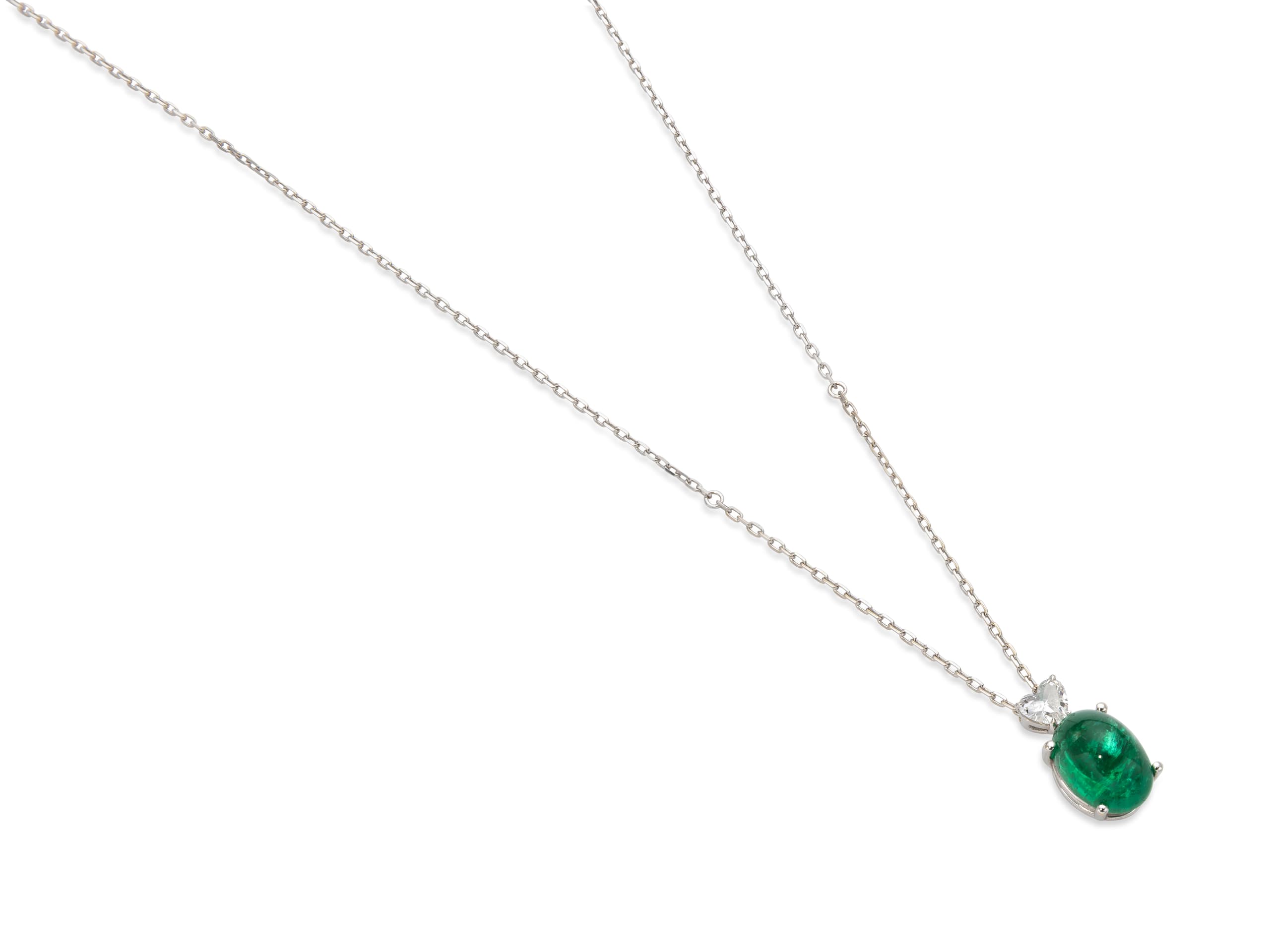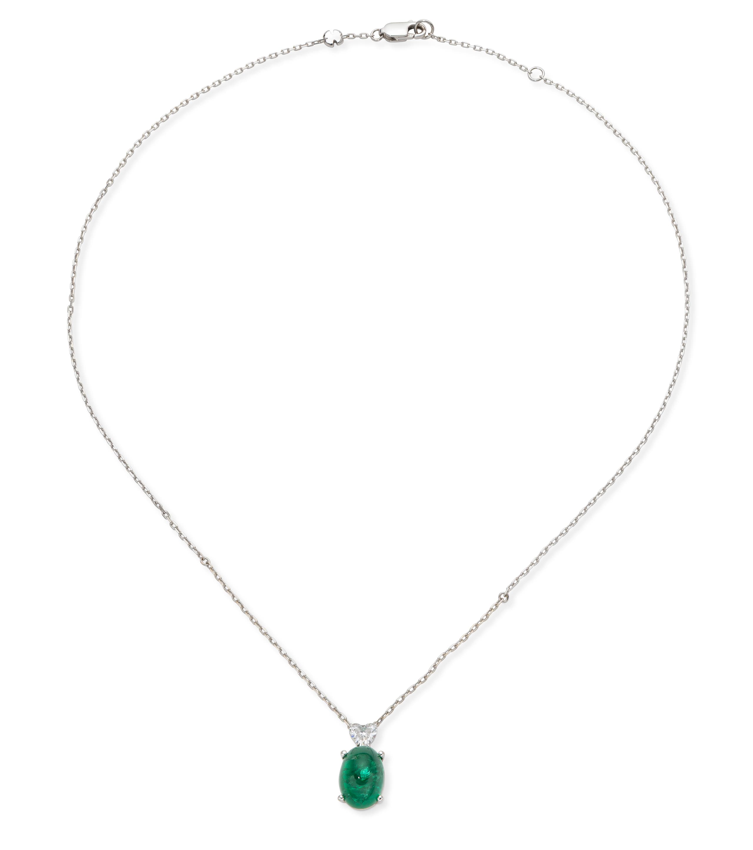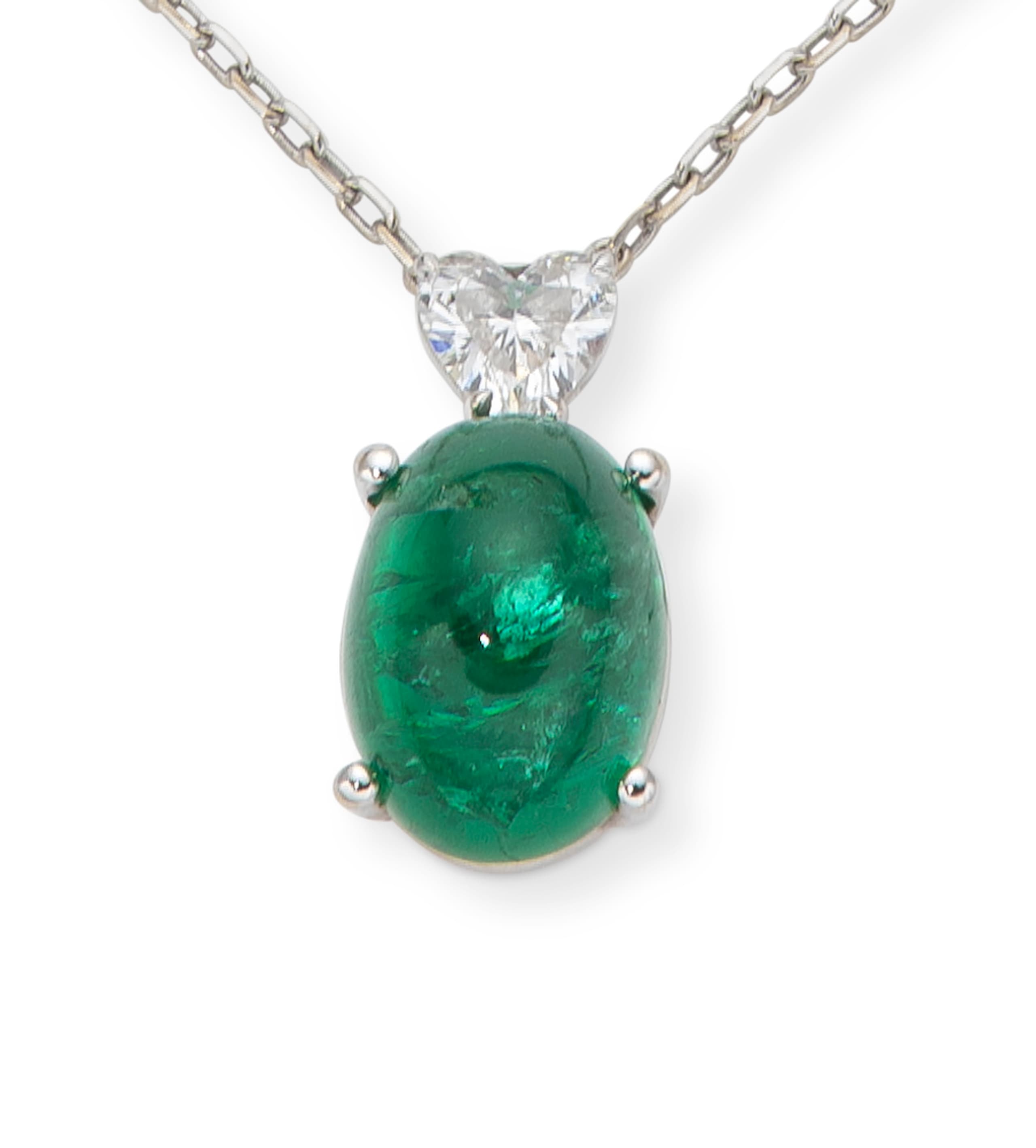 necklace made in 18k white gold holding a pendant set with a cabochon of emerald weighing 3.64 ct. enhanced with heart-shape diamond weighing 0.20 ct.