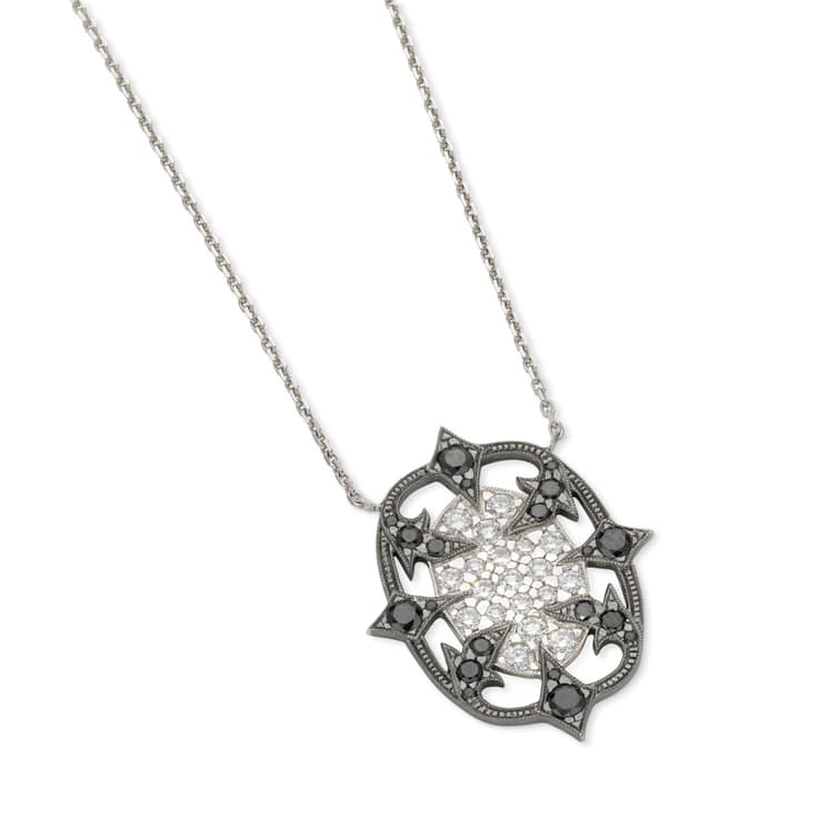 18k white and black gold necklace with a snowflake-shaped pendant paved with black and white brilliant-cut diamonds weighing approximately 0.60 ct. L. approximately 40 cm gross weight : 6.28 gr.