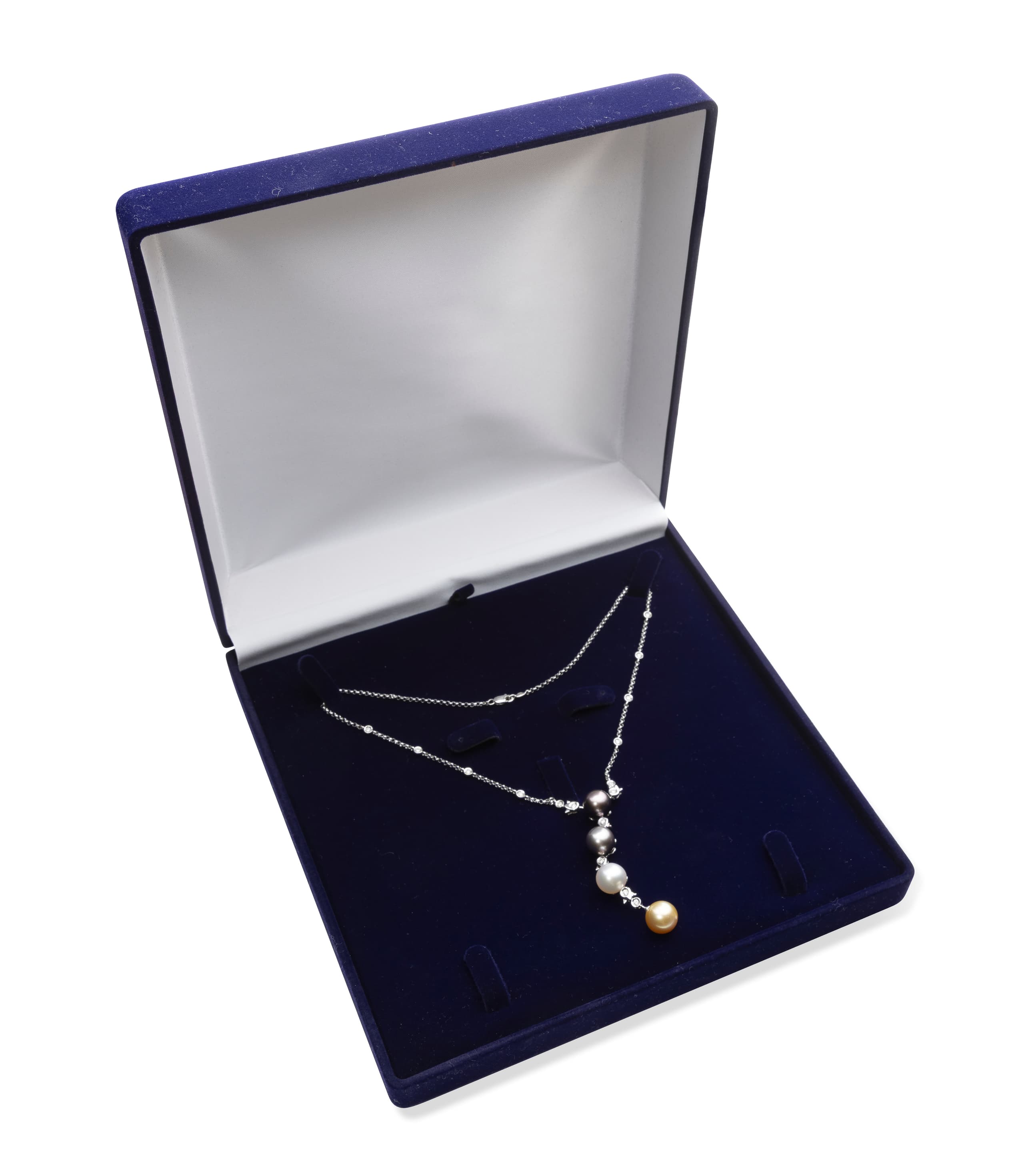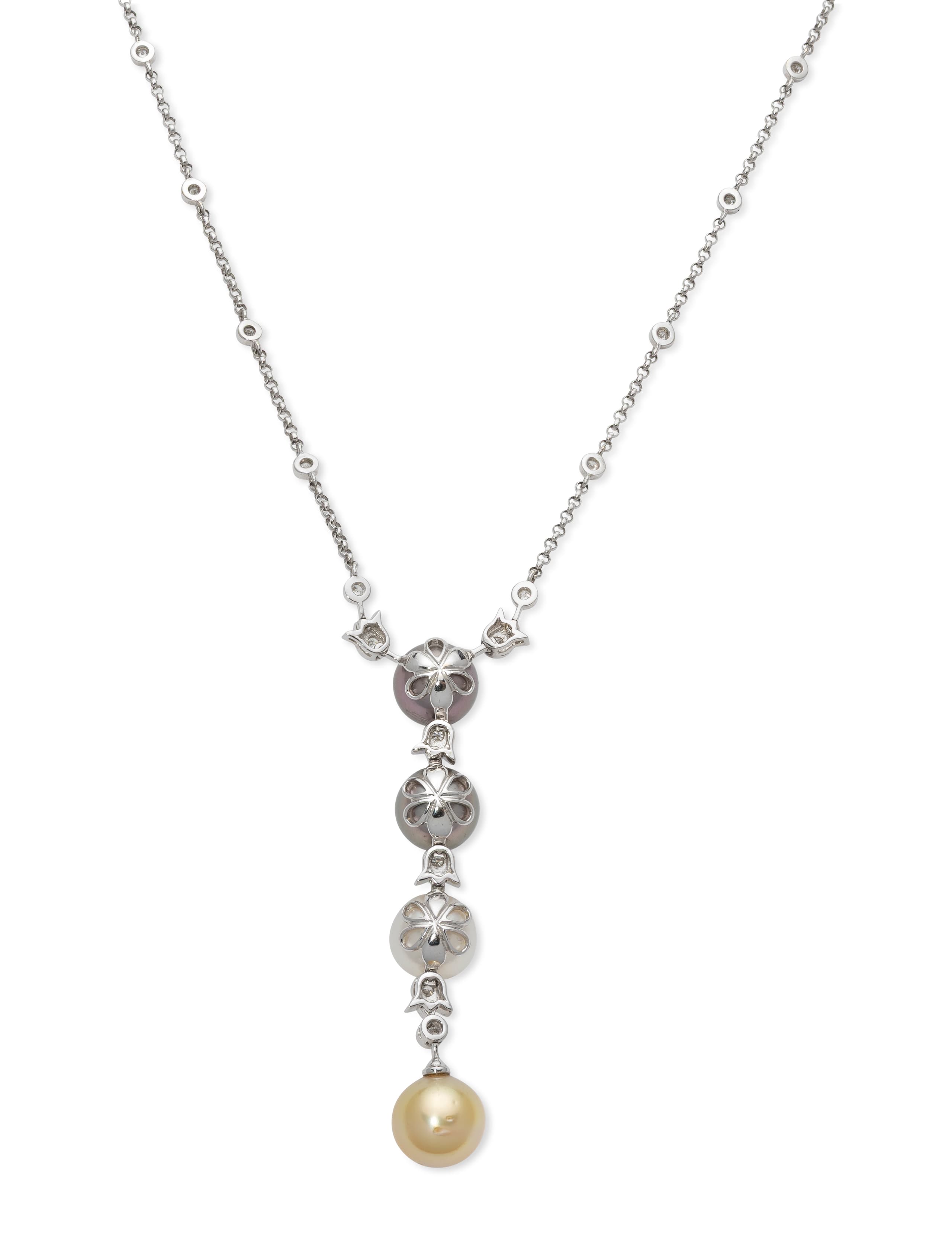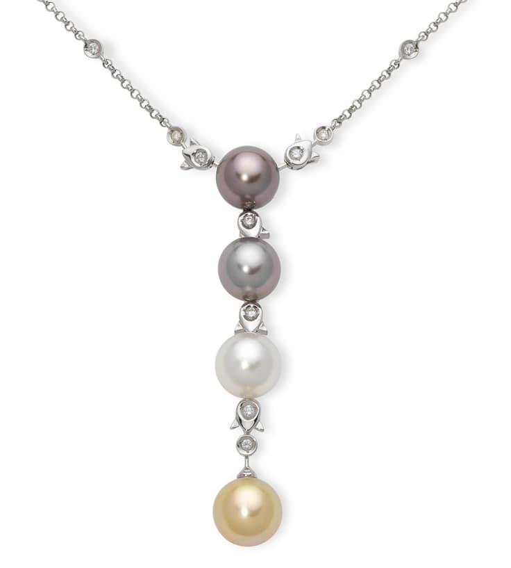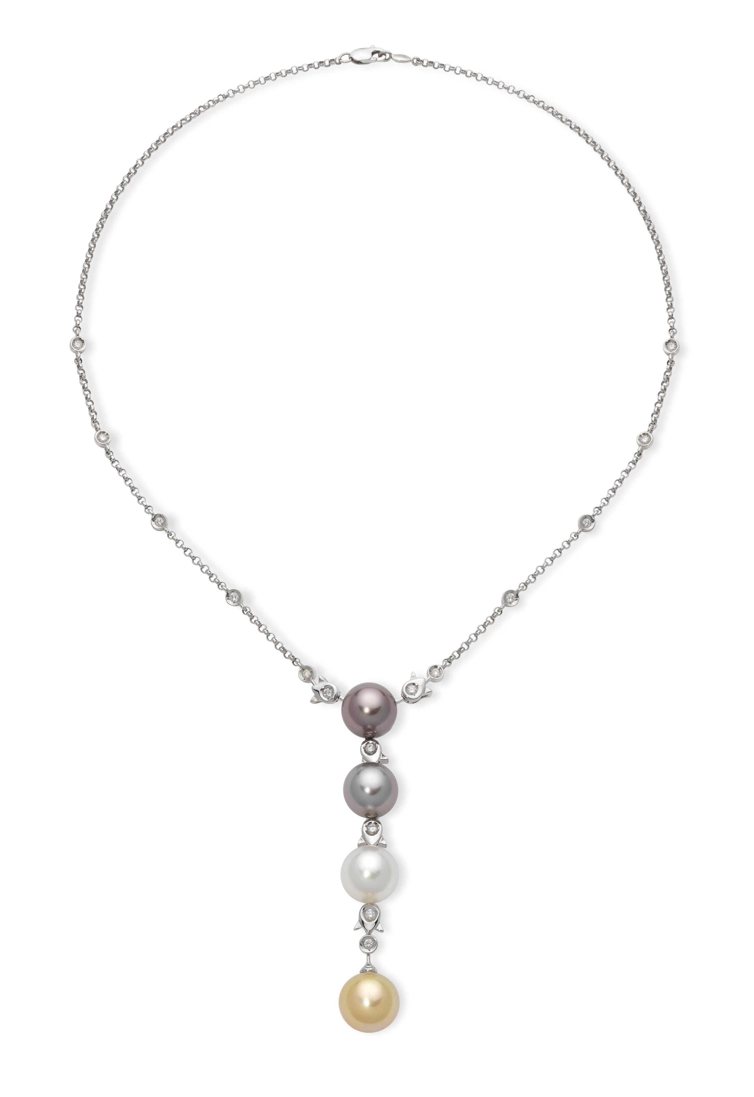 necklace made in 18k white gold holding four cultured pearls gold, grey, white, plum measuring approximately 10 to 11 mm and ponctuated with brilliant-cut diamonds weighing approximately 0.65 ct.
