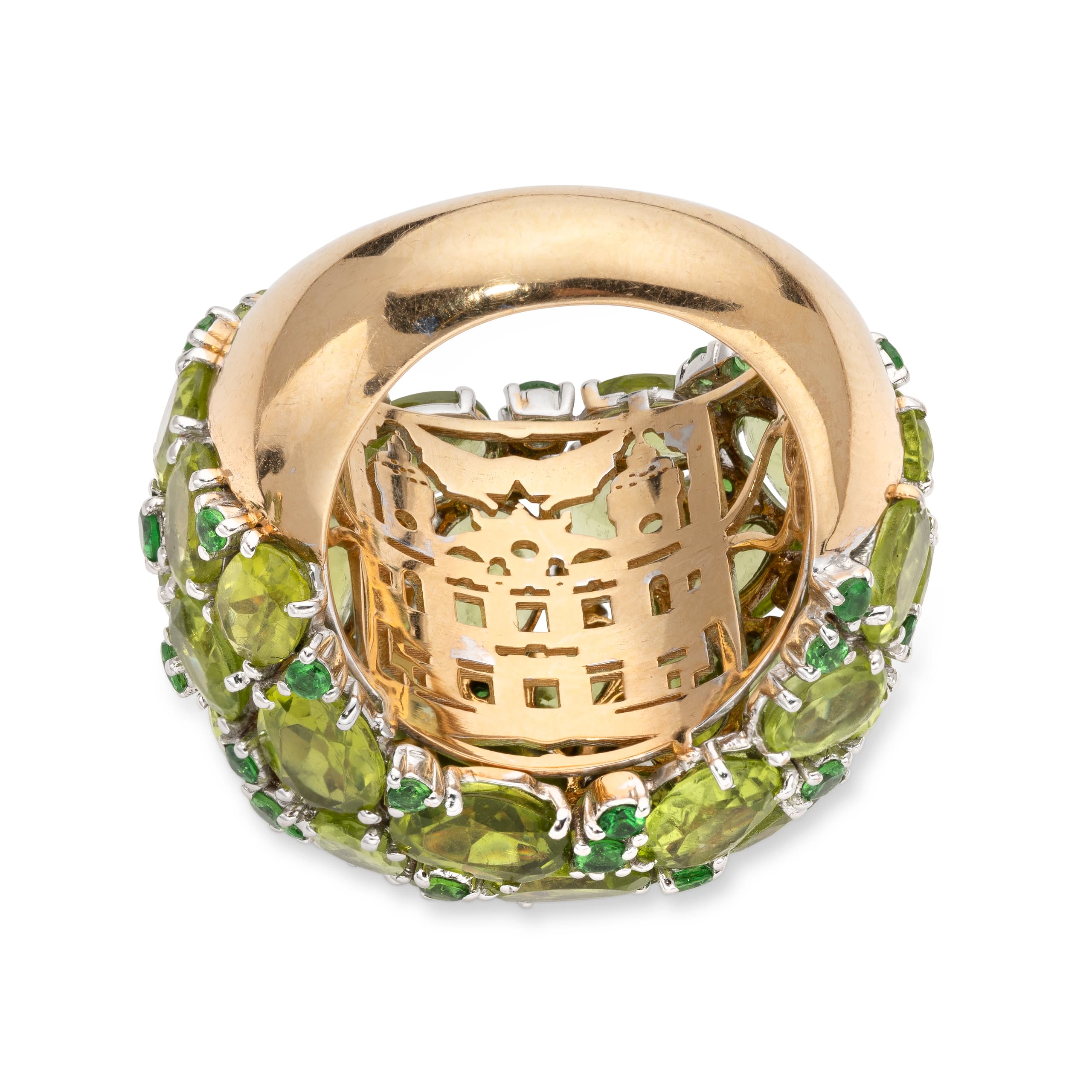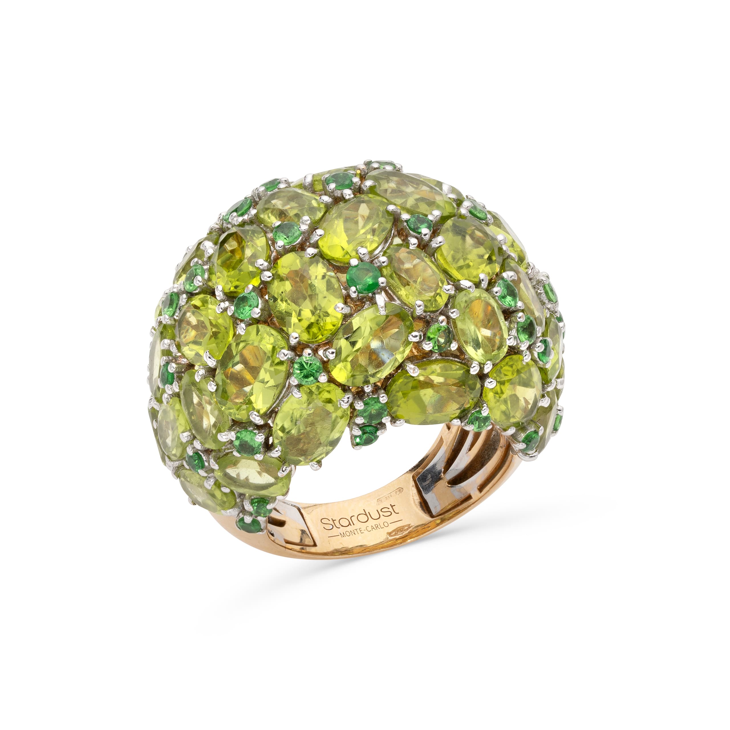 cocktail ring made in 18k yellow gold paved with peridots weighing approximately 4 ct. and ponctuated with emeralds weighing approximately 0.6 ct.