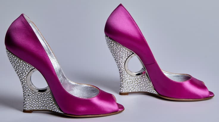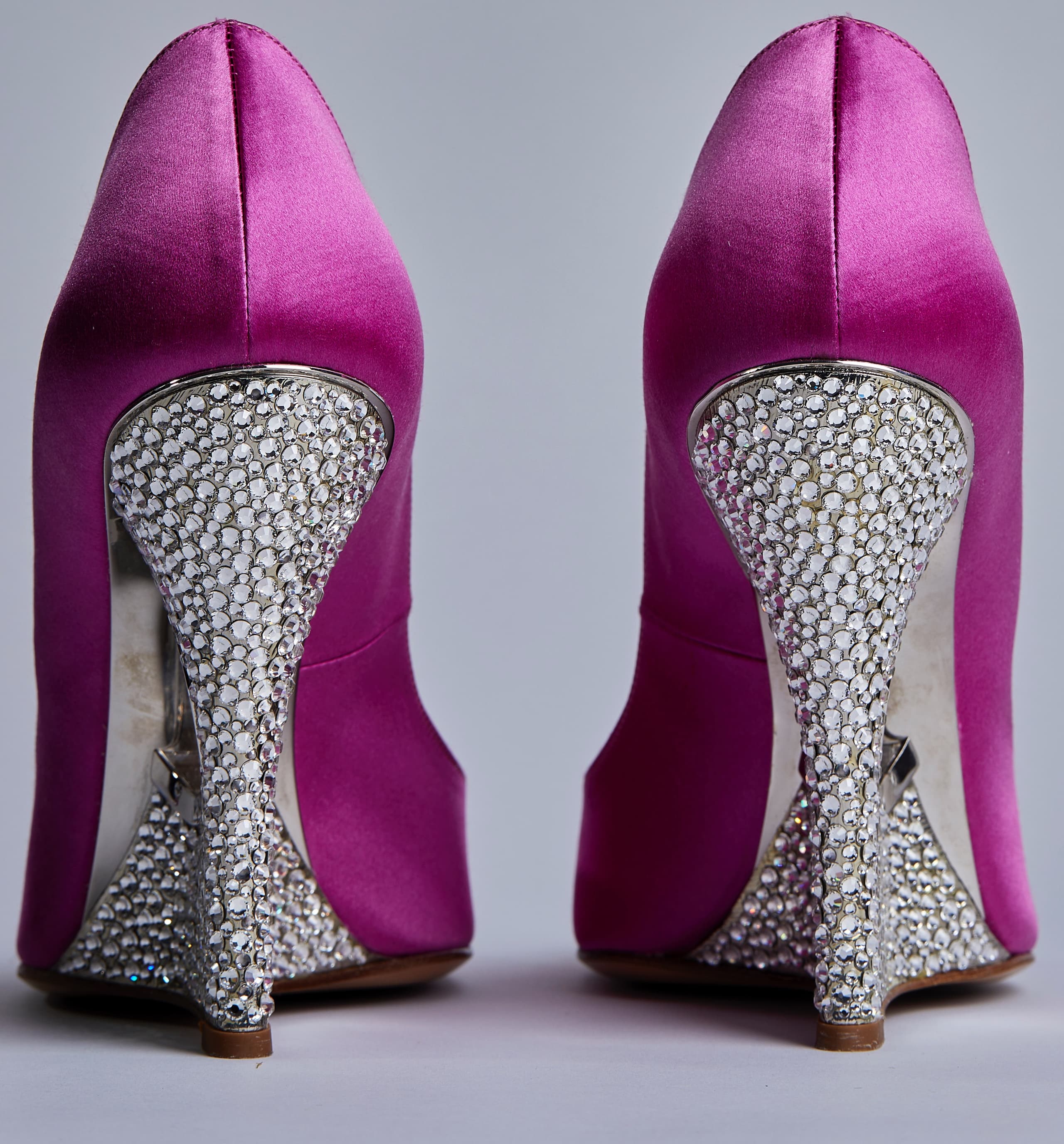 CASADEI FUCHSIA SATIN PUMPS WITH CRYSTAL HEELS
