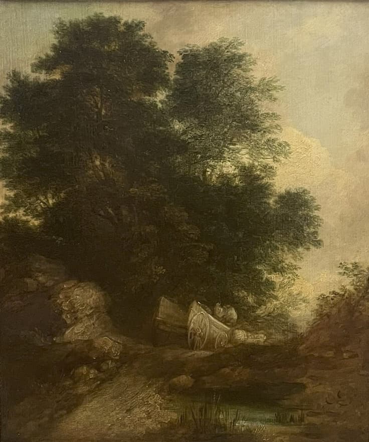 Gainsborough also often turned to the works of seventeenth-century Dutch landscape painters for inspiration, particularly the works of Pieter Molijn (1595–1661), whose paintings were included in Gainsborough’s personal collection. The present work appears to have been inspired by a composition attributed to Molijn. Massive trees dominate the left side of the canvas, while the composition opens to a receding landscape at right—an arrangement that Gainsborough expanded in the final exhibited version by filling both sides and the upper portion of the canvas with dense, textured foliage. The result evokes the brooding grandeur of Jacob van Ruisdael, another Dutch master whose influence is evident in the dramatic treatment of light and shadow.