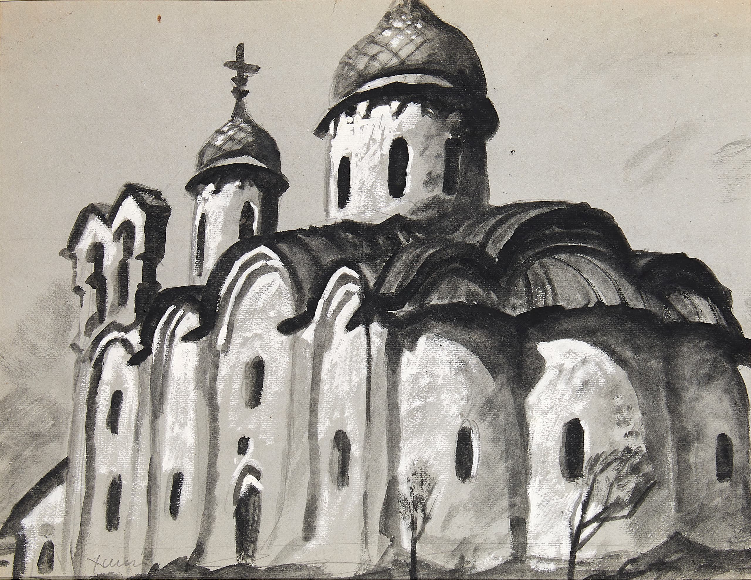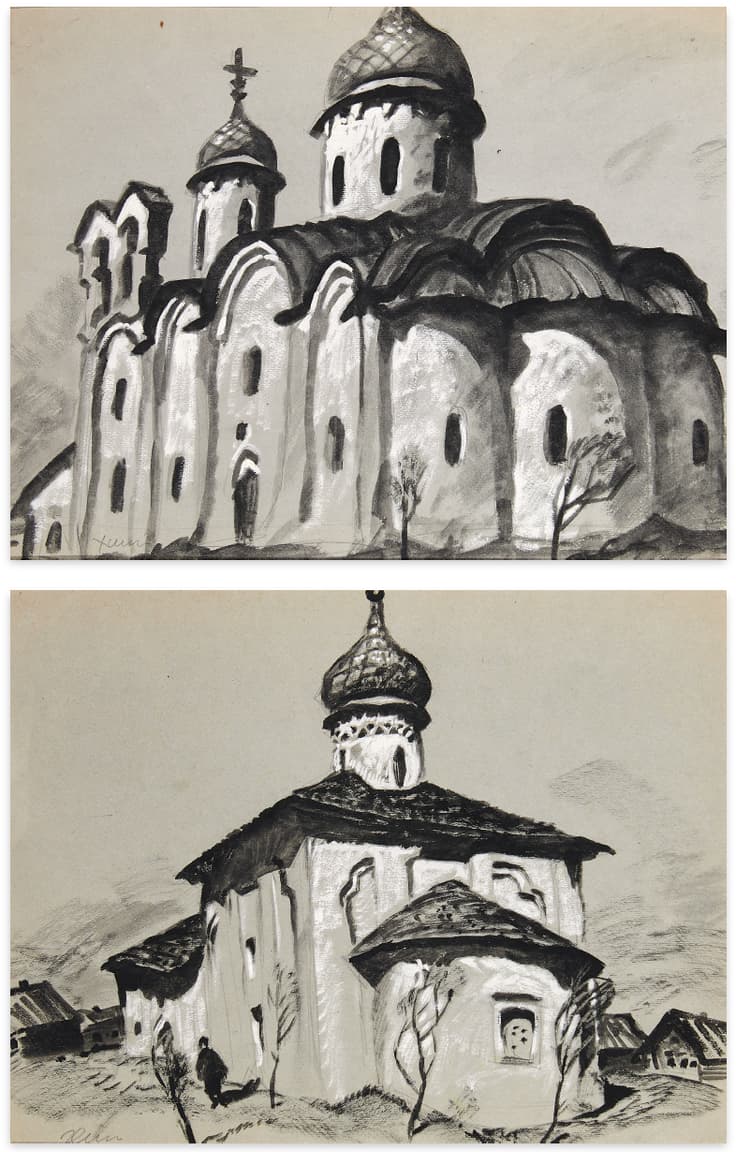 YURI KHYMYCH (1928–2003 Diptych: Cathedral of Ivanovsky Monastery In Pskov and Church Of St. Nicholas. Pskov, 1970