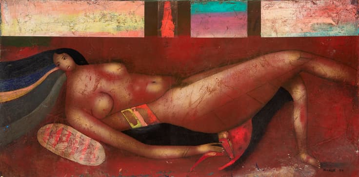 signed and dated ‘Makar 94’ (lower right), titled ‘No 5 Nue couché au fenêtre’ (on the frame) (sur le chassis)