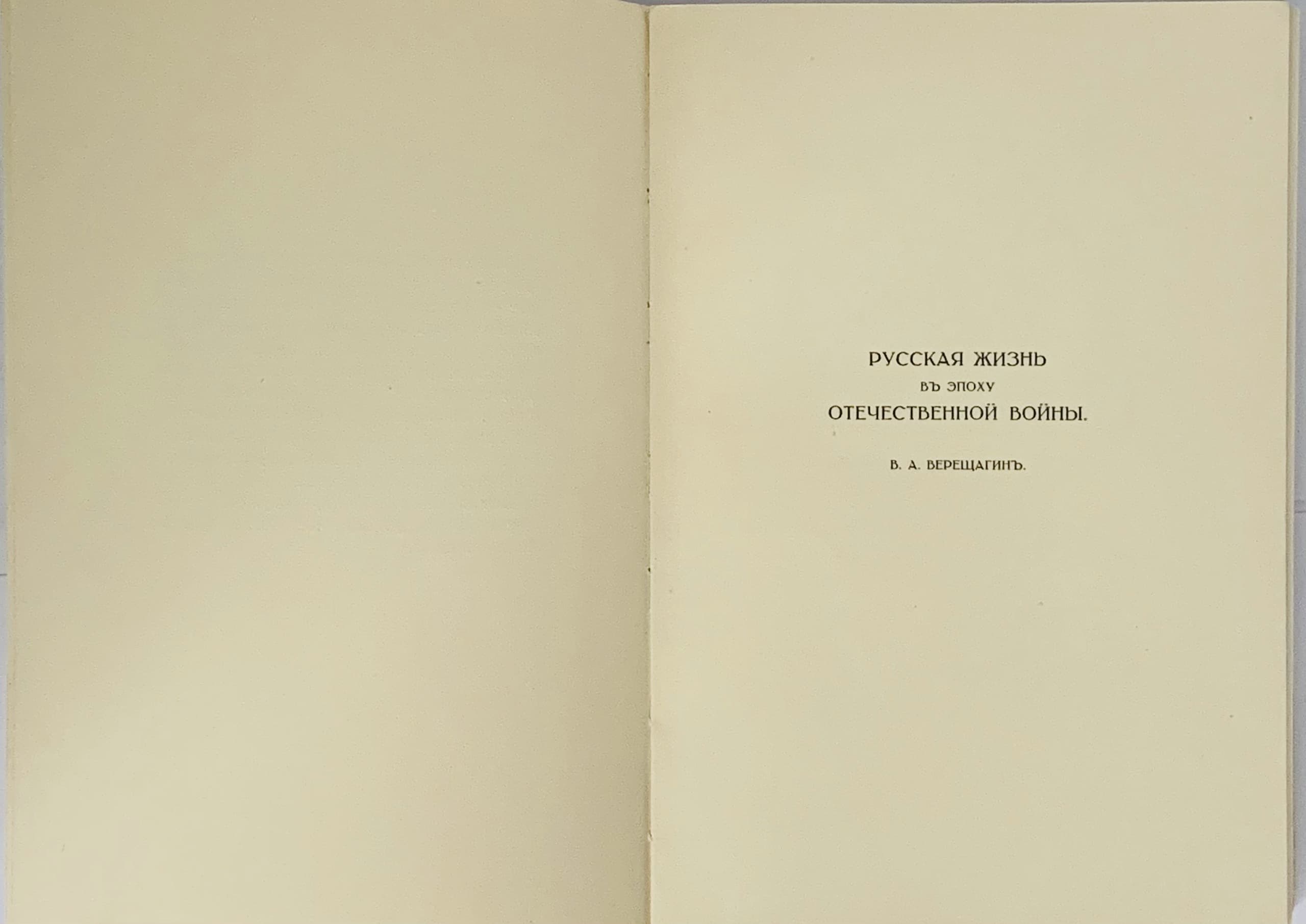 Published on the occasion of the centenary of the Patriotic War of 1812, this edition is a catalogue of graphic works. The book opens with a historical essay by V.A. Vereshchagin, ‘Russkaya zhizn’ v epokhu Otechestvennoy voyny’ [‘Russian Life During the Era of the Patriotic War.’]