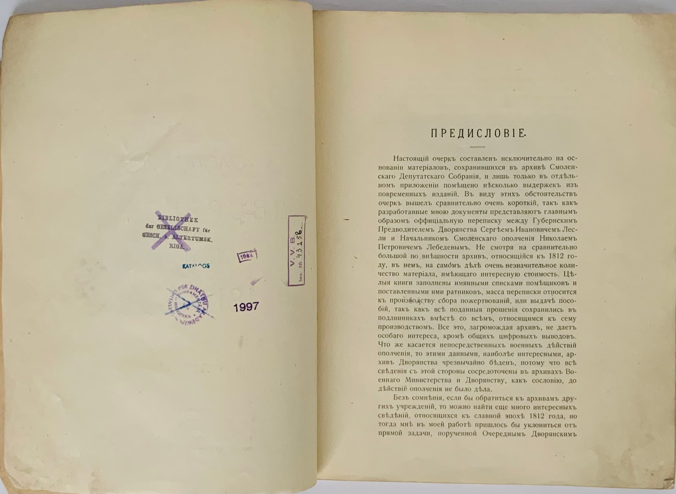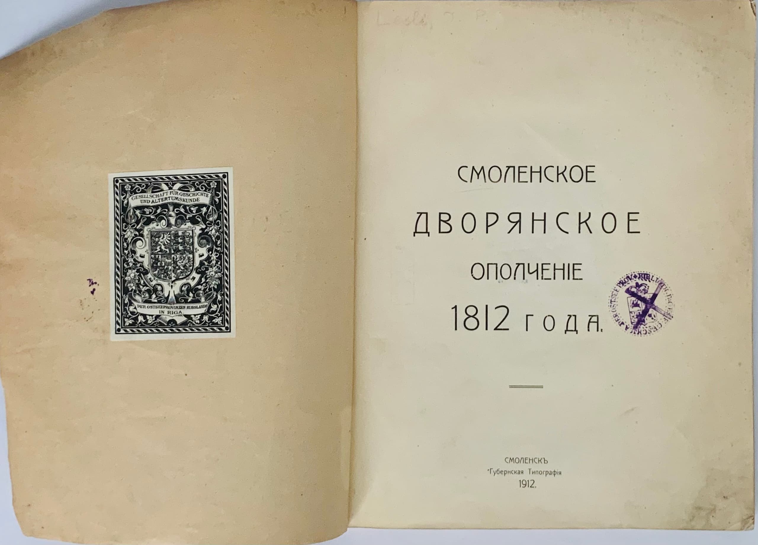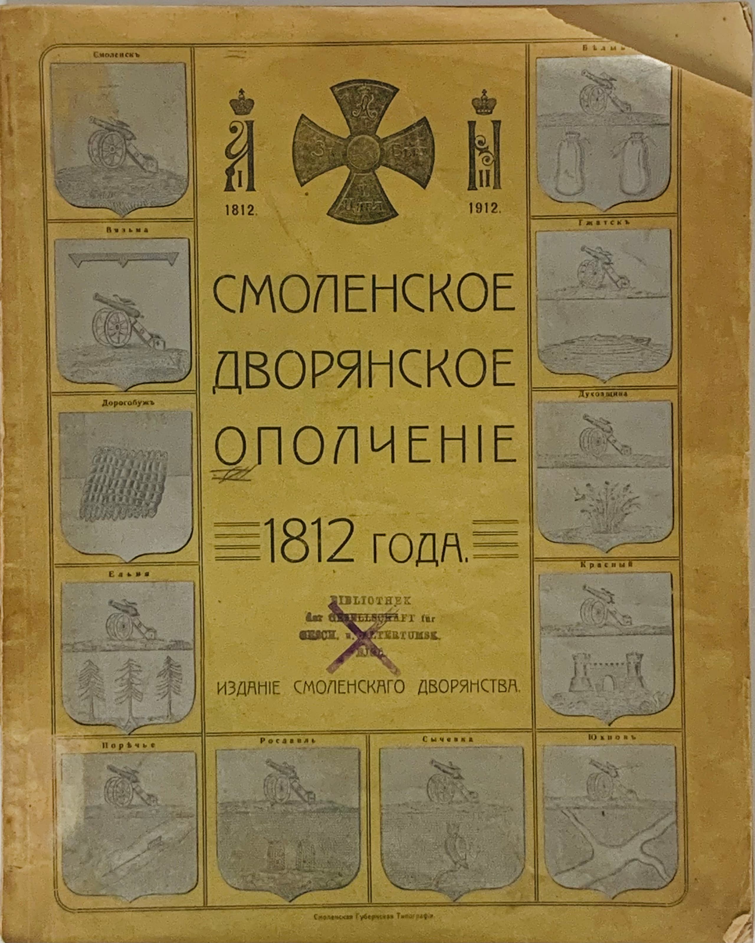 Original illustrated publisher’s cover featuring twelve coats of arms of the towns of the Smolensk province. Spine tears, loss to upper corner of front wrapper, minor soiling. Cancelled stamps of the Riga Library. Armorial ex-libris to verso of front cover.