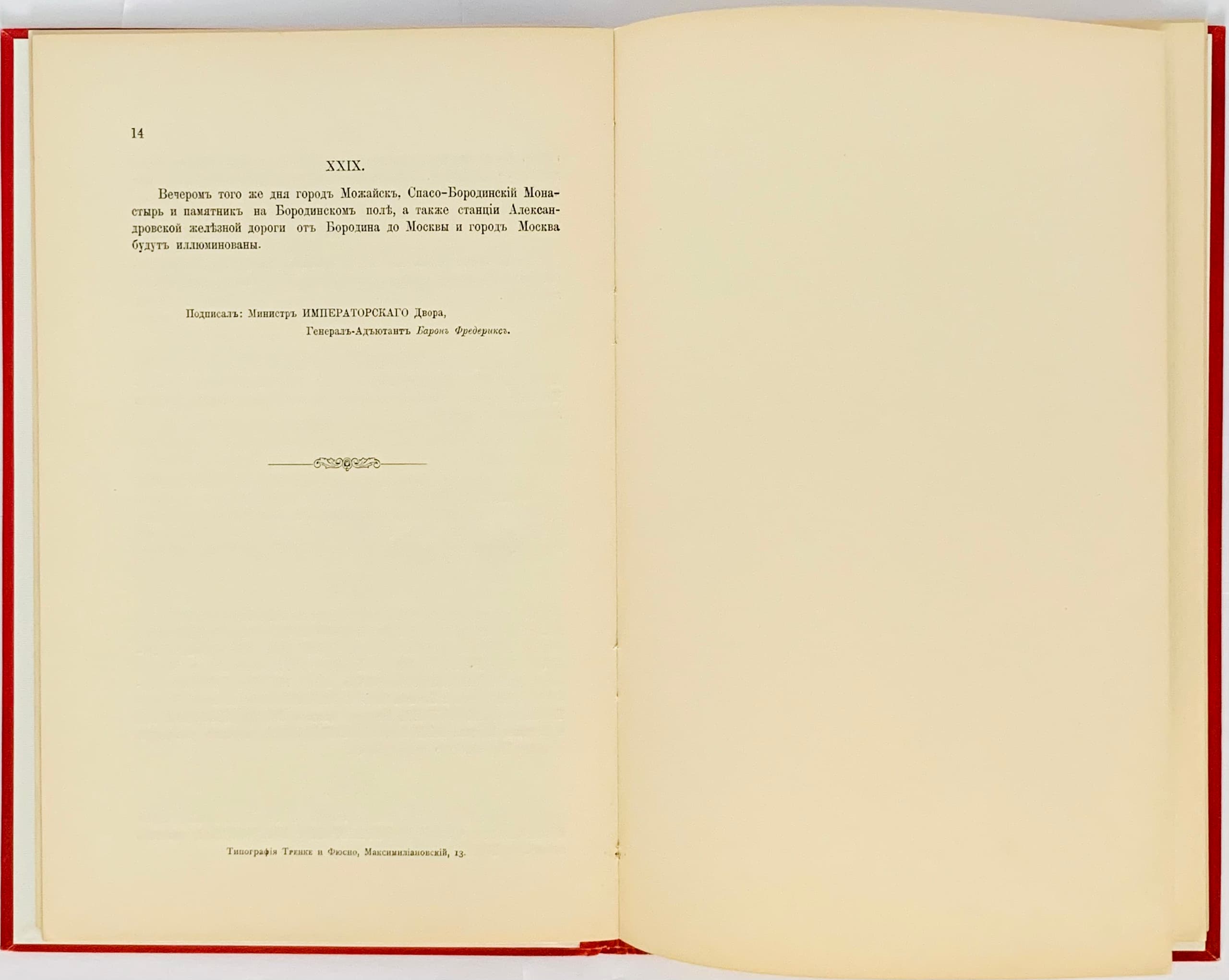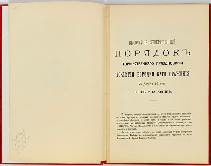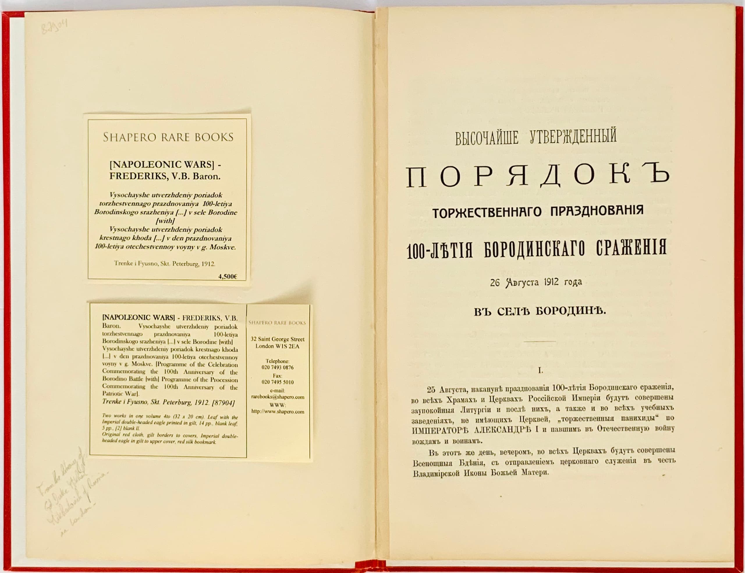 MIKHAIL MIKHAILOVICH (1861-1929), Grand Duke ‘Vysochaishe utverzhdyonnyy poryadok torgestvennogo torzhestva 100-letiya Borodinskogo srazheniya 26 avgusta 1912 goda v derevne Borodino; Vysochaishe utverzhdyonnyy poryadok shestviya iz Uspenskogo sobora na Krasnuyu ploshchad 30 avgusta 1912 goda, v den’ prazdnovaniya 100-letiya Otechestvennoy voyny v Moskve.’ [The highest approved order for the solemn celebration of the 100th anniversary of the Battle of Borodino on 26 August 1912 in the village of Borodino; Highly approved order of the procession from the Assumption Cathedral to Red Square on 30 August 1912, on the day of the celebration of the 100th anniversary of the Patriotic War in Moscow.] [St. Petersburg]; tip. Trenke and Fysno, [1912].