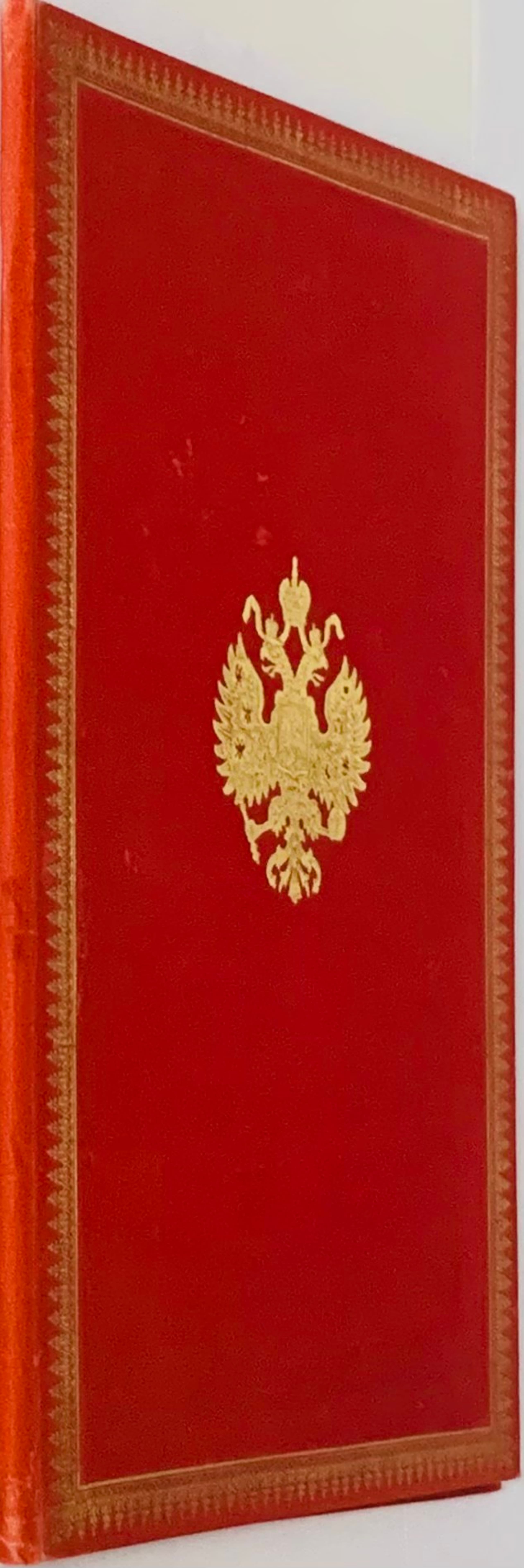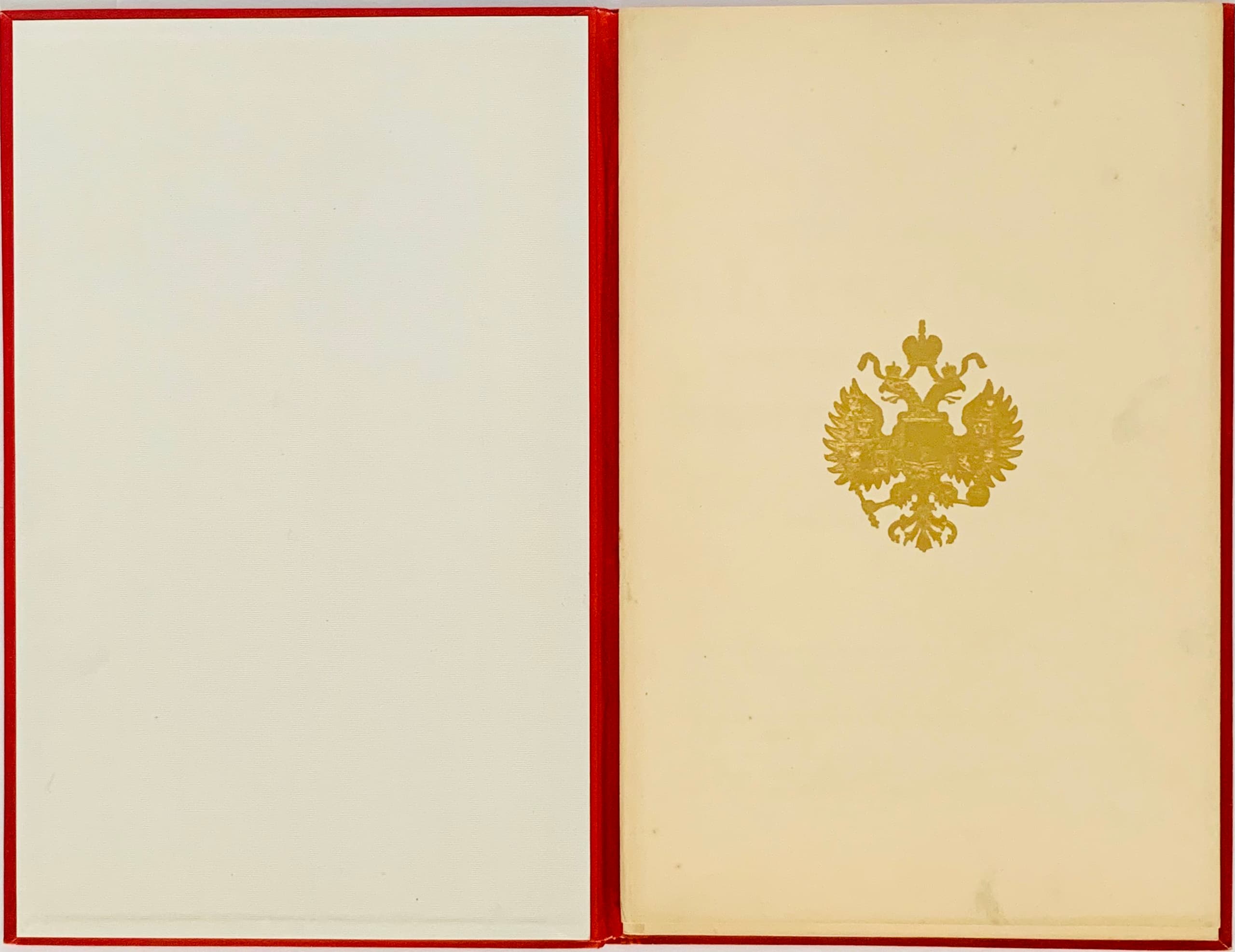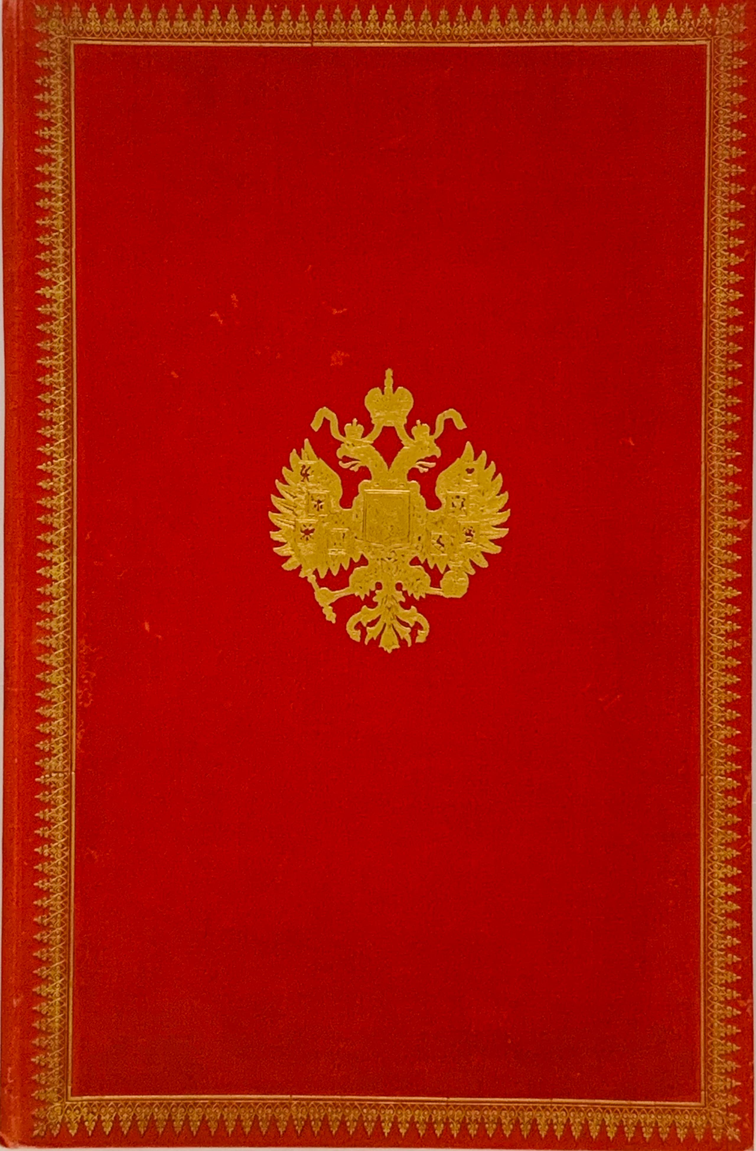 Red full leather binding of the period, gold embossed coat of arms of the Russian Empire on the upper cover, ornamental frame along the edge, endpapers made of moiré-imitation paper. On the first flyleaf, a gold-embossed coat of arms of the Russian Empire.