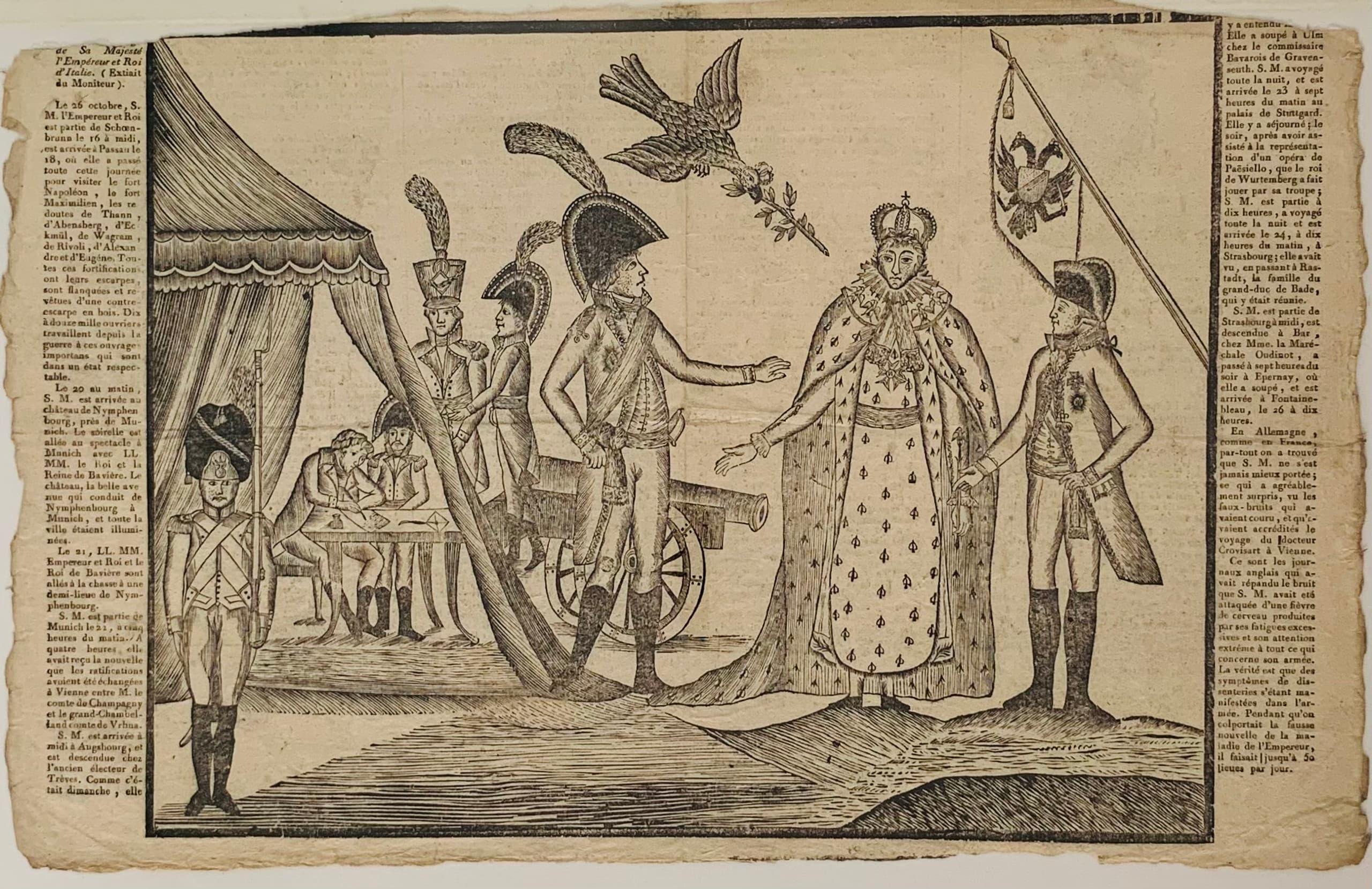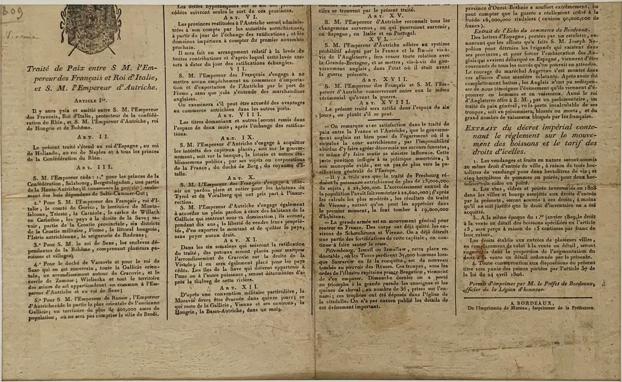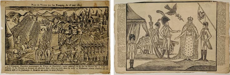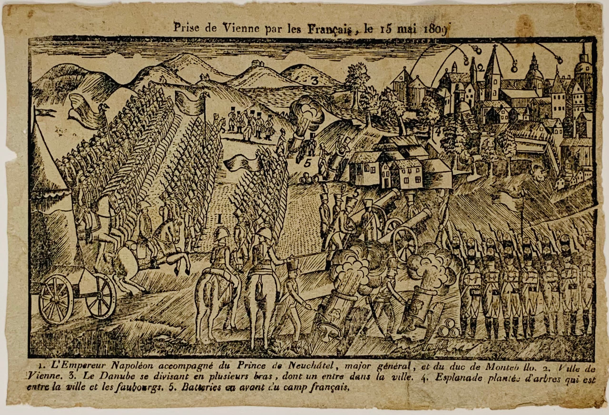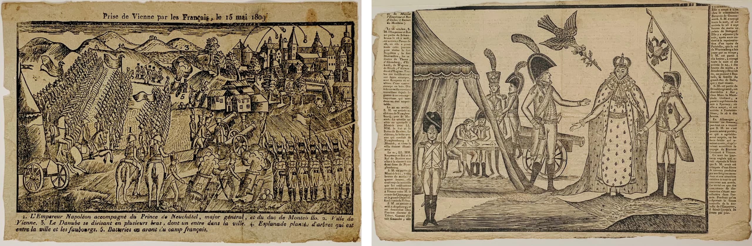 i) Prise de Vienne par les Français, le 15 mai 1809 [capture of Vienna by the French, 15 may 1809] engraving on paper dimension ? ii) Vienna treaty Peace treaty between H.M. the Emperor of France and H.M. the Emperor of Austria inscribed: 'A Bordeaux / de L'imprimerie de Moreau, Imprimeur de la Préfecture' engraving on paper with the text of the treaty on the reverse 25 x 23 cm PROVENANCE: Collection of Mr. H.O Valensi