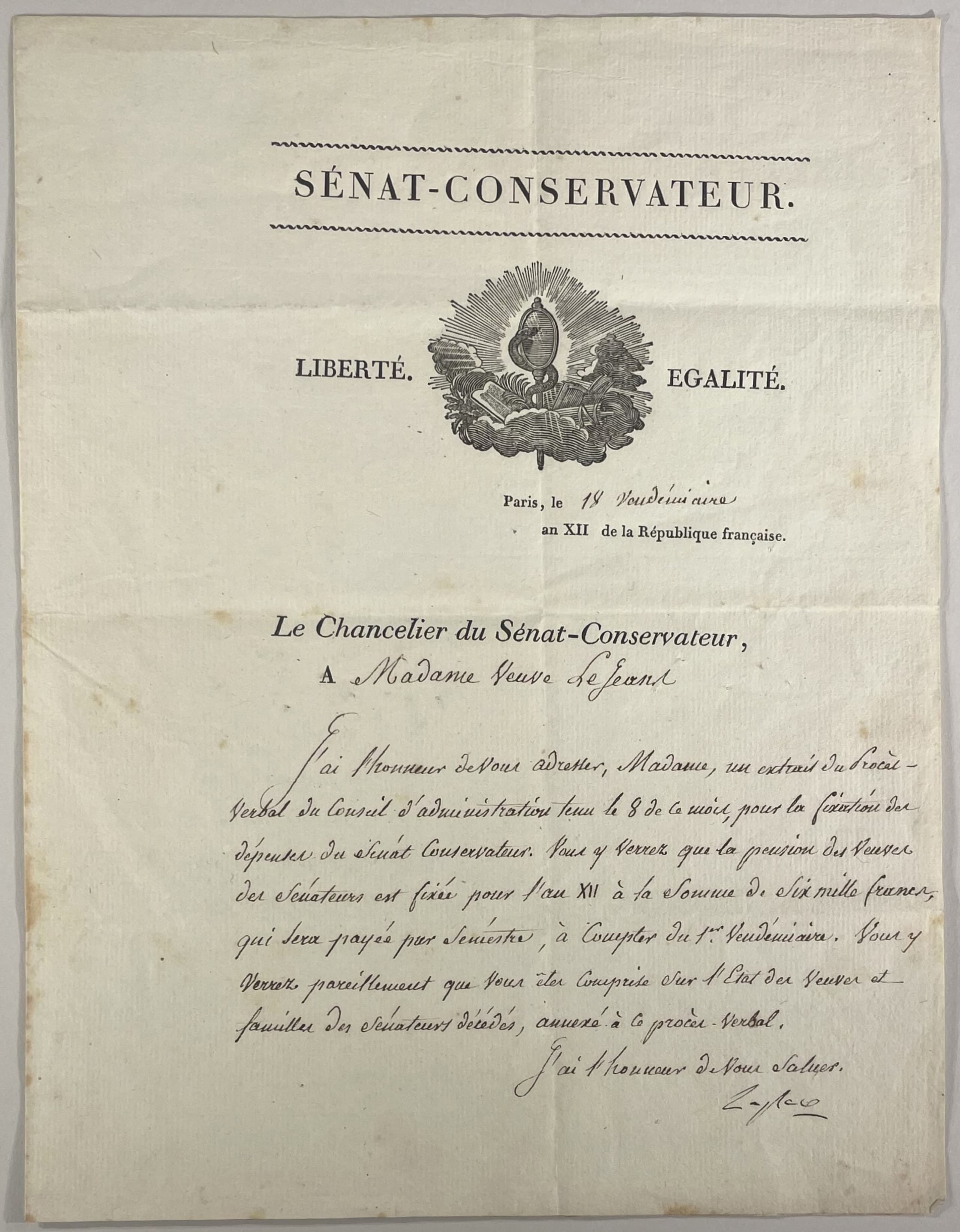 1 p. in-4 on ‘Sénat-Conservateur’ headed paper, traces of folds inherent in the sending.