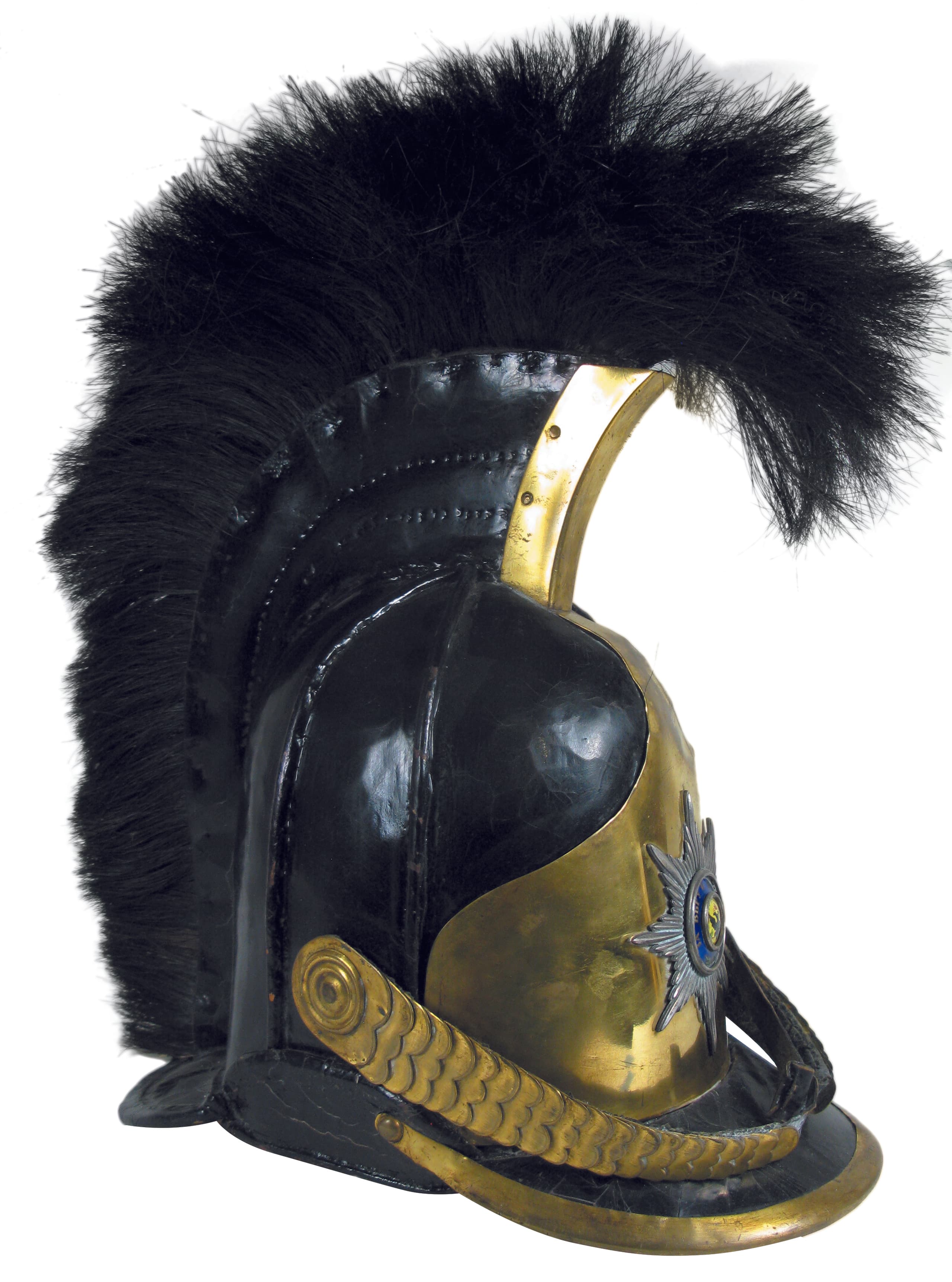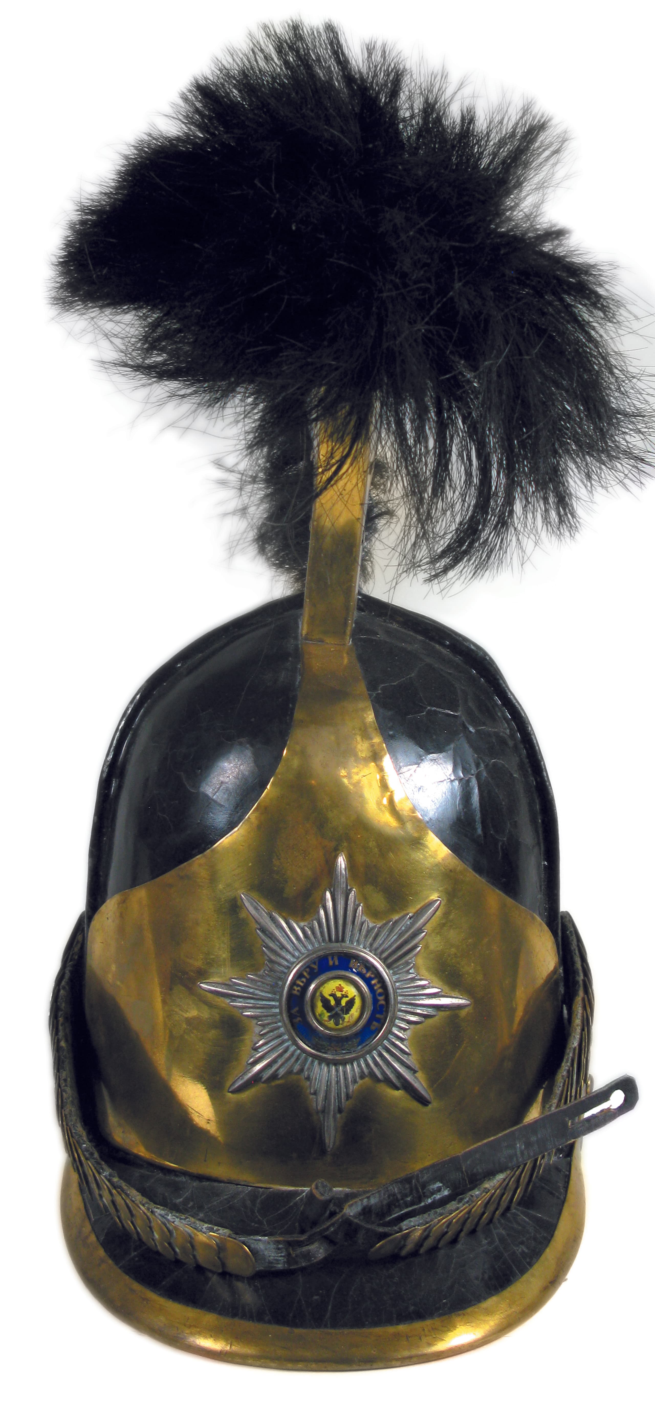 Model 1808 Russian Life-Guards cuirassier officer's helmet of black leather with two leather reinforcing bars on each side, with upright black horsehair crest, a large reddish-copper brass plate extending upwards to the edge on the front of the comb with silvered enameled star of the order of St. Andrew the First Called with yellow painted center. A black leather chinstrap covered with brass chinscale. Front and back visors of black leather with front having brass edge.