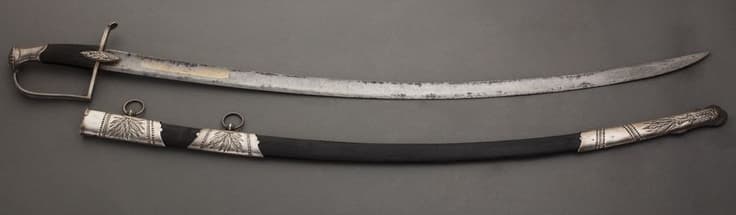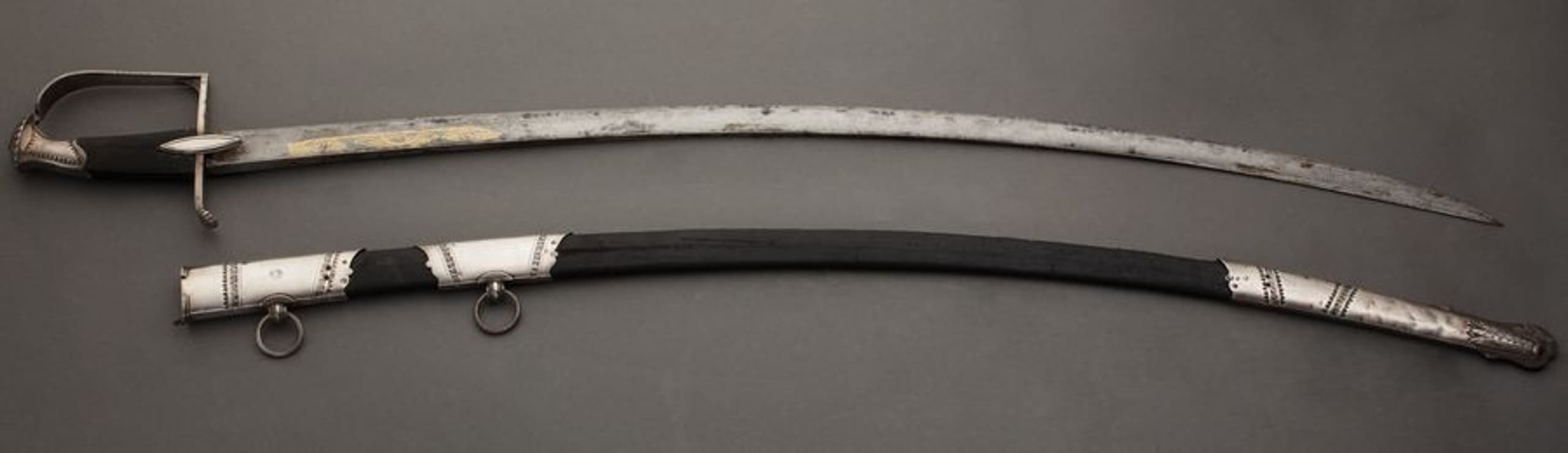 Overall length - 96.8 cm; blade length - 81.9 cm; the width of blade heel- 2.9 cm. The Damascus steel blade is curved, single-edged, with one broad fuller; Combat double-edged point. The blade on both sides is decorated with a cartouche with an oriental ornament; filled with gold. The hilt consists of a wooden grooved handle and a silver guard. At the top of the handle there is a silver sleeve, turning into an extended oval head with a button, decorated with diverging grooves in the form of melon slices and a floral ornament. The cross is decorated with a relief groove around the perimeter. On the head of the handle, in the lower part of the cross, the scabbard is etched with marks: in the form of a male head with numbers 8 and 5, a female head with number 1, denoting the place of production, Paris and the year 1794/97 and in the form of a rooster with number 1, denoting 950 silver sample.