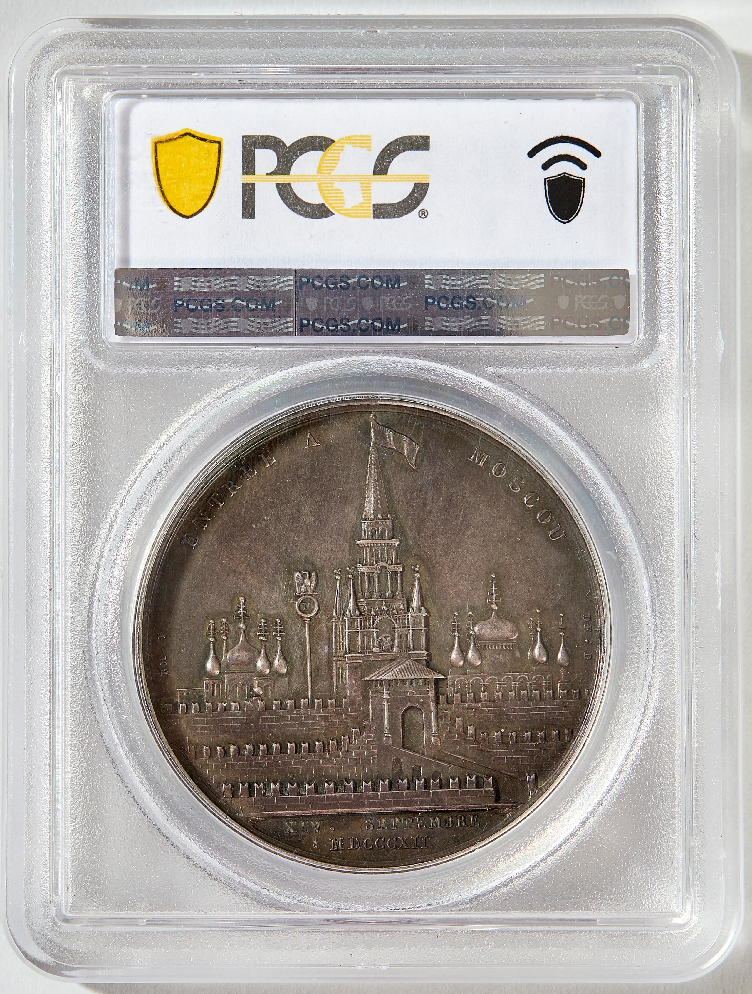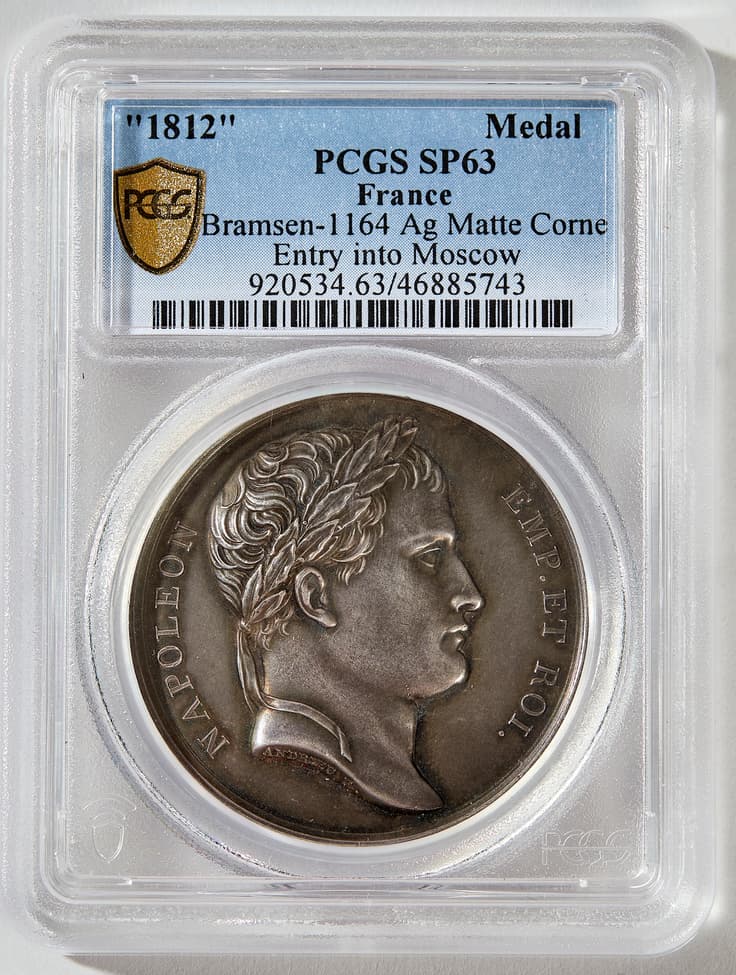 Marked 'Andrieu' obverse: bust of Napoleon I, legend 'Napoleon. Emp. et Roi' reverse: View of Kremlin, with Napoleonic Imperial eagle standard above the walls, legend 'Entree a Moscou', 'IV. Septembre MDCCCXII' PCGS SP63, Bramsen 1164, AG D. 3.4 cm