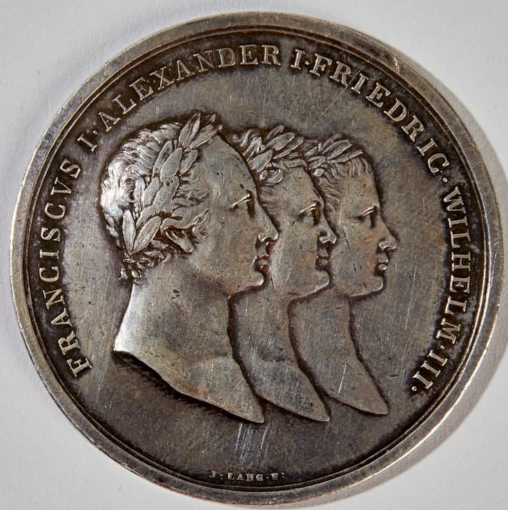 Marked 'J. Lang F' obverse: busts of Francis I of Austria, Alexander I of Russia, and Frederick William III of Prussia reverse: legend in Latin commemorating the alliance and victory over Napoleon. D. 4.5 gross weight: 26.13 gr.