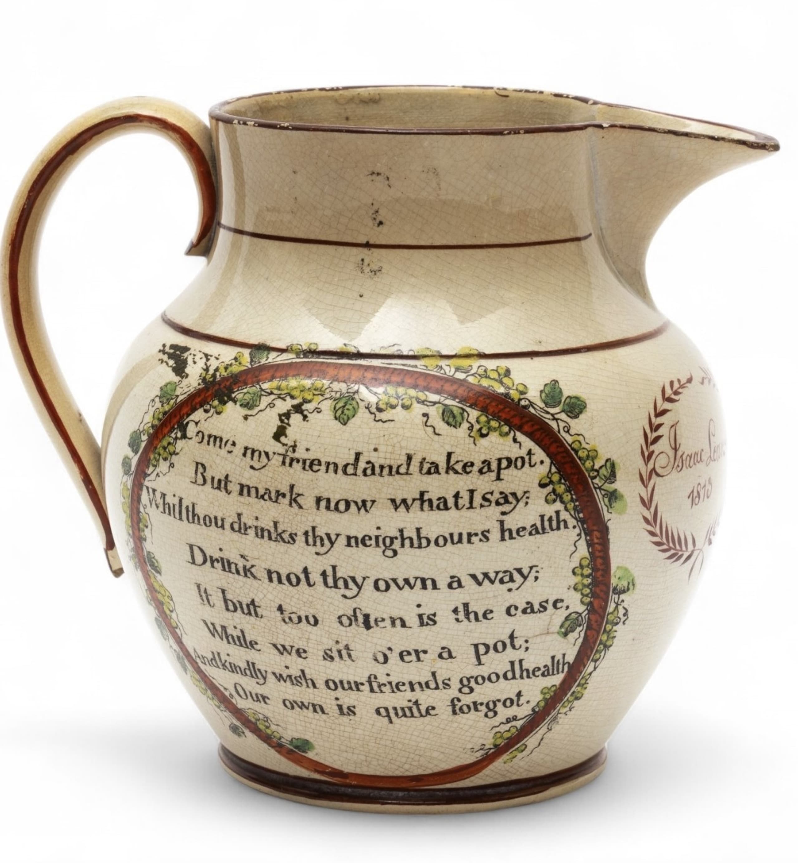 the body with underglaze painted battle scene of Cossacks attacking a French camp. inscribed and dated 'Flight of the French in Russia/Isaac Lear 1813', text of humoristic toast (on the body) creamware, underglaze painting H. 14 cm Condition: overall in good condition, slight signs of use
