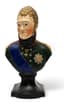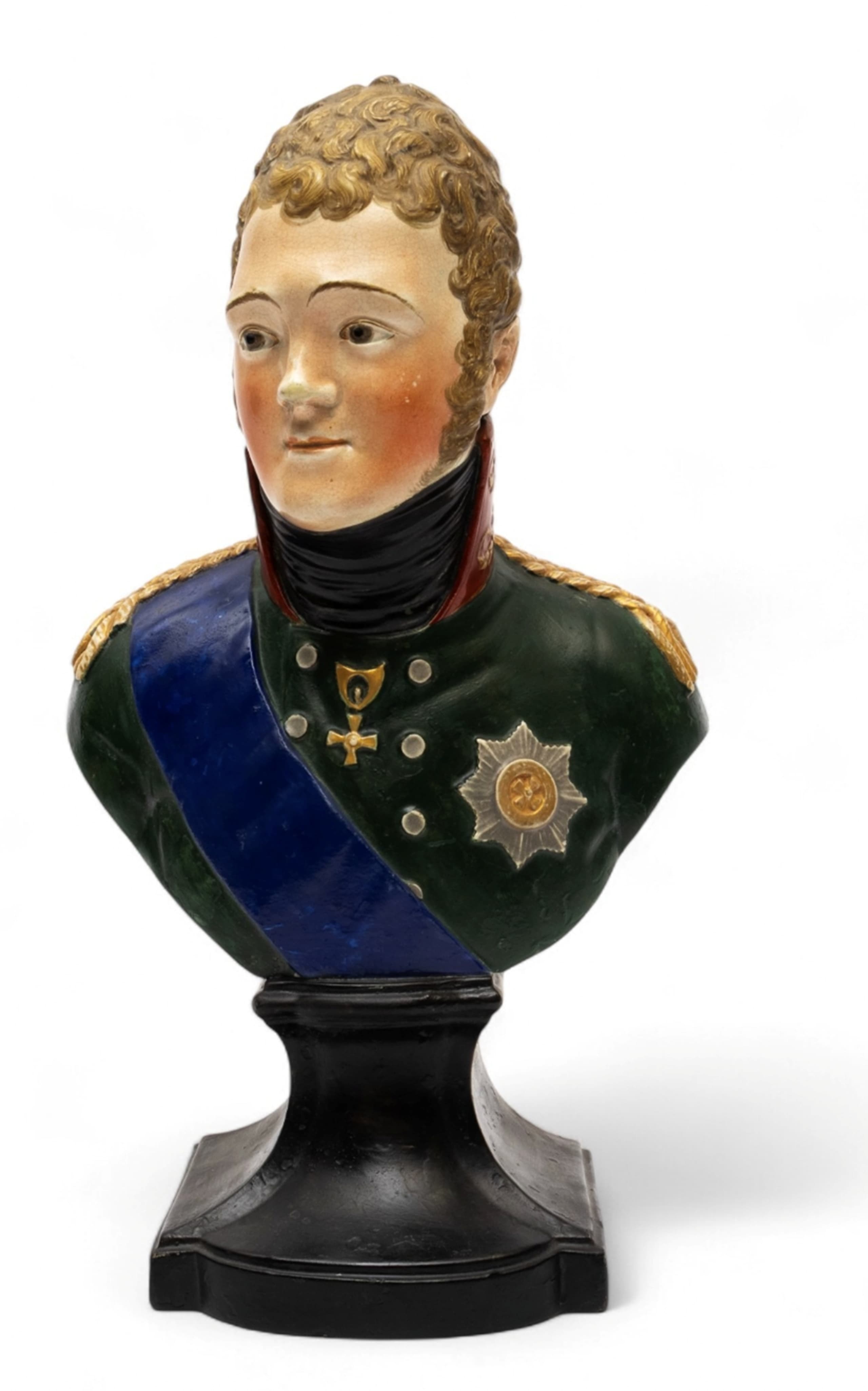pearlware polychrome portrait bust of Emperor Alexander I in military uniform, adorned with the star and ribbon of the Order of the Garter. The pedestal is painted in black to imitate the black marble.