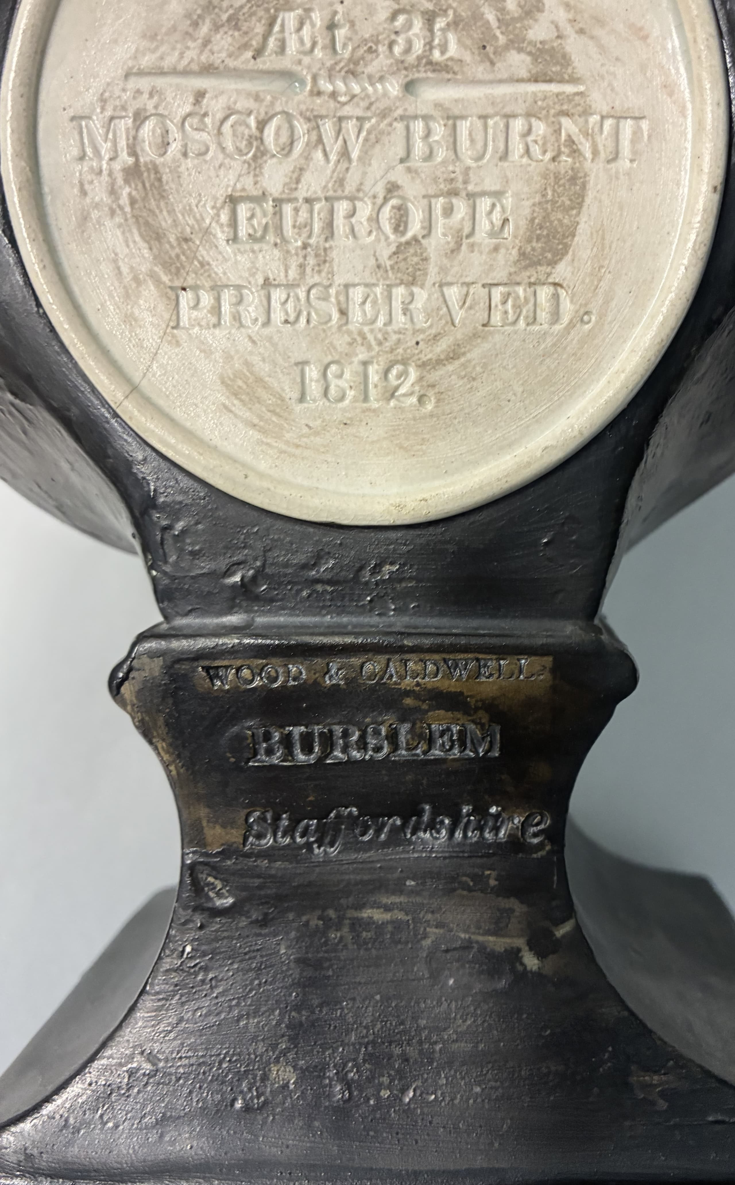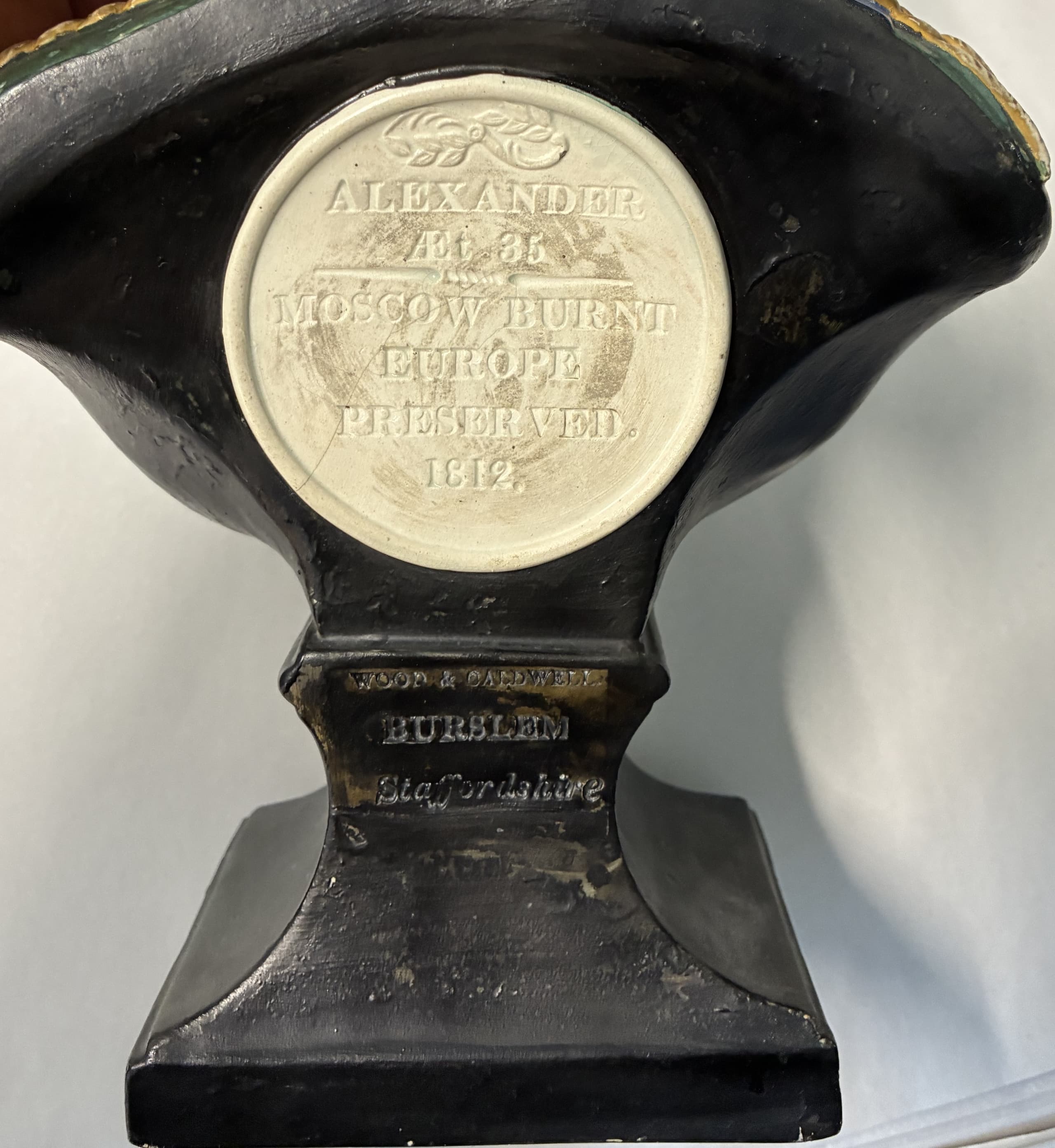 impressed circular plaque 'ALEXANDER/AET.35/MOSCOW BURNT /EUROPE /PRESERVED.1812', impressed mark 'WOOD & CALDWELL/ BURSLEM/ STAFFORDSHIRE' (on the reverse)