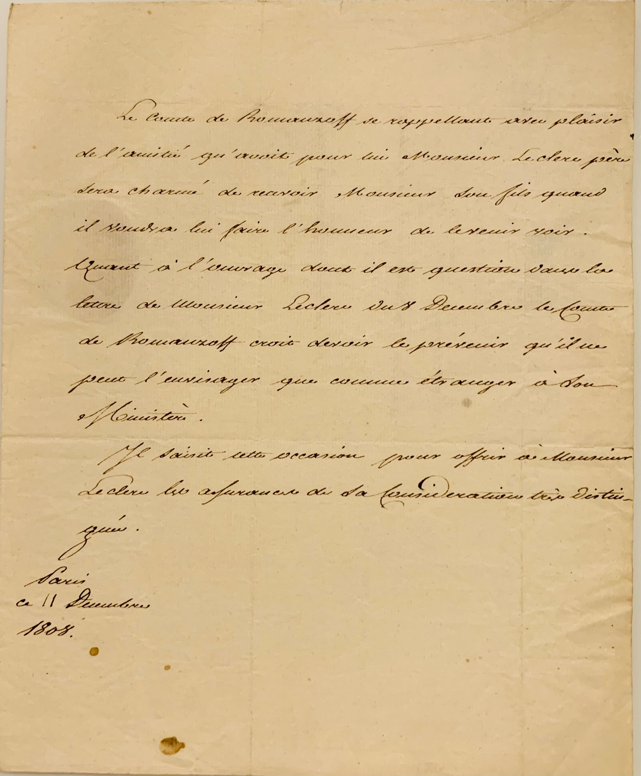 RUMYANTSEV NIKOLAI PETROVICH (1754–1826), Count Autograph letter addressed to Le Clerc, former infantry captain. Paris, December 11, 1808.