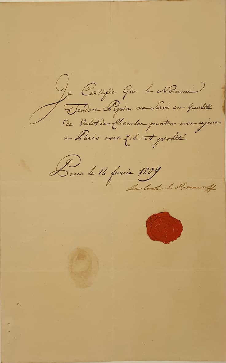 RUMYANTSEV NIKOLAI PETROVICH (1754–1826), Count Autograph certificate issued to Theodore Pepin, who served the Count during his stay in Paris. Paris, February 14, 1809.