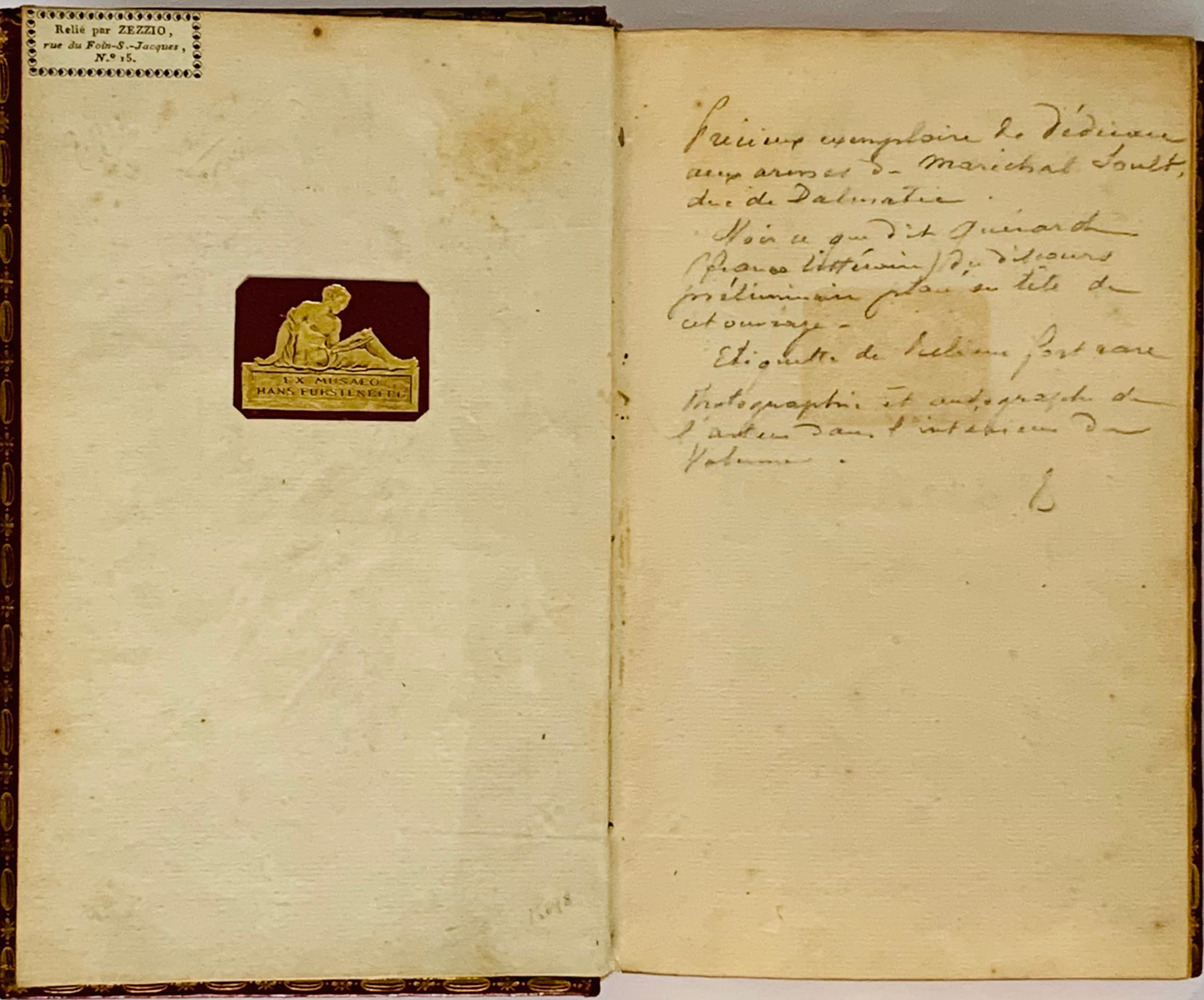 Bound in red long-grain morocco, with gilt festoon roll borders, central armorial stamp, smooth gilt-decorated spine, inner roulette, gilt edges. (Zezzio). The binding is signed with the bookbinder’s label, with the address 15 rue du Foin-Saint-Jacques in Paris.