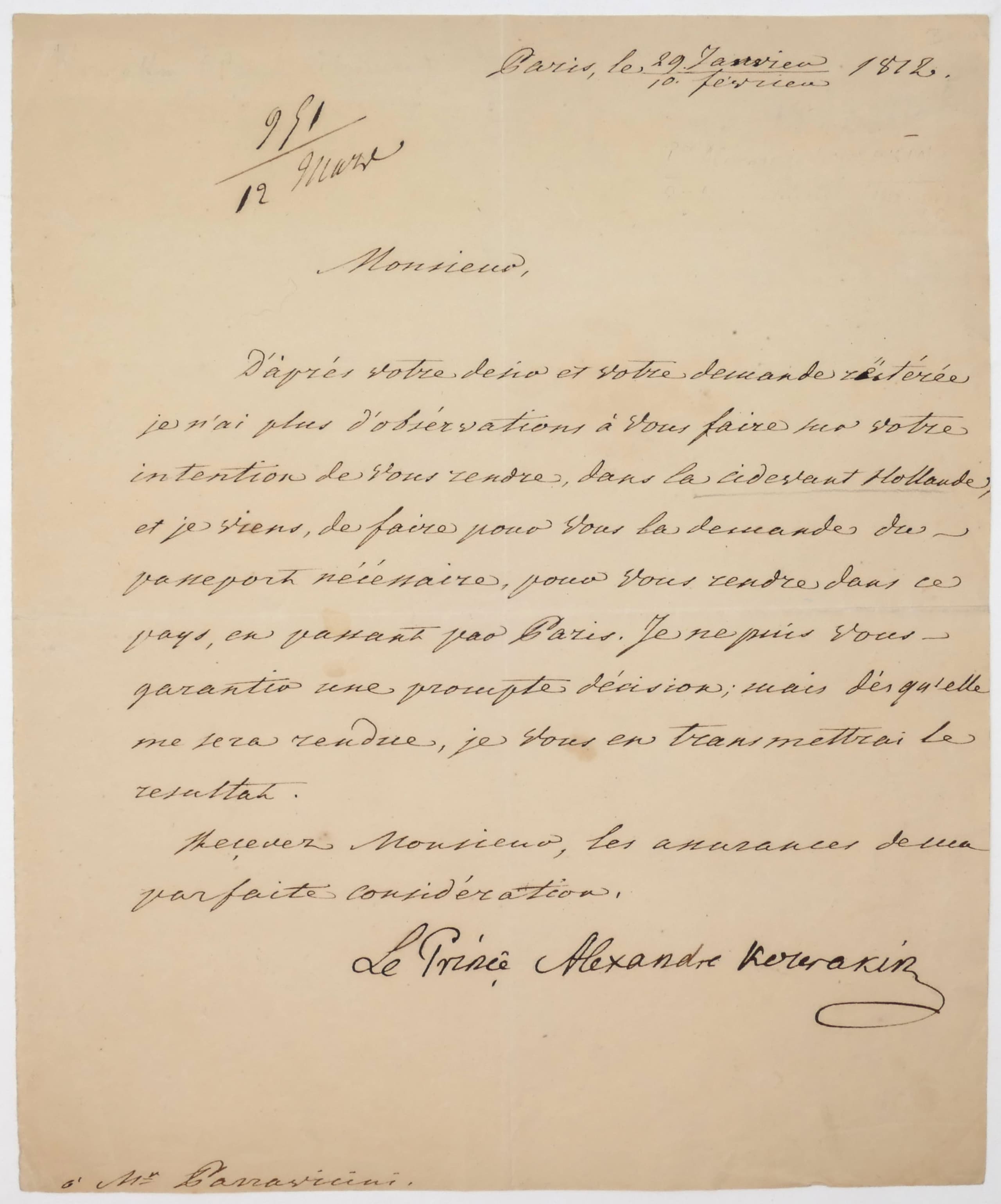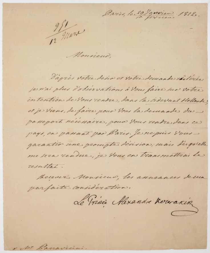 KURAKIN ALEXANDER (1752-1818) Autograph letter signed addressed to Mr. Parravicini. Paris, 29 January / 10 February 1812.