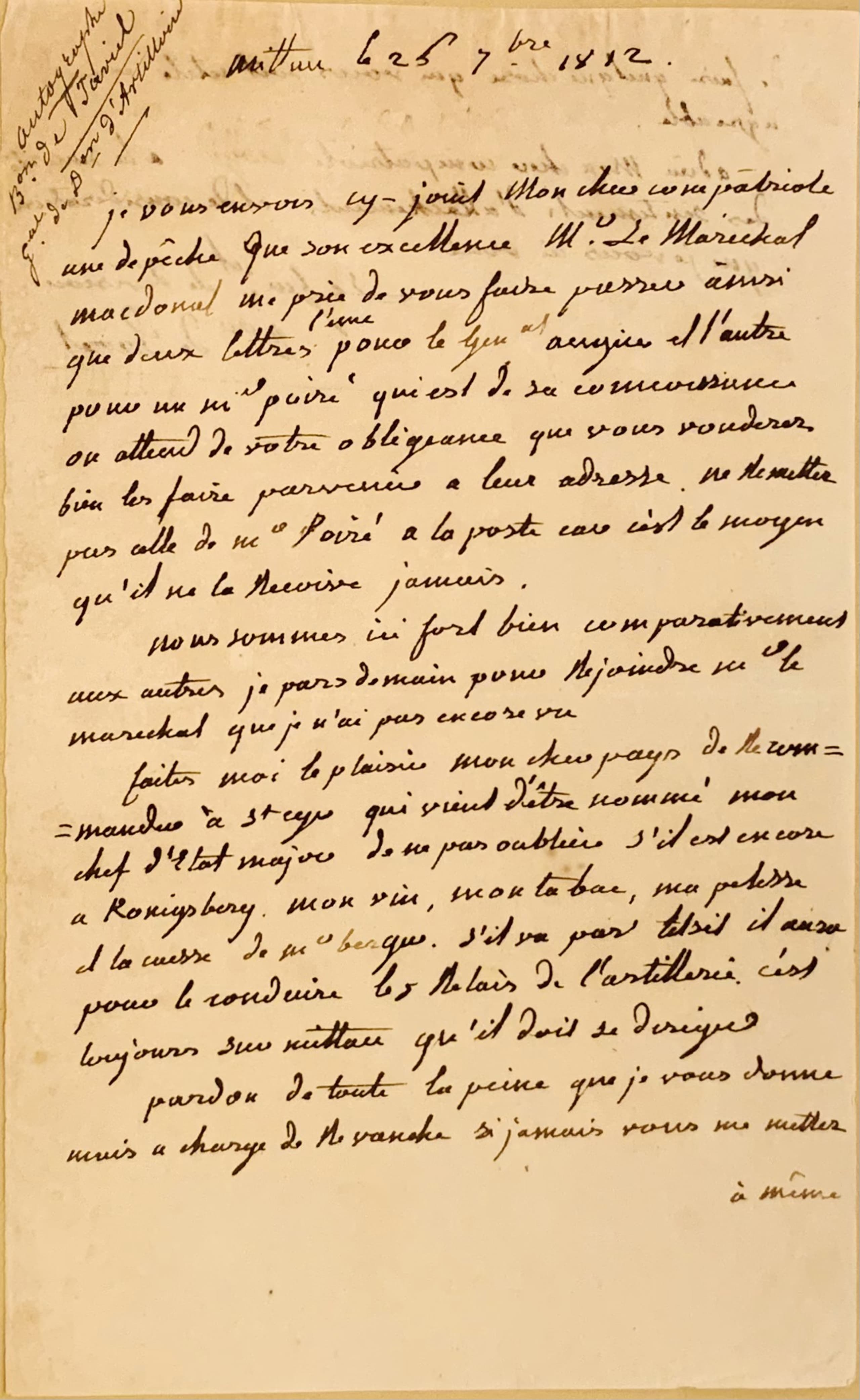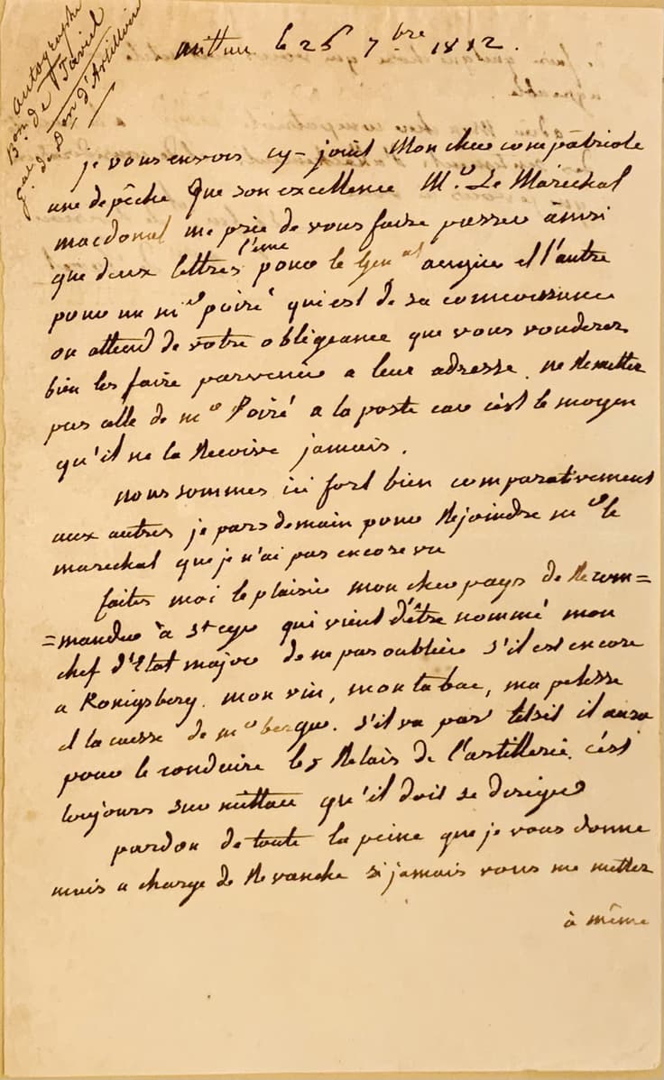 TAVIEL ALBERT LOUIS VALENTINE (1767-1831) Autograph letter signed. Mittau, 25 September 1812.