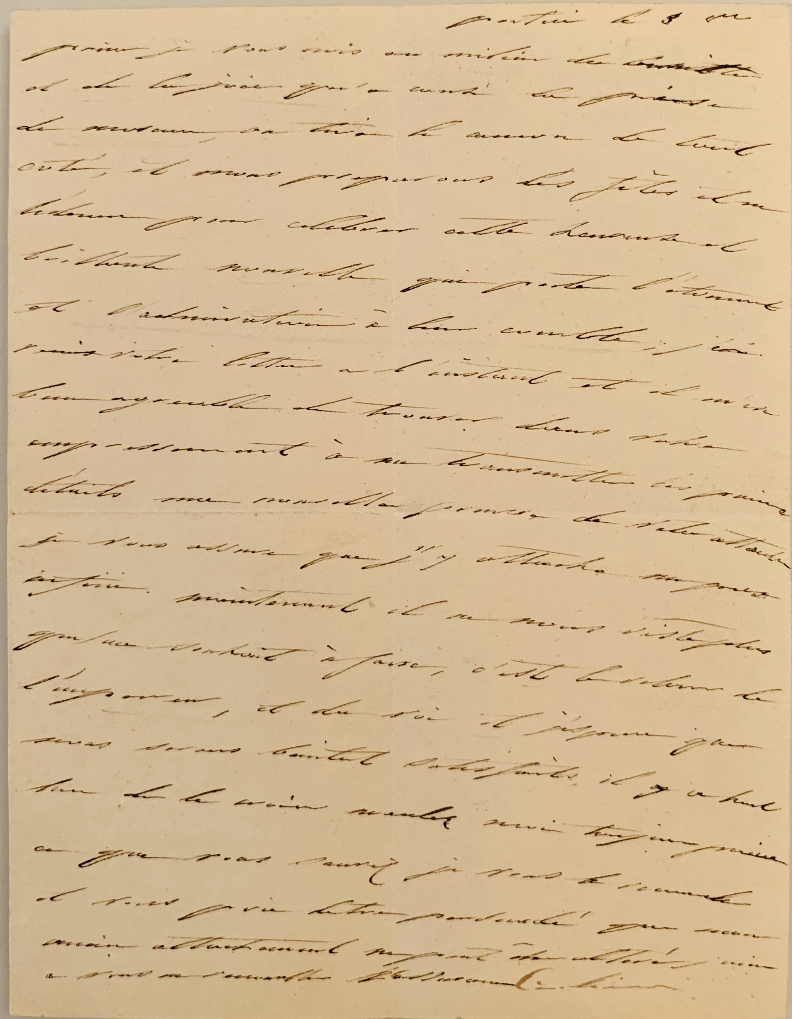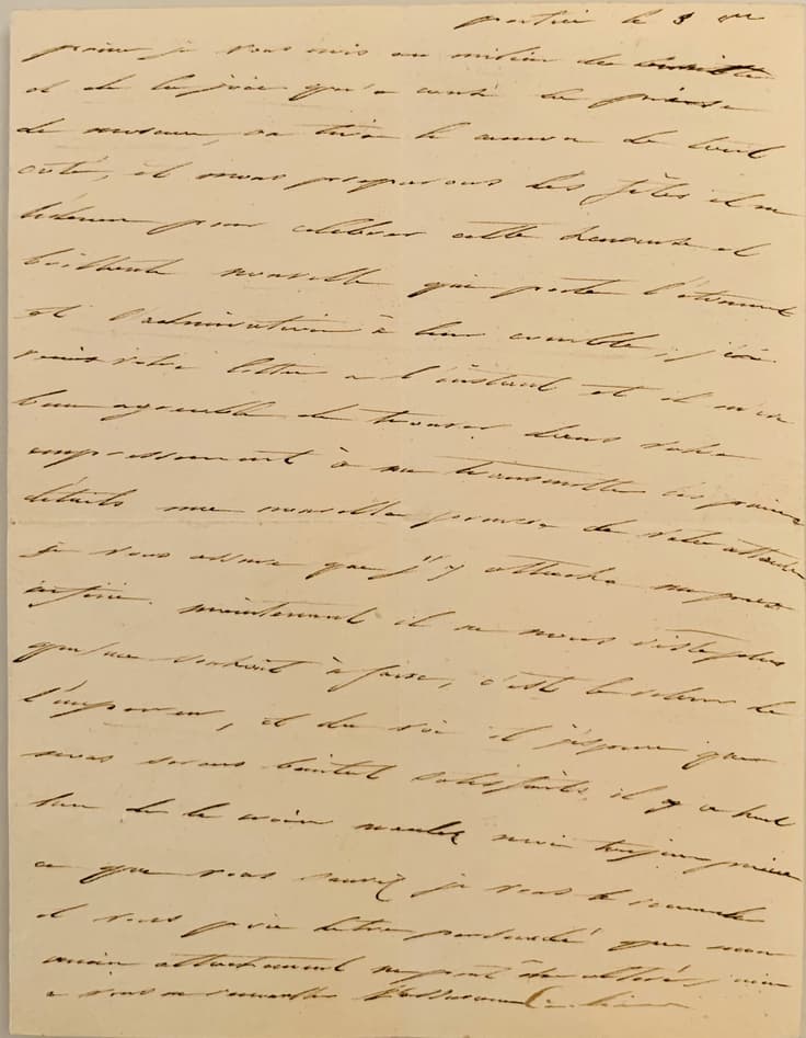 I am writing to you amid the noise and joy caused by the capture of Moscow. Cannons are firing on all sides and we are preparing celebrations and a Te Deum to celebrate this happy and brilliant news, which has filled everyone with astonishment and admiration. I have just delivered your letter and I am very pleased to find in your eagerness to send me the precious details further proof of your affection. I assure you that I value it infinitely. Now we have only one wish left, and that is the return of the Emperor [Napoleon] and the King [Murat], and I hope that we will soon be satisfied (...).