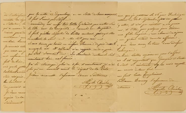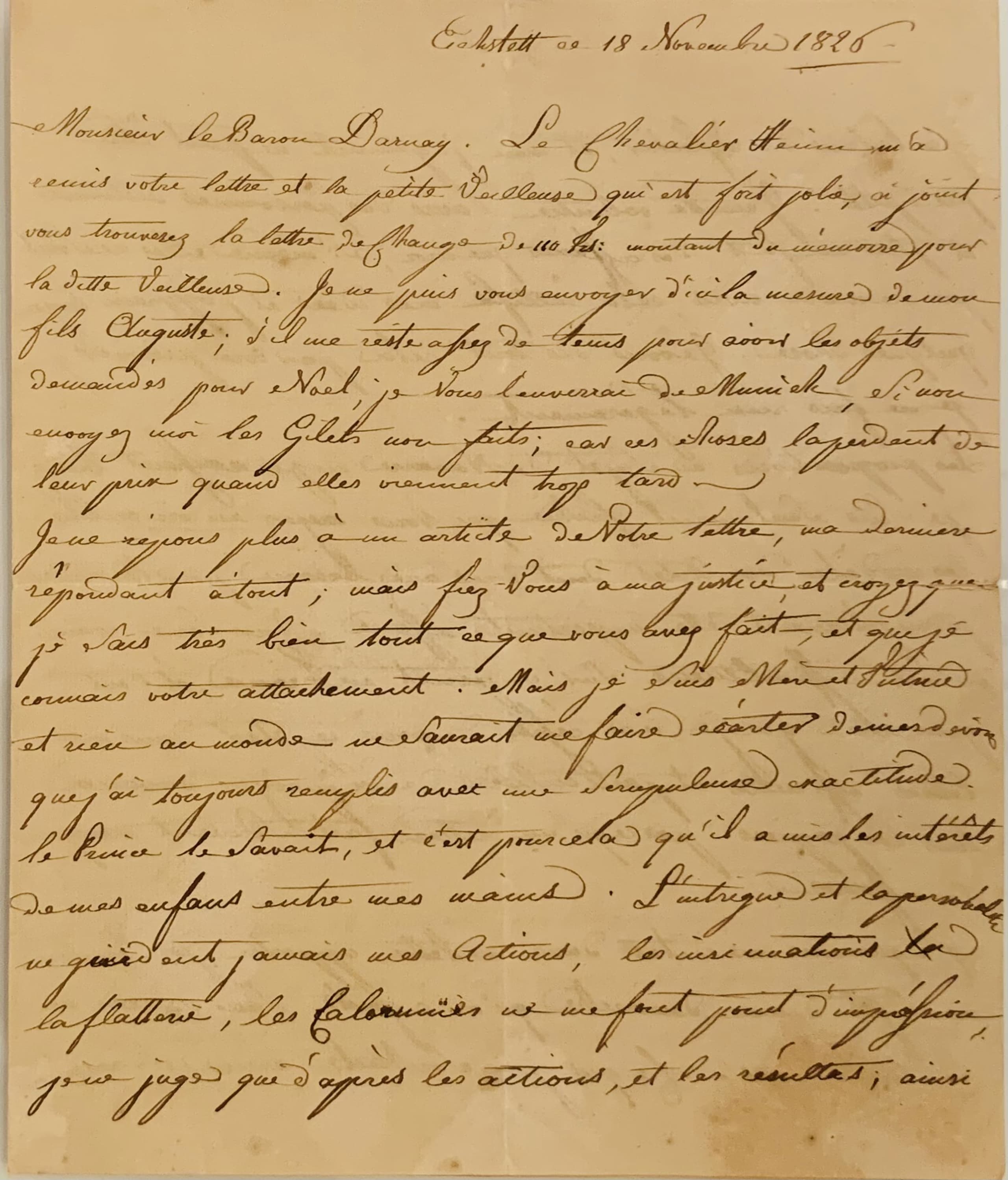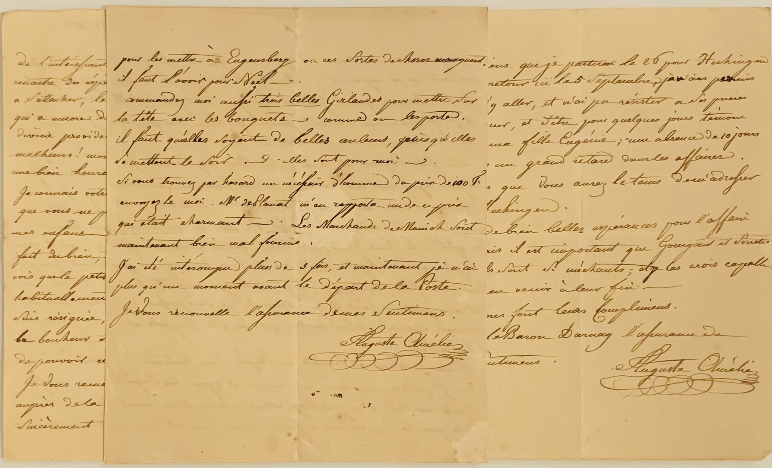 [BEAUHARNAIS] AUGUSTA-AMELIE FROM BAVIERE (1788-1851) 2 Autograph letters signed to to Baron d’Arnay. Ismanig, Echstett, August-November 1826. 7 pp. in-4.