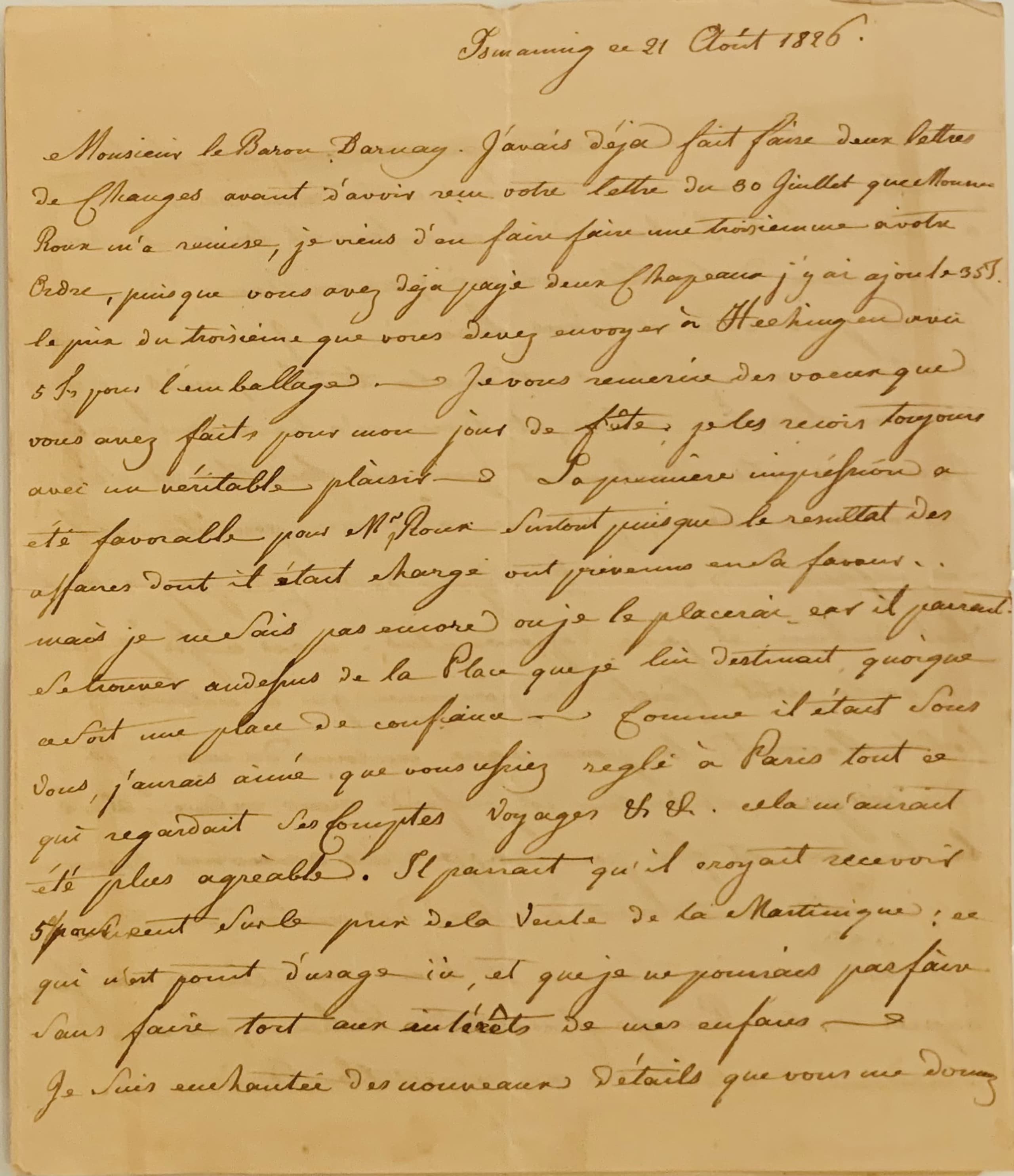 As he was under you, I would have liked you to have settled everything in Paris concerning his accounts, travels (...). It seems that he believed he would receive 5 per cent on the sale price of Martinique, which is not customary here (...) and which I could not do without harming the interests of my children (...). The happiness of my children is the only thing that still matters to me (...). I have suffered cruel misfortunes; my happiness is in the grave; but I am a very happy mother (...).