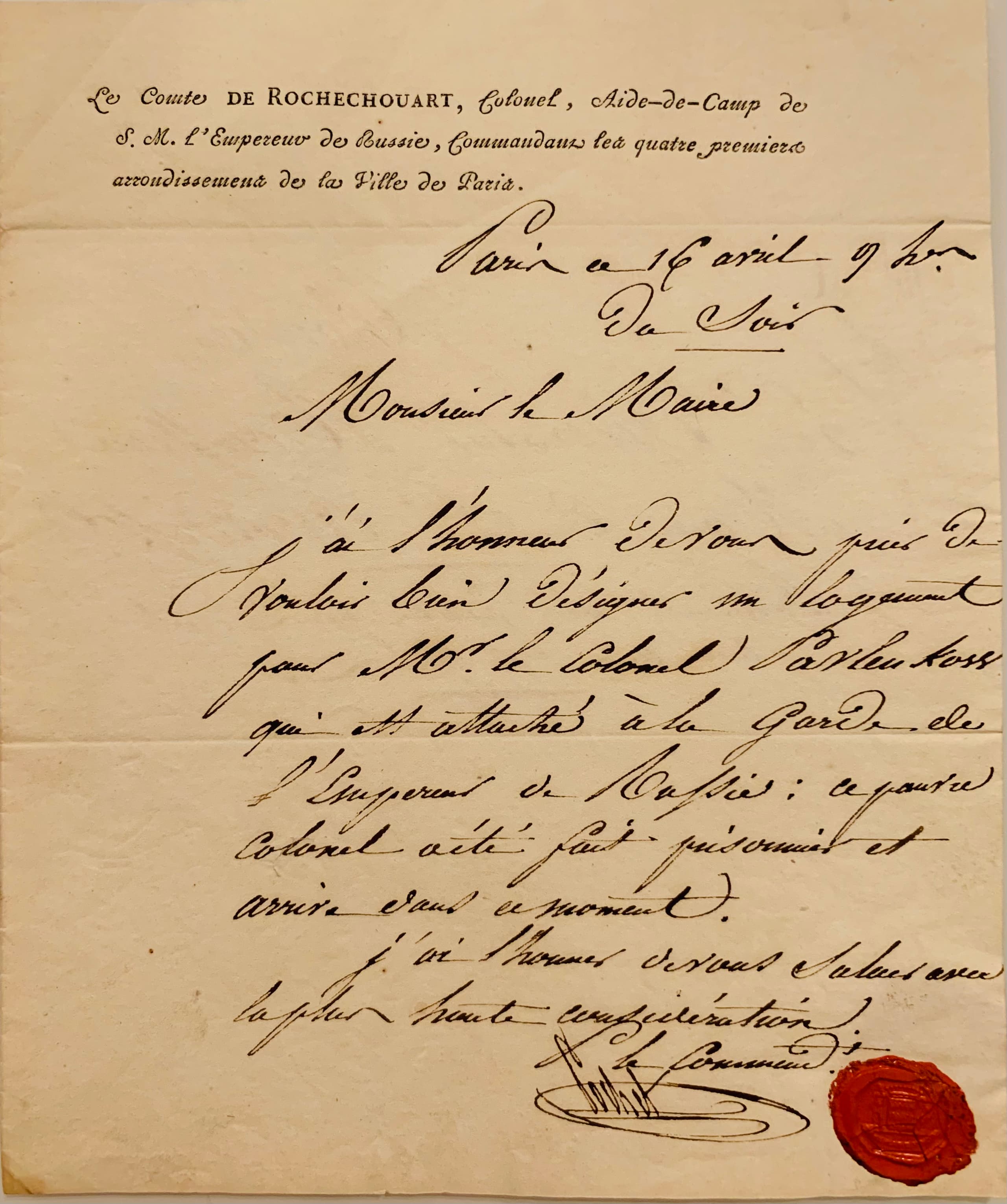 ROCHECHOURT LOUIS-VICTOR-LEON (1788-1858) Autograph letter signed to Monsieur le Chevalier..., Mayor of the 3rd Arrondissement. Paris, 16 April 1814.