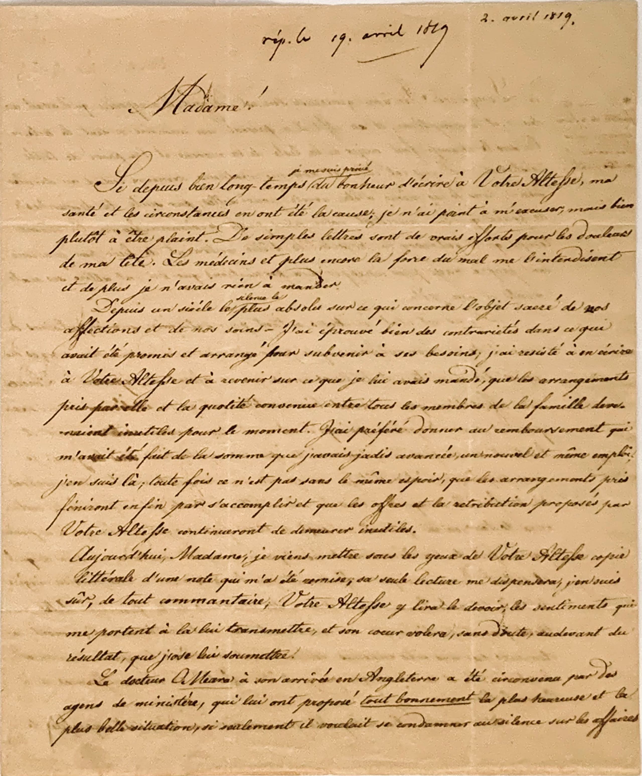 EMMANUEL DE LAS CASES (1766-1842) Letter signed to Princess Elisa Bonaparte in Trieste. Frankfurt, 2 April 1819.