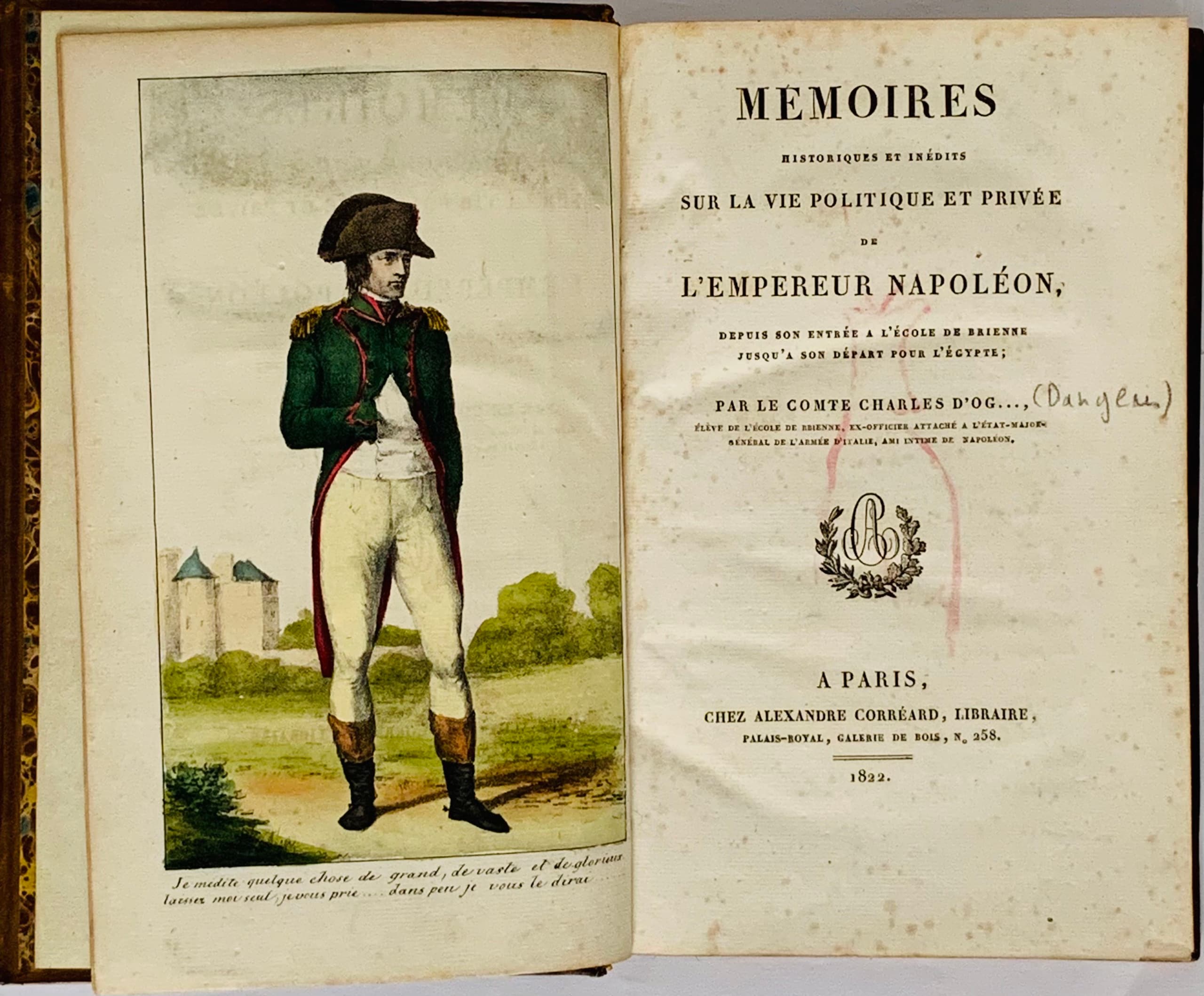 [DANGEAIS CHARLES] Mémoires historiques et inédits sur la vie politique et privée de l’Empereur Napoléon, depuis son entrée à l’école de Brienne jusqu’à son départ pour l’Égypte. Paris: Corréard, 1822.