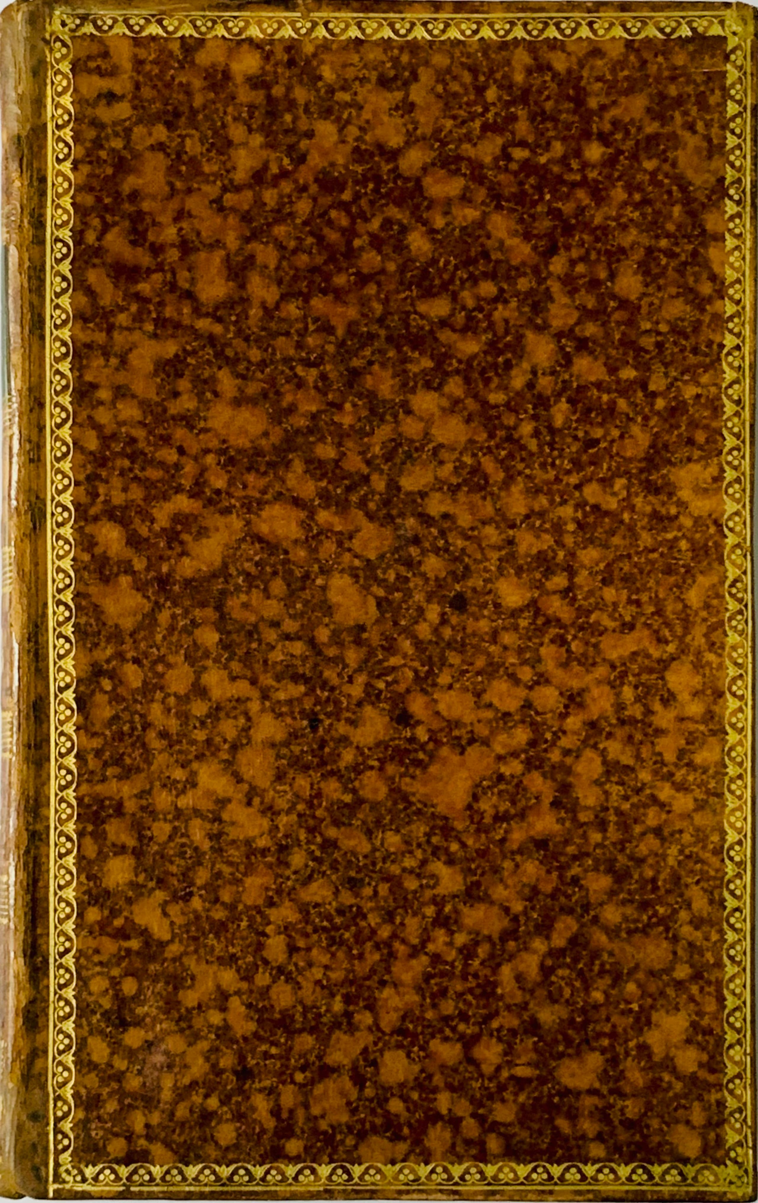 Porphyry sheepskin, gilt roulette frame, smooth decorated spine, green headband, marbled edges (period binding). Foxing.