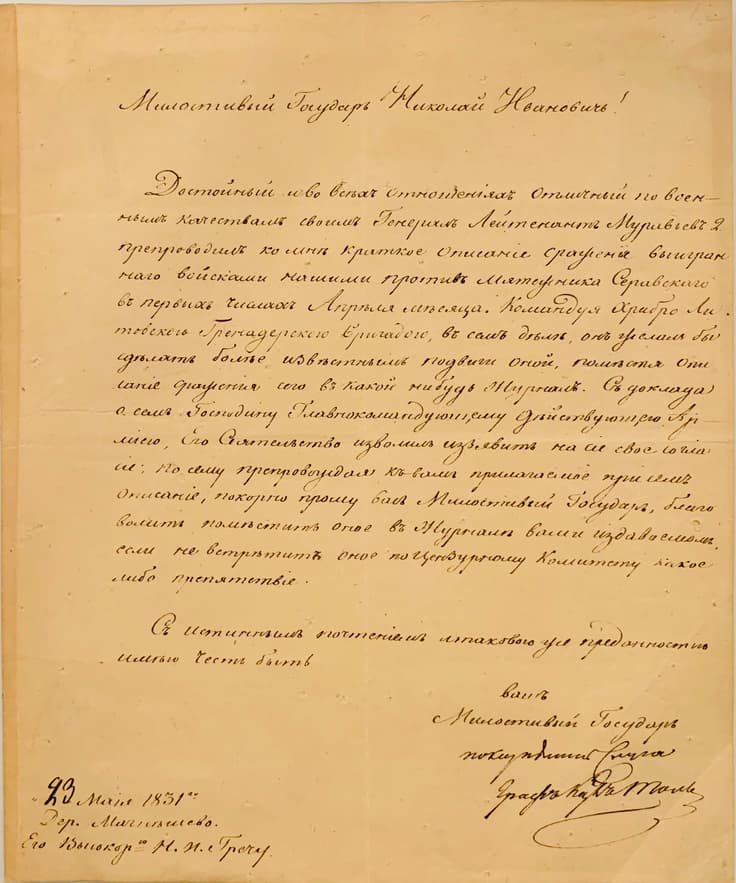 TOLL KARL (1777-1842), Count Handwritten letter signed addressed to Nikolai Ivanovich Grech. 23 May 1831.
