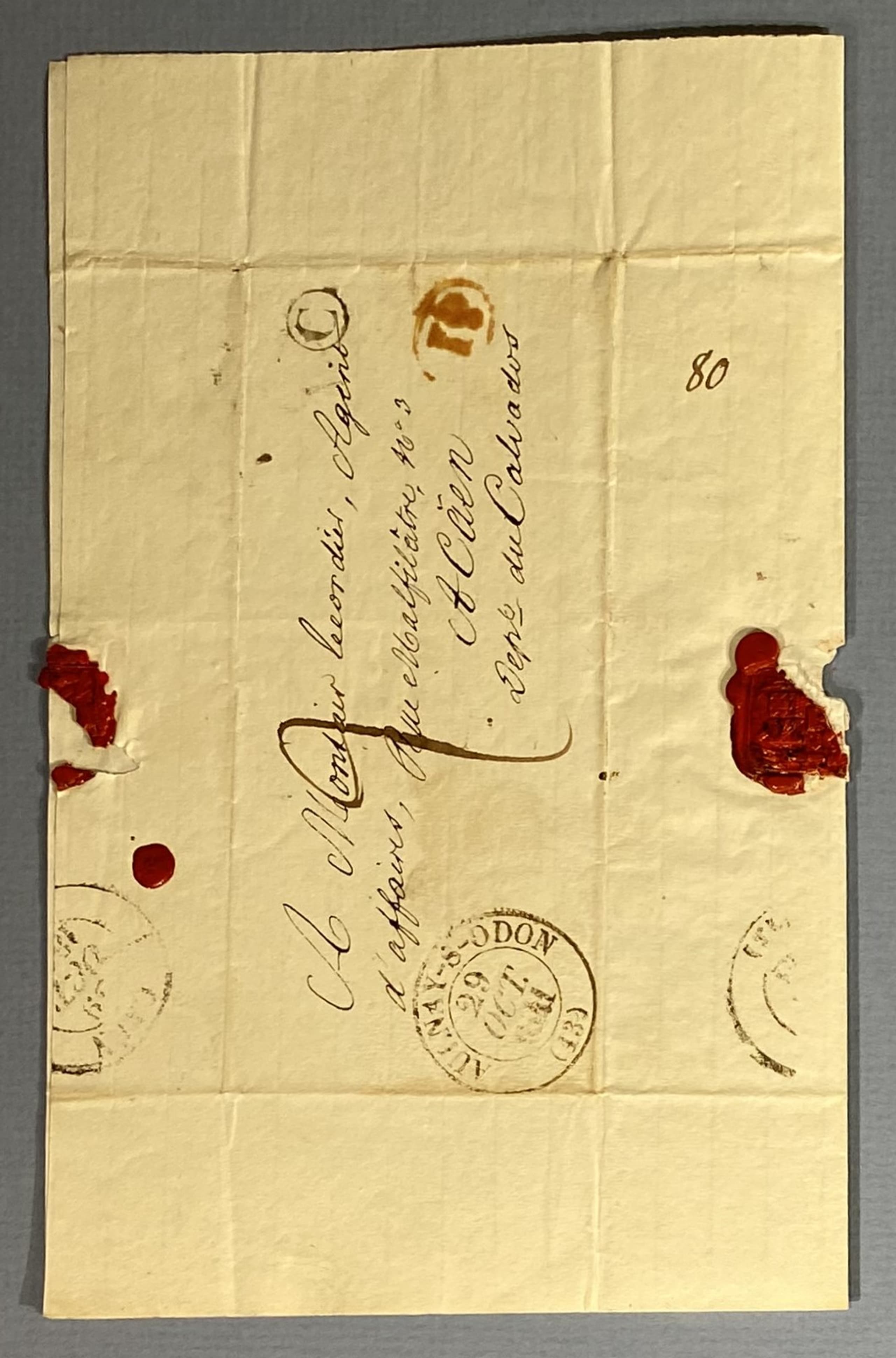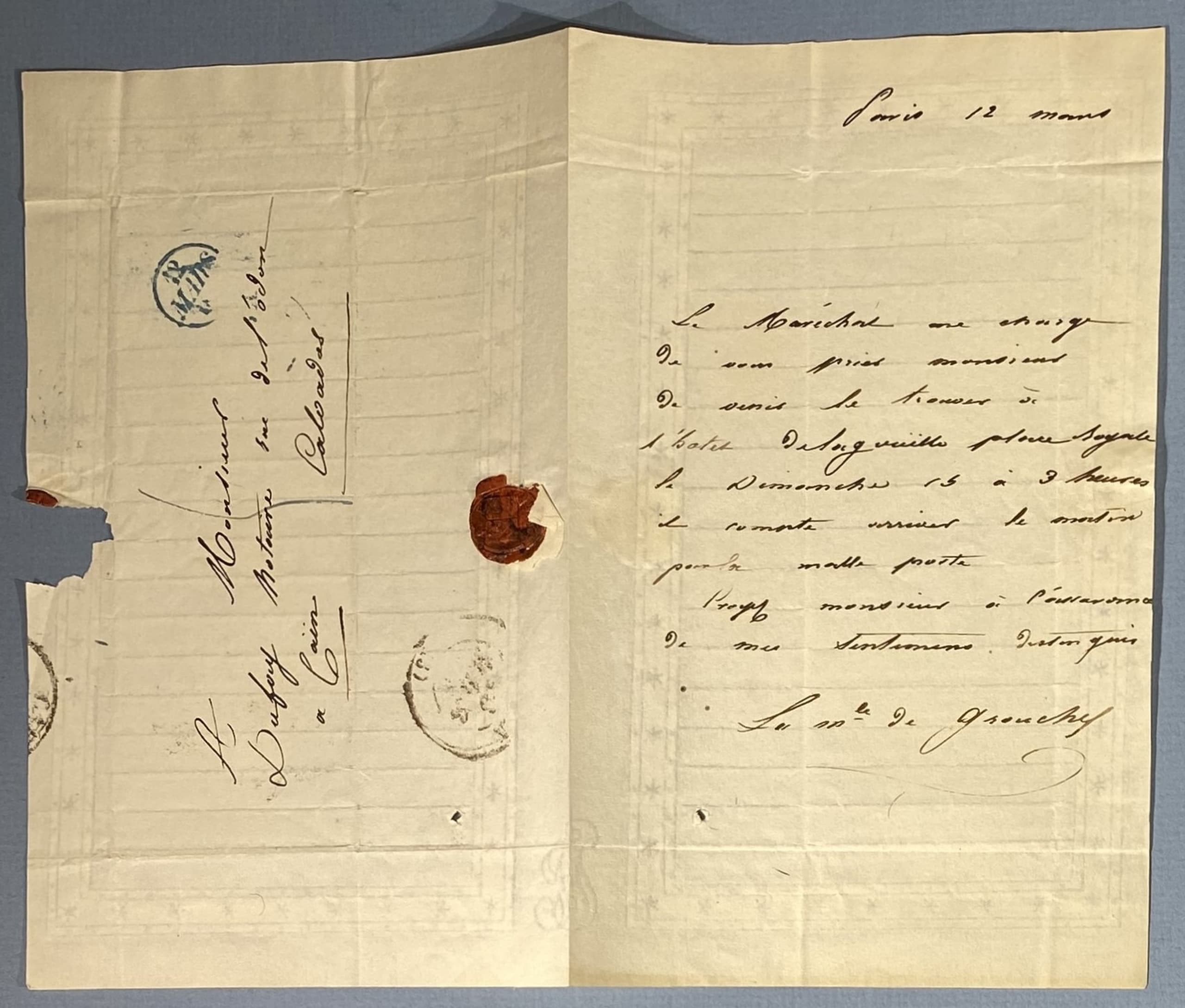 4 p., double leaf, very legible writing in black ink, accompanied by its dispatch envelope. Back of envelope bears postmarks and wax seal with arms of Marshal de Grouchy, in good condition.