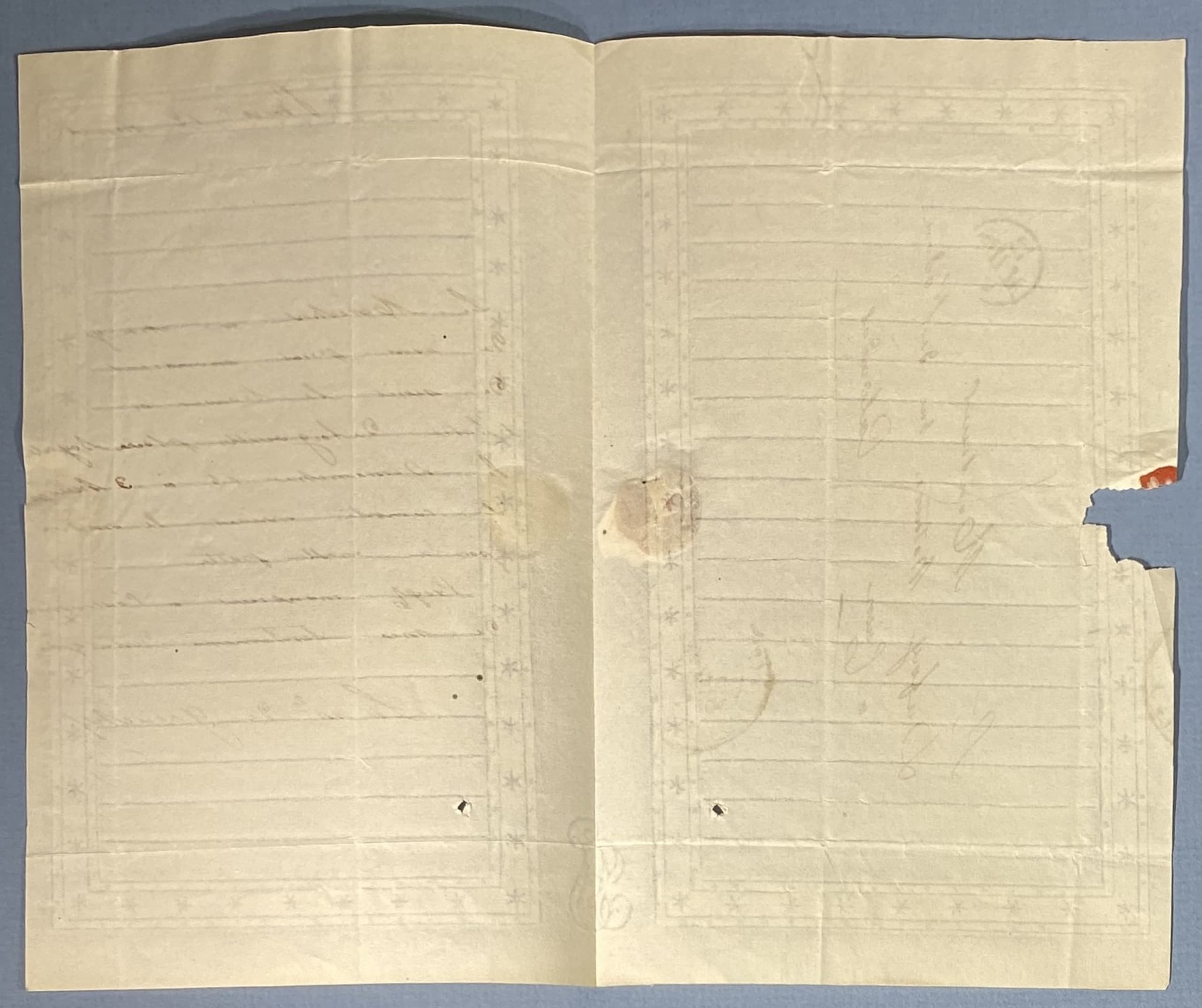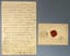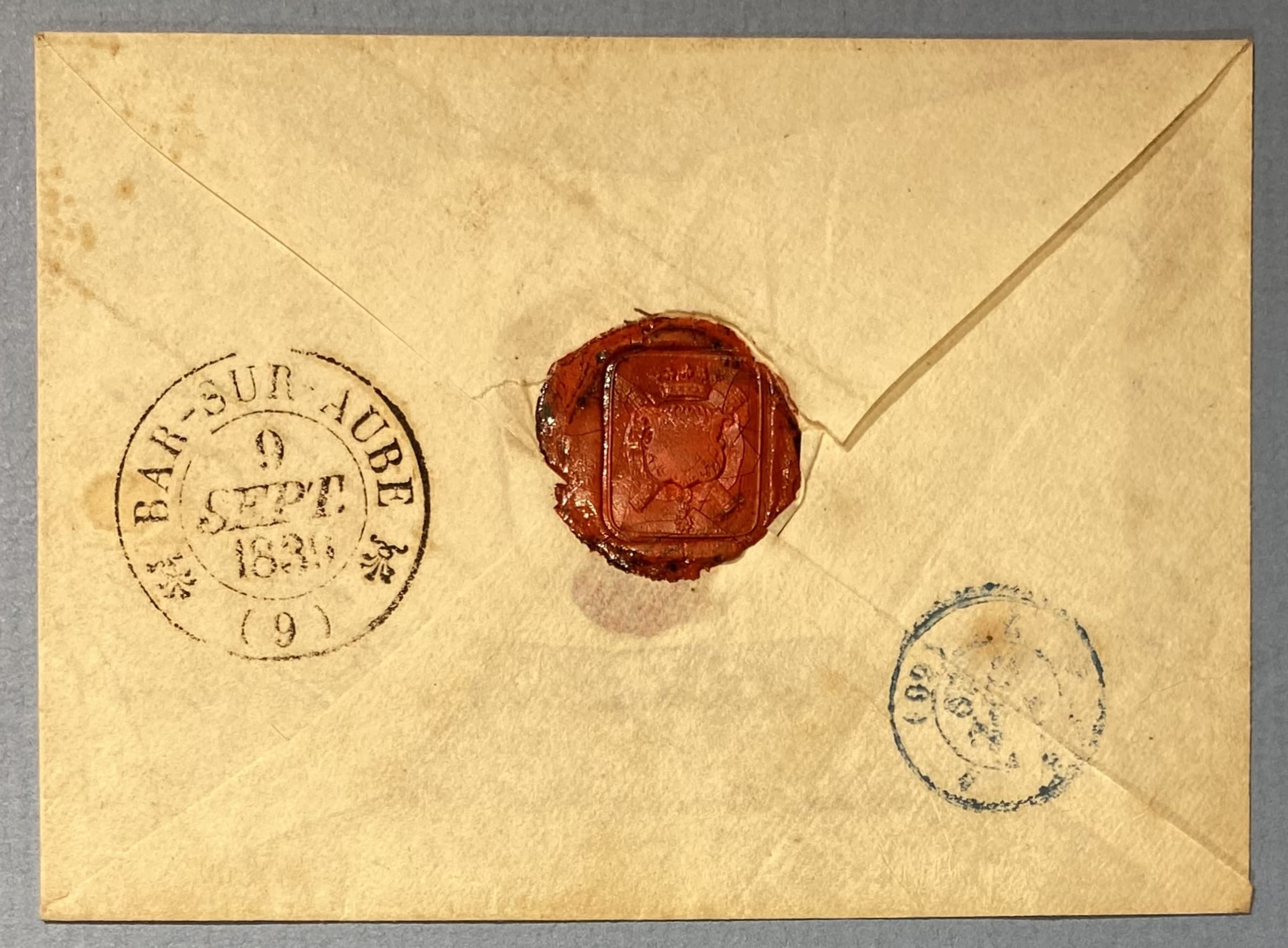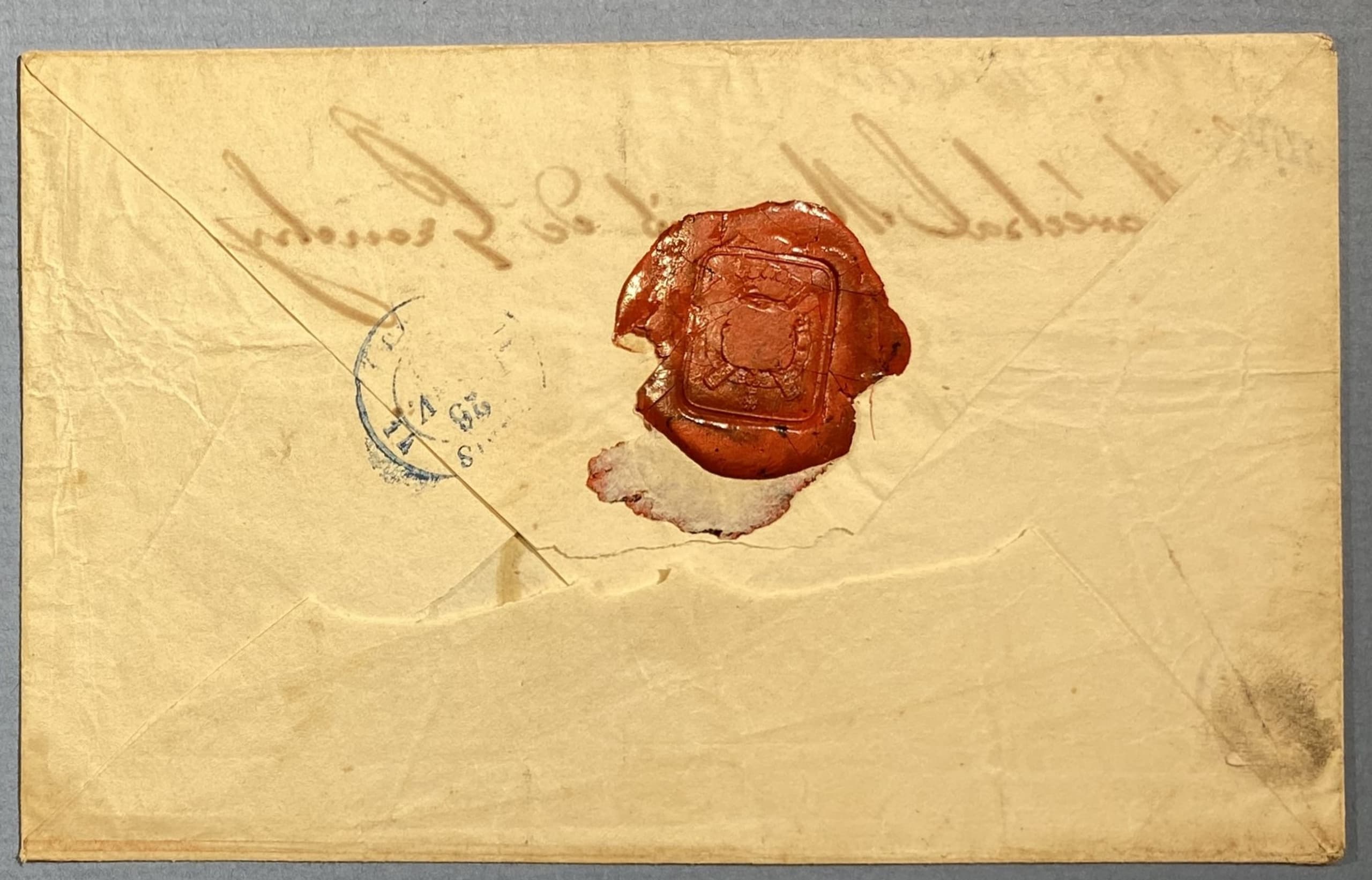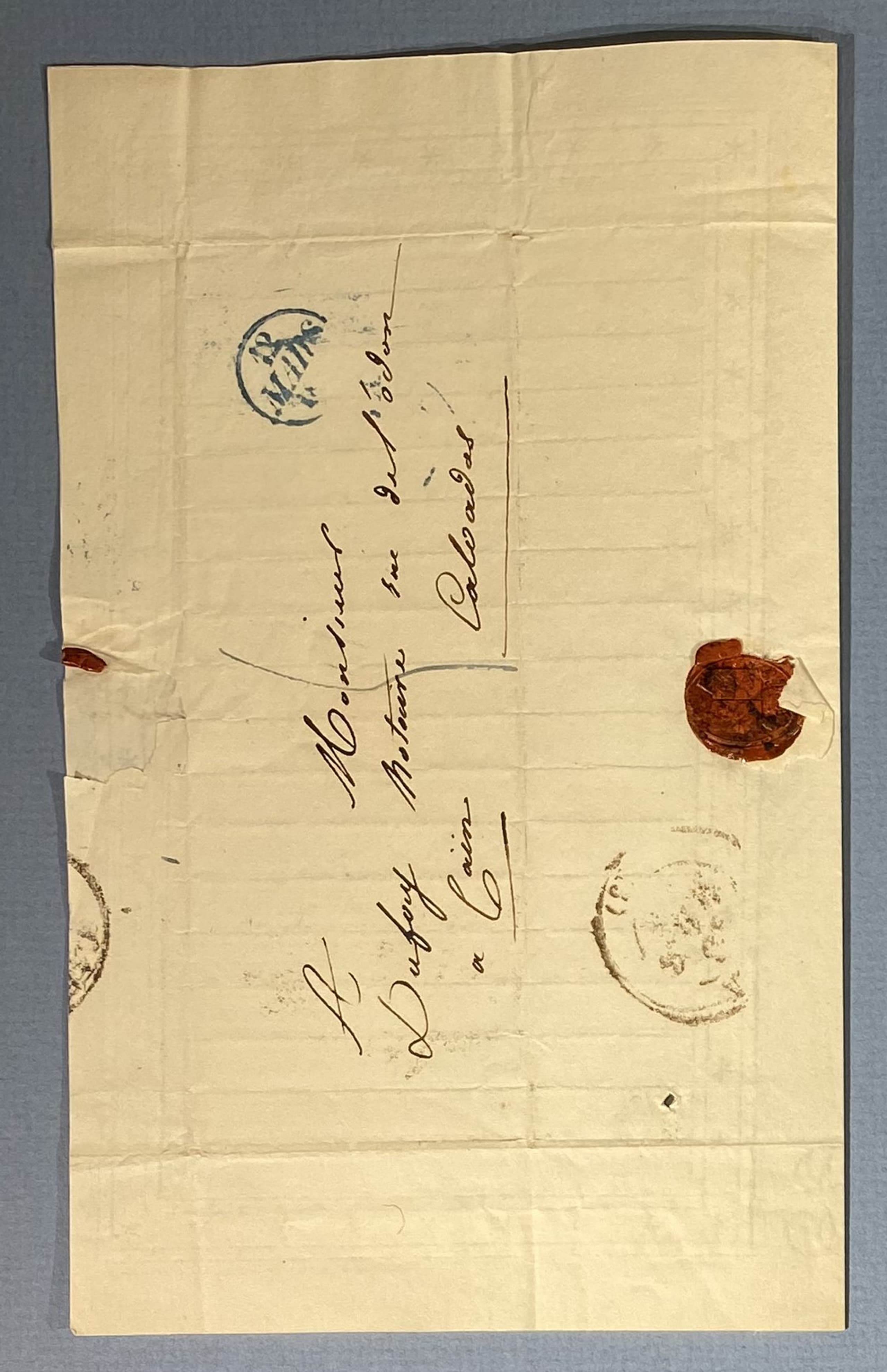 4 p., double sheet, very legible black ink writing, (small lack and small tear at the fold at the bottom of the document without affecting the text), accompanied by its mailing envelope. The back of the envelope bears a postmark and an armorial red wax seal.