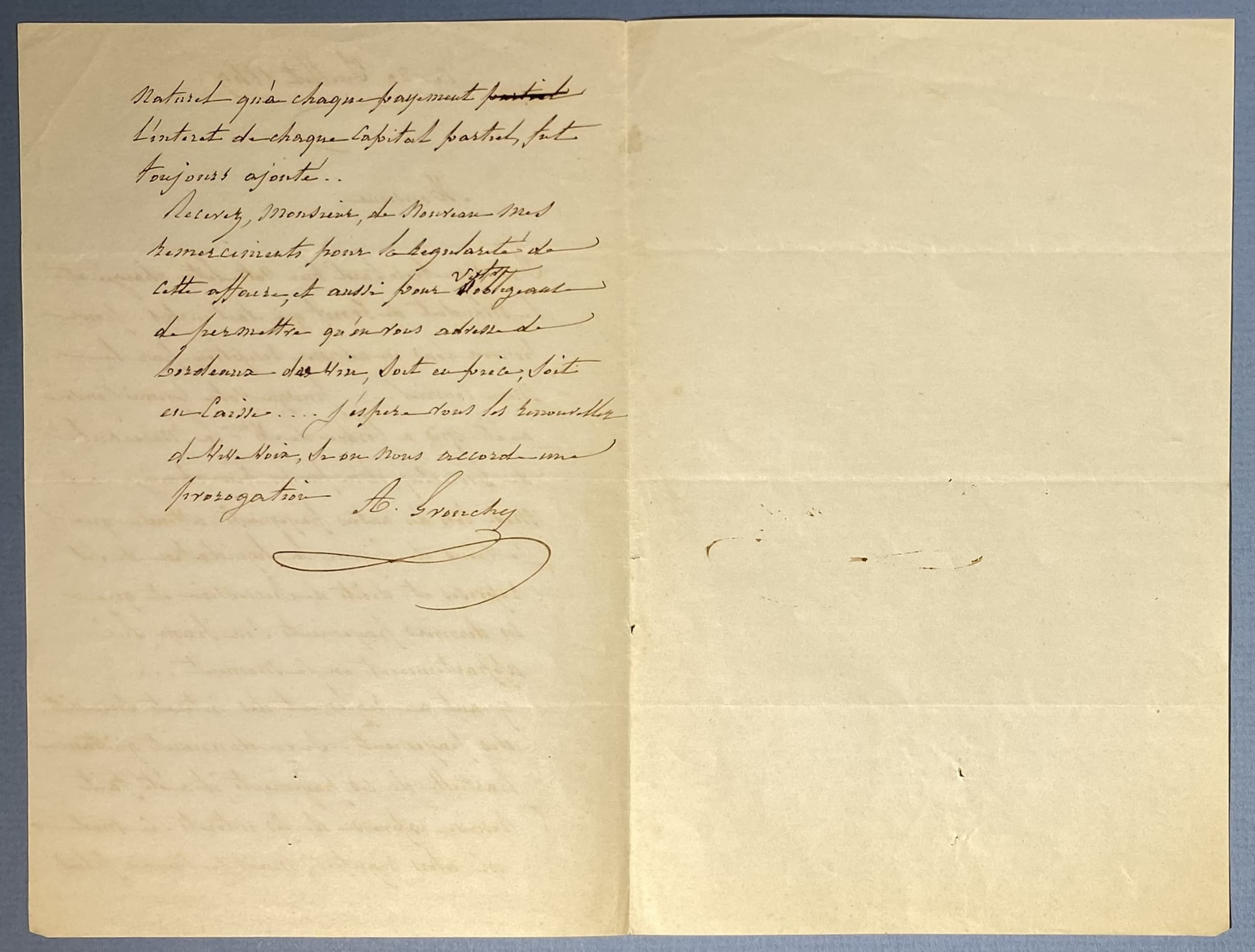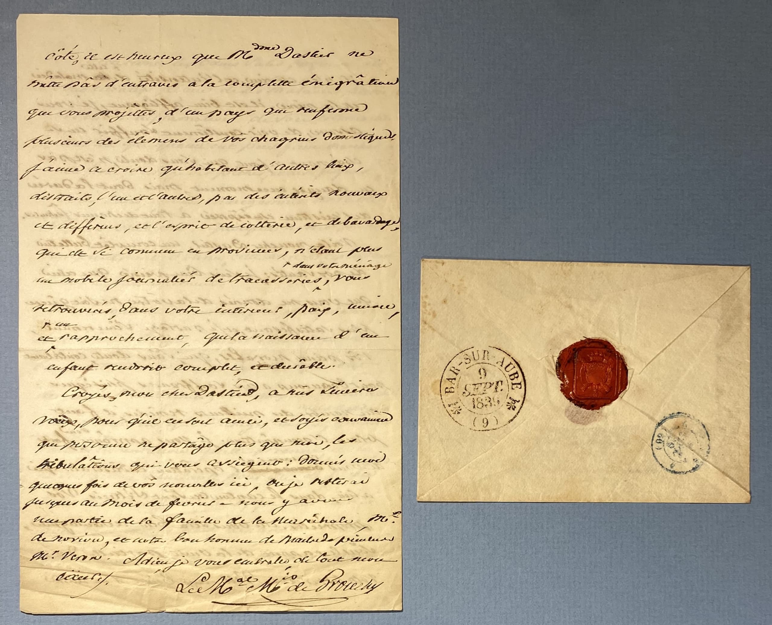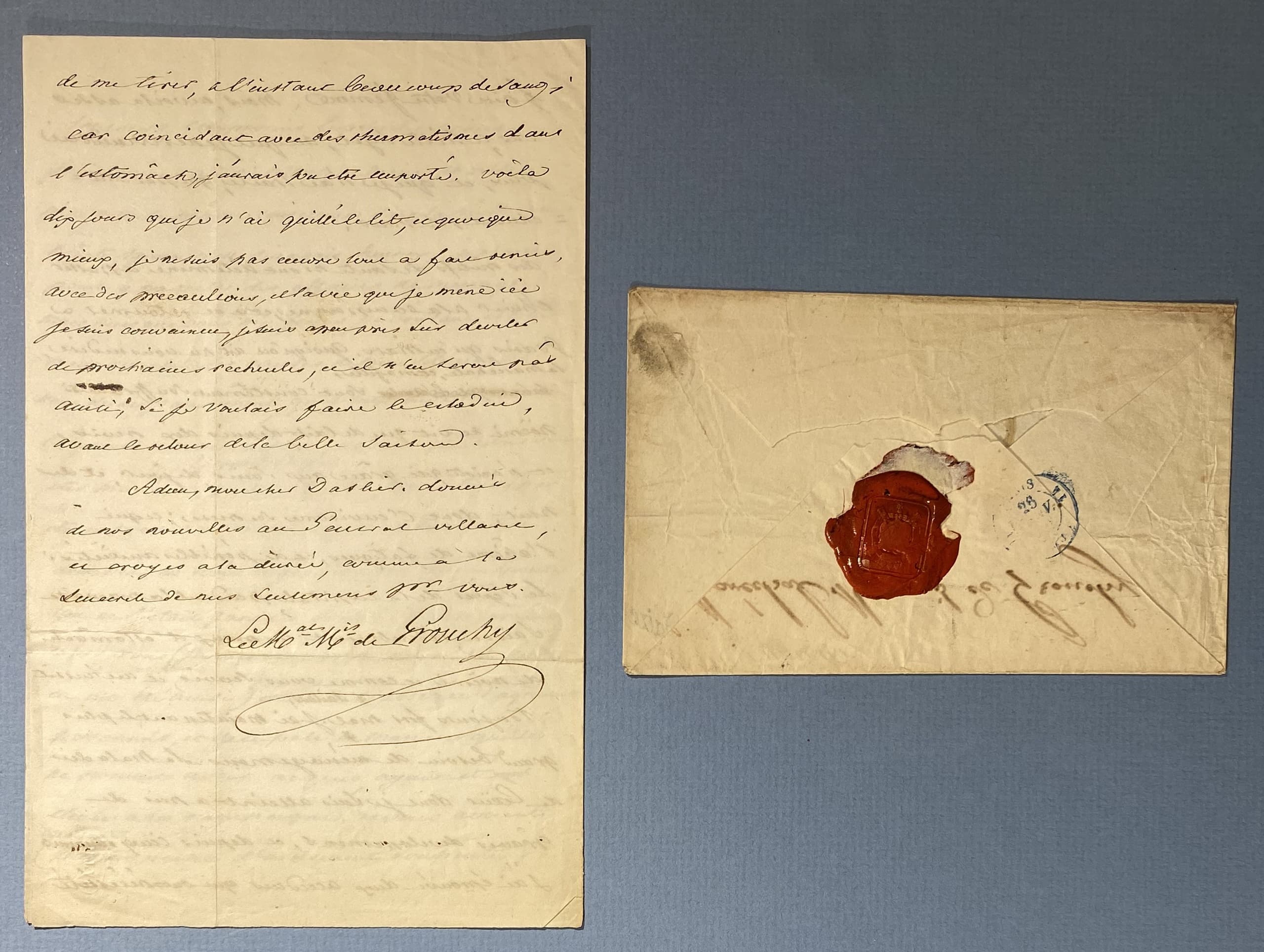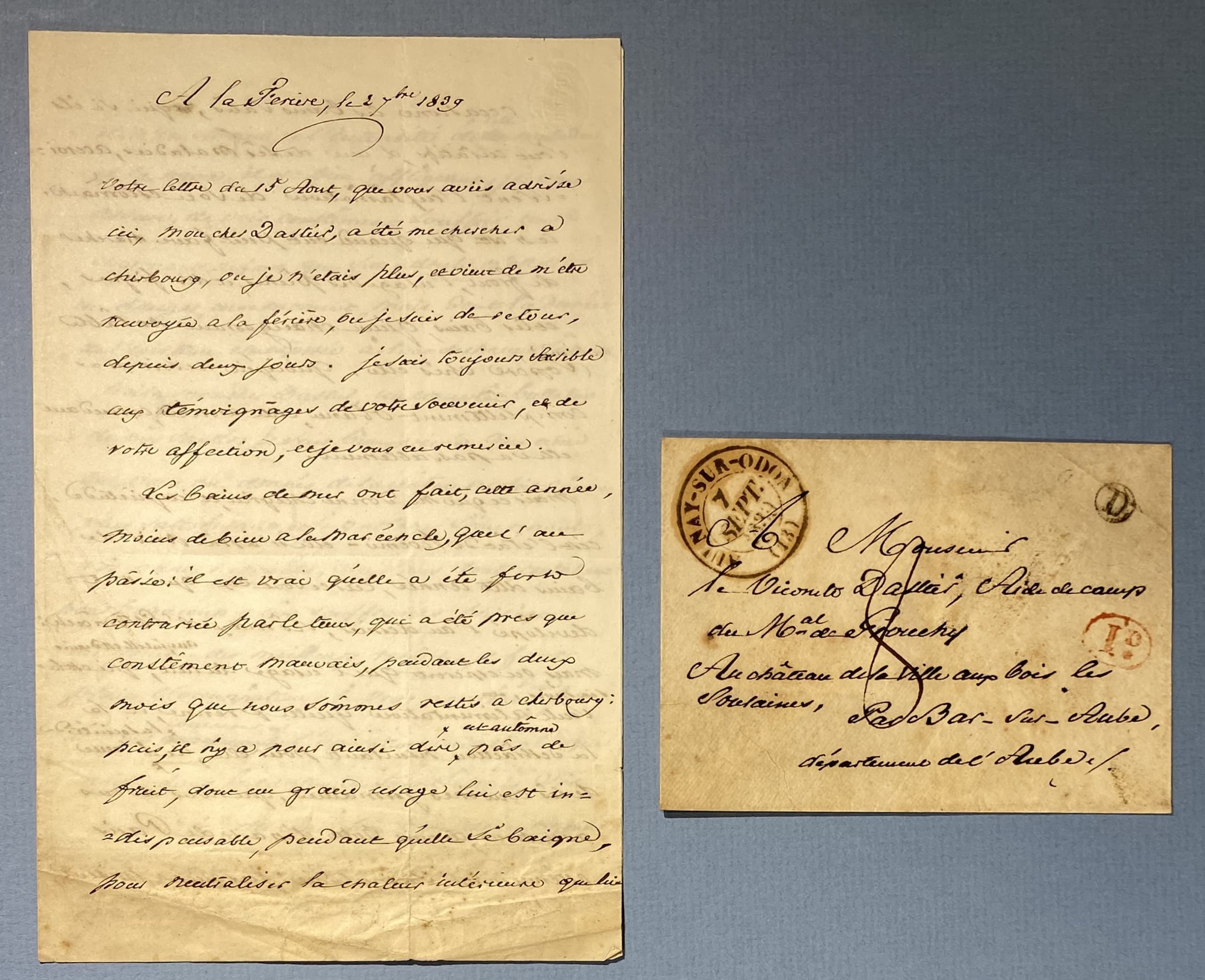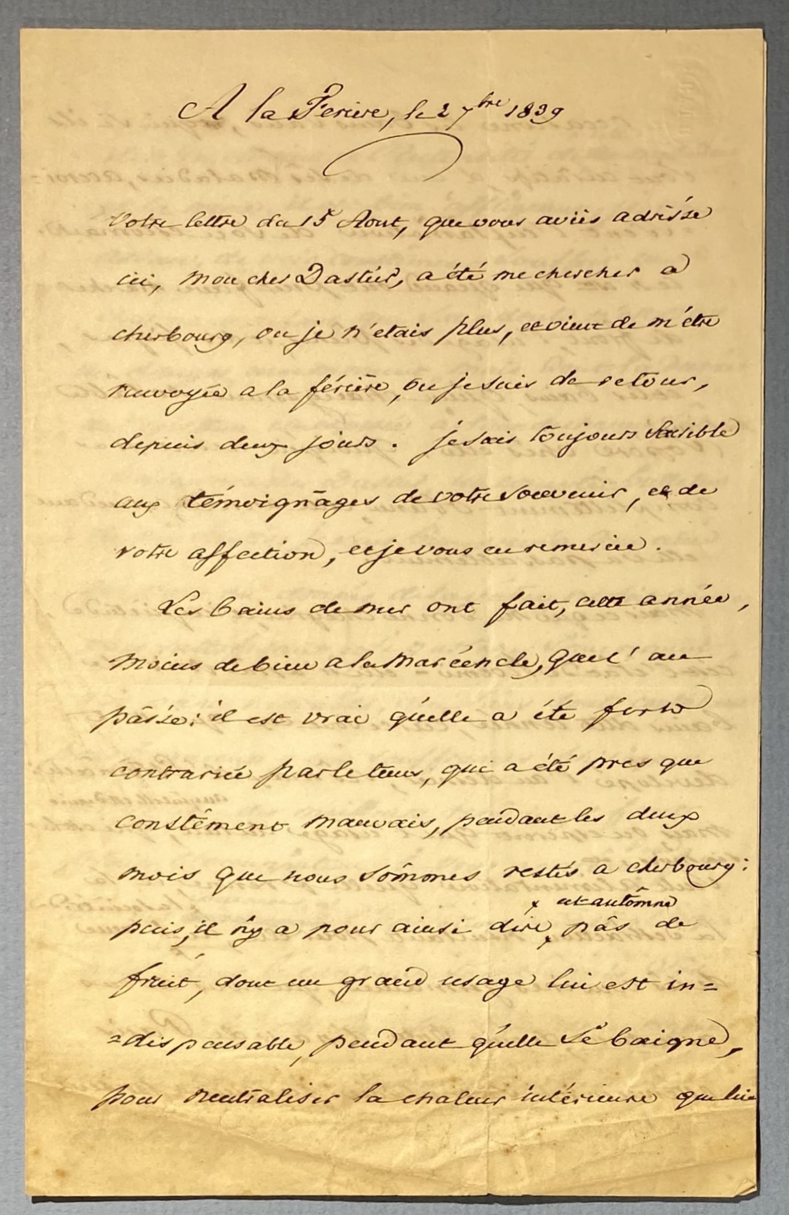 In this intimate letter, Marshal Grouchy gives news of his wife's health and that of their daughter Noémie, aged 9, who died four years later. 'Your letter of 15 August, which you sent here, my dear Dastier, was sent to find me in Cherbourg, where I was no longer, and has just been sent back to me at La Férière, where I have been for the last two days [...] Sea bathing has done the Marshal less good this year than last: it is true that she has been greatly upset by the weather, which has been almost constantly bad, during the two months we have been in Cherbourg. [...] But what gives me grief and concern is Noémie's condition - she has not taken any baths this year, as it was they that developed her stomach upsets last year: but we hoped that the use of milk, which is the only food she takes, and the resulting distraction for her of one of her first cousins, whom we have had with us since we left Paris, would ease her illness. So far so good, because the intensity of the illness is the same. It is very distressing, I assure you, to see this charming child suffering all the time, who is no doubt not in danger at the moment, but whose life is exposed to so many unfortunate things. There you have it, my dear Dastier, a complete report on our health. I am very sorry that the one you have given me on yours is hardly more satisfactory, and I sincerely share your moral suffering, which undoubtedly contributes a great deal to your physical suffering. [...] Believe me, my dear Dastier, that I sincerely hope that it will be so, and be convinced that no one shares more than I do the tribulations that besiege you. [Farewell, I embrace you with all my heart'.