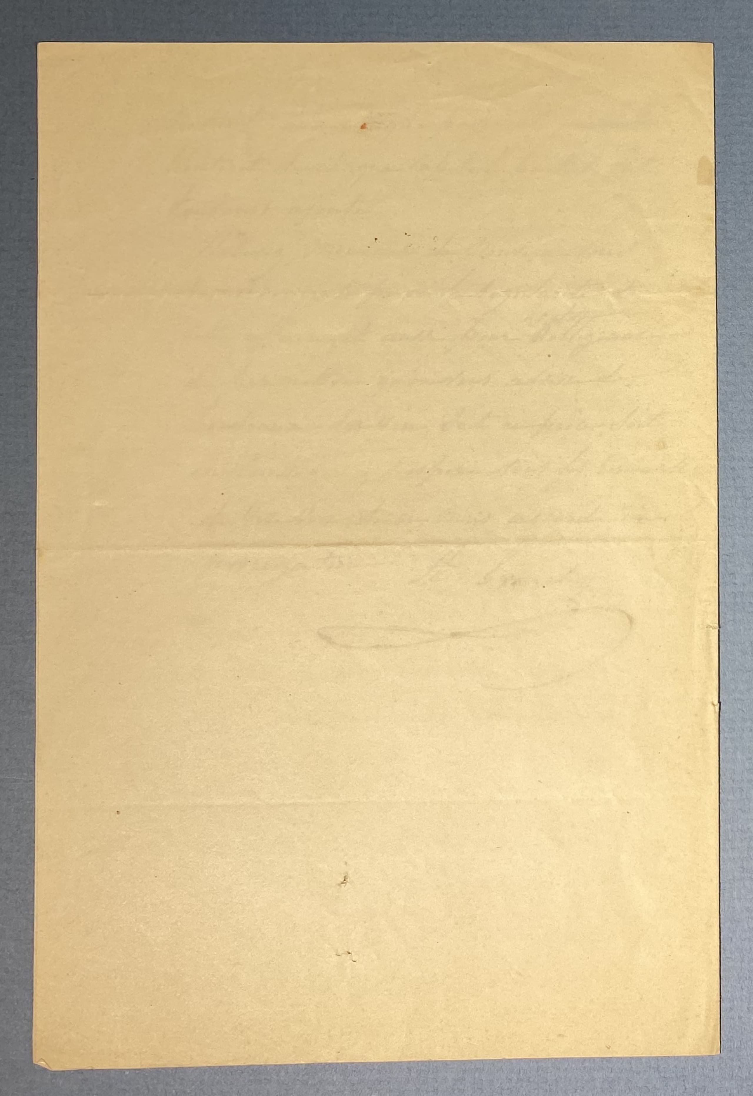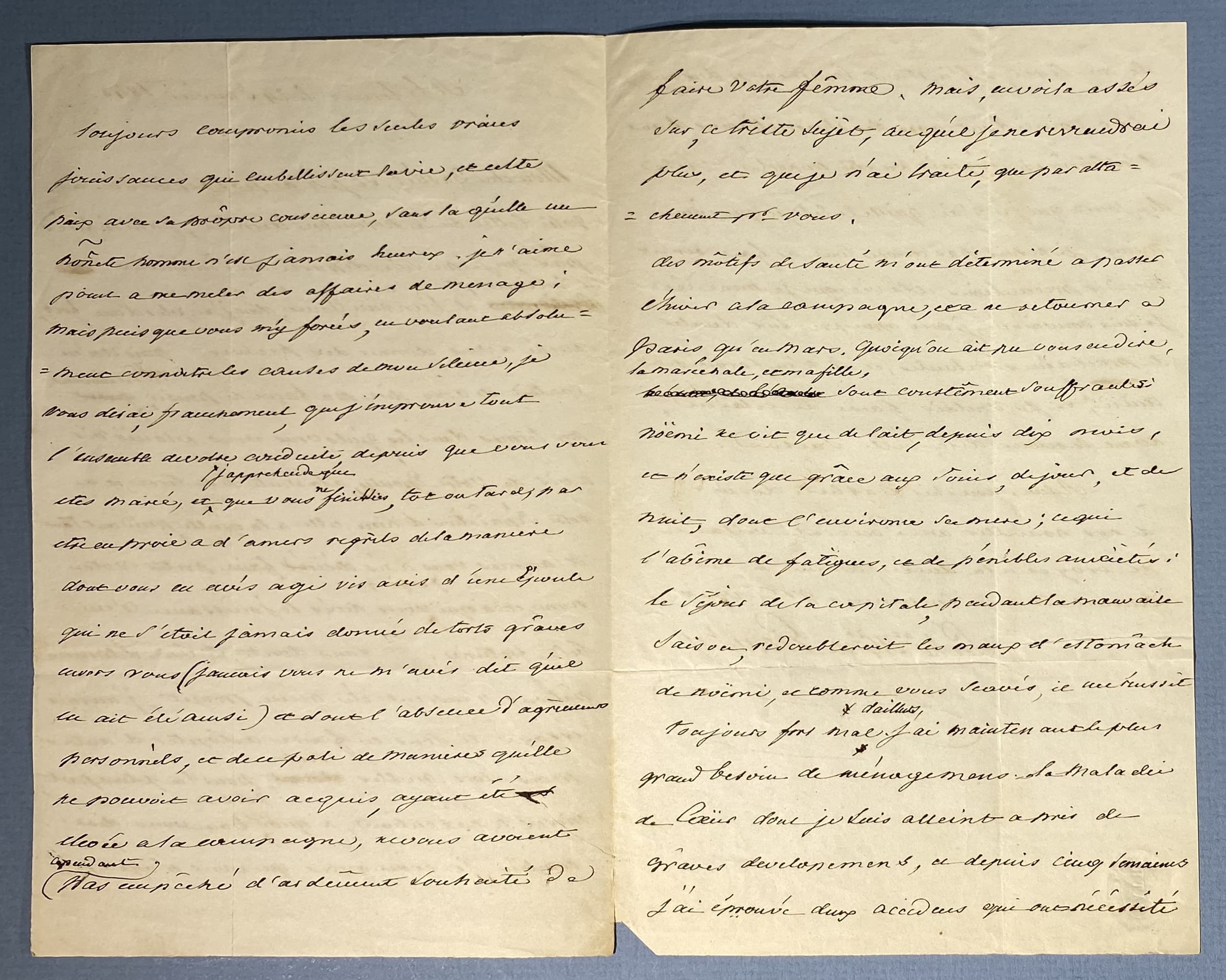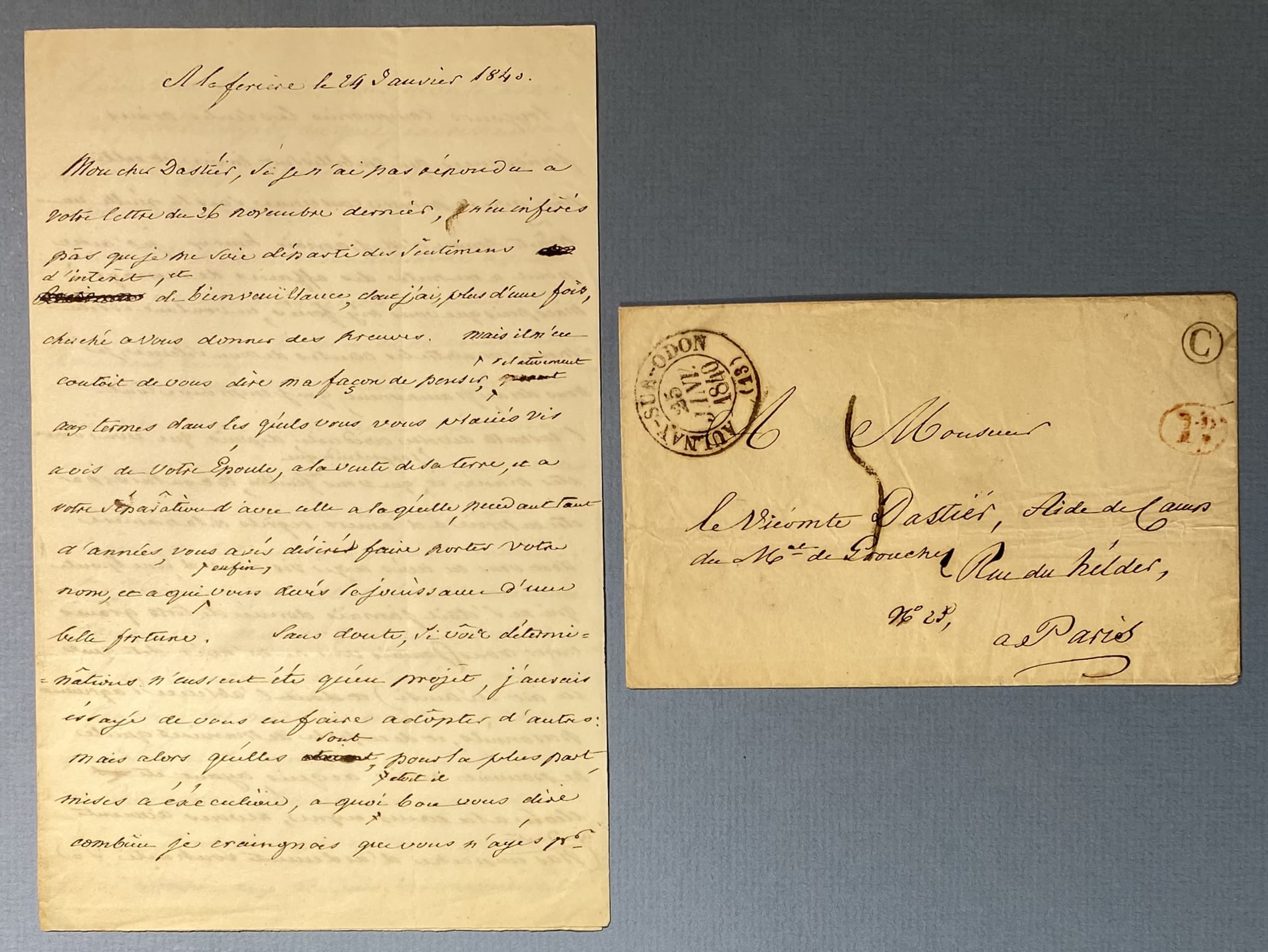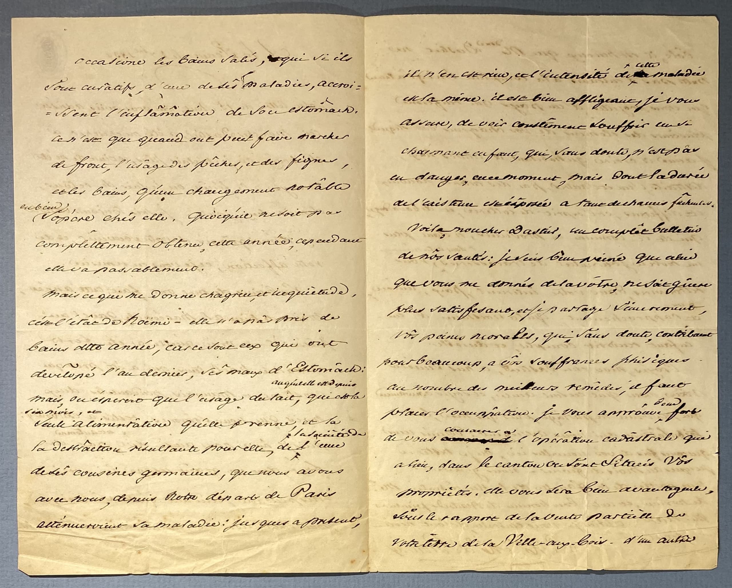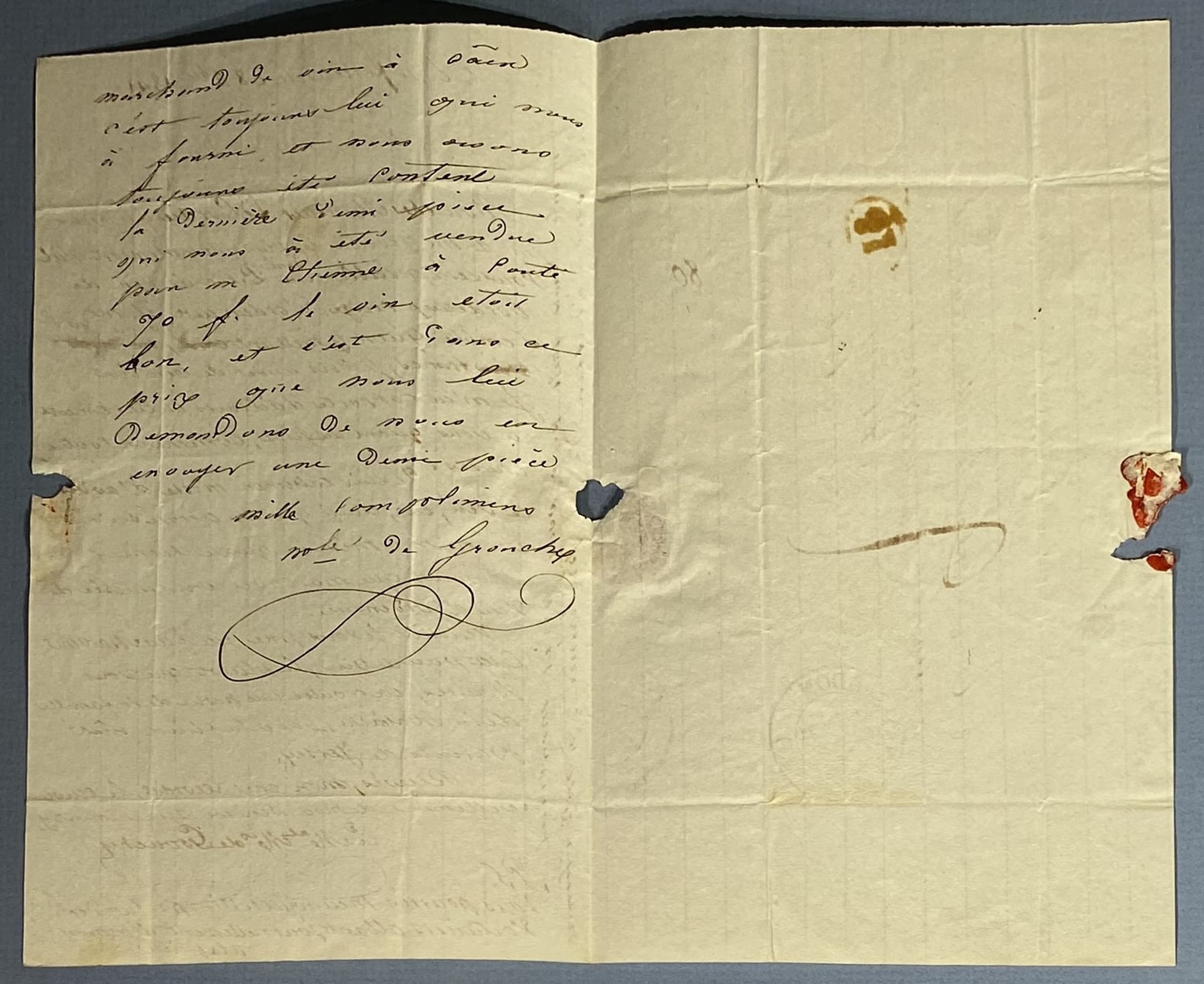 In this intimate letter, Marshal Grouchy gives news of his wife's health and that of their daughter Noémie, aged 9, who died four years later. 'Your letter of 15 August, which you sent here, my dear Dastier, was sent to find me in Cherbourg, where I was no longer, and has just been sent back to me at La Férière, where I have been for the last two days [...] Sea bathing has done the Marshal less good this year than last: it is true that she has been greatly upset by the weather, which has been almost constantly bad, during the two months we have been in Cherbourg. [...] But what gives me grief and concern is Noémie's condition - she has not taken any baths this year, as it was they that developed her stomach upsets last year: but we hoped that the use of milk, which is the only food she takes, and the resulting distraction for her of one of her first cousins, whom we have had with us since we left Paris, would ease her illness. So far so good, because the intensity of the illness is the same. It is very distressing, I assure you, to see this charming child suffering all the time, who is no doubt not in danger at the moment, but whose life is exposed to so many unfortunate things. There you have it, my dear Dastier, a complete report on our health. I am very sorry that the one you have given me on yours is hardly more satisfactory, and I sincerely share your moral suffering, which undoubtedly contributes a great deal to your physical suffering. [...] Believe me, my dear Dastier, that I sincerely hope that it will be so, and be convinced that no one shares more than I do the tribulations that besiege you. [Farewell, I embrace you with all my heart'.