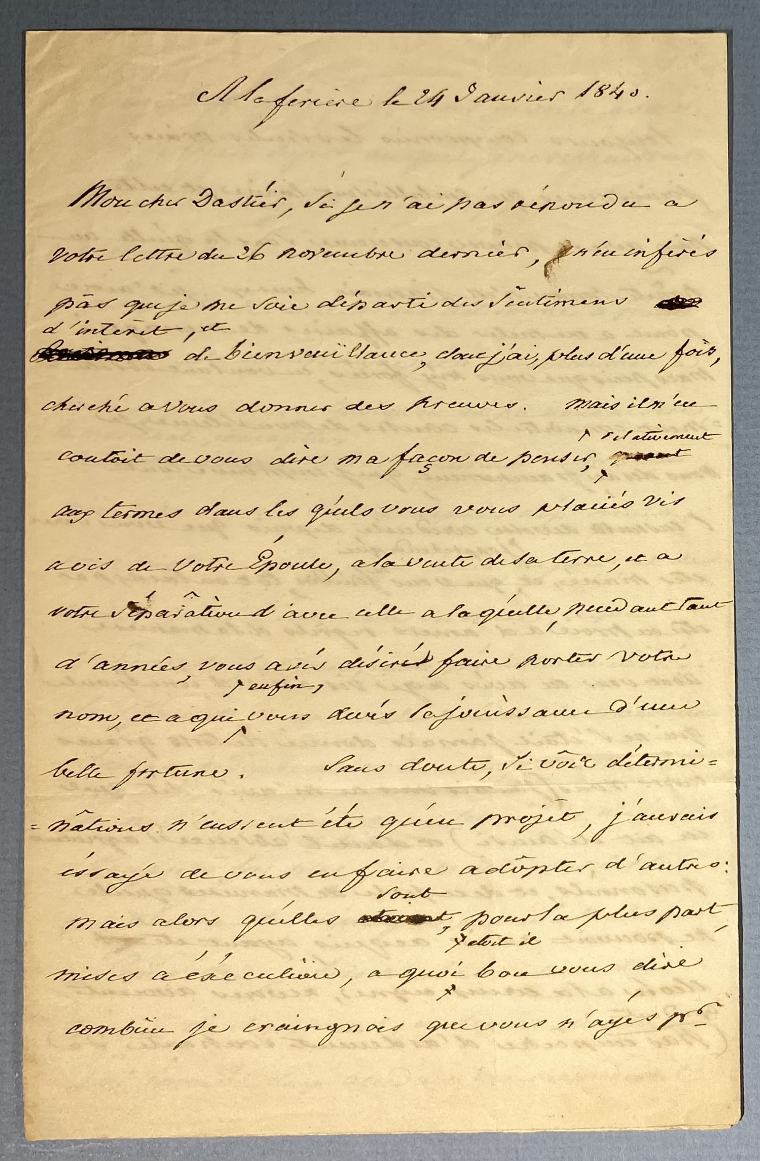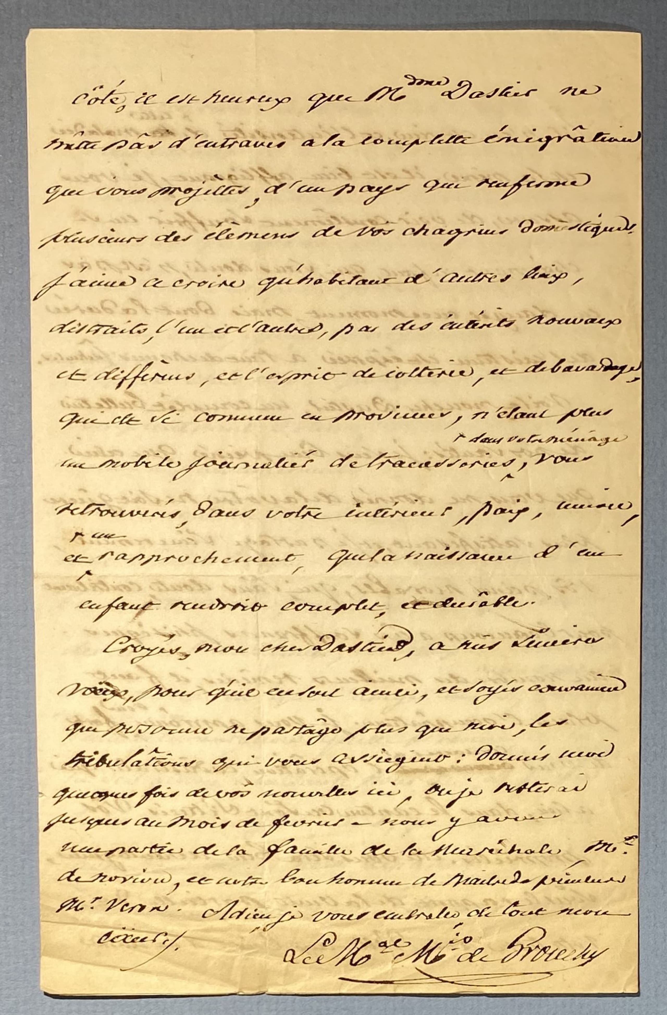 In this intimate letter, Marshal de Grouchy replies to a letter addressed to him by his aide-de-camp, Viscount Dastier, who informed him of his separation from his wife. 'My dear Dastier, if I have not replied to your letter of 26 November last, do not infer that I have abandoned the feelings of interest and benevolence of which I have, more than once, sought to give you proof. But I had to tell you how I felt about the terms in which you complained about your wife, about the sale of her land, and about your separation from her, to whom for so many years you wanted your name to bear, and to whom at last you owe the enjoyment of a fine fortune'.