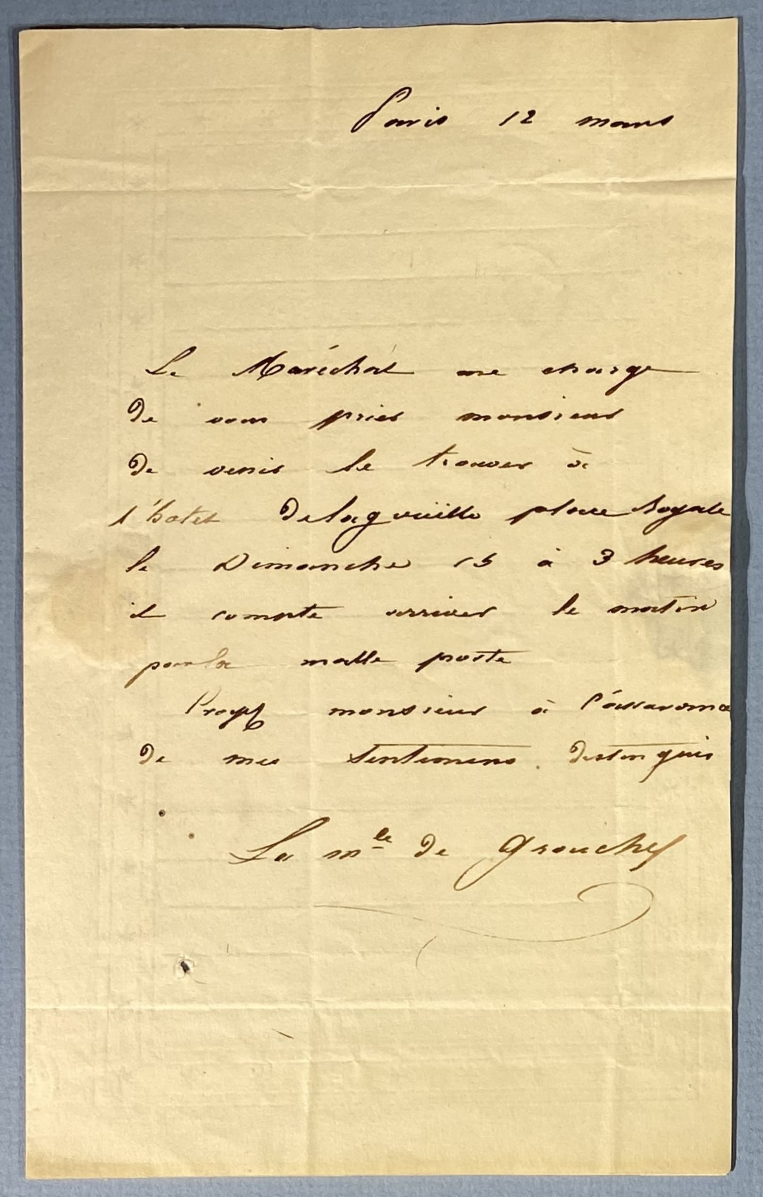 2) Autograph letter signed 'Le Mal Mis de Grouchy' addressed to his aide-de-camp the viscount d'Astier,
