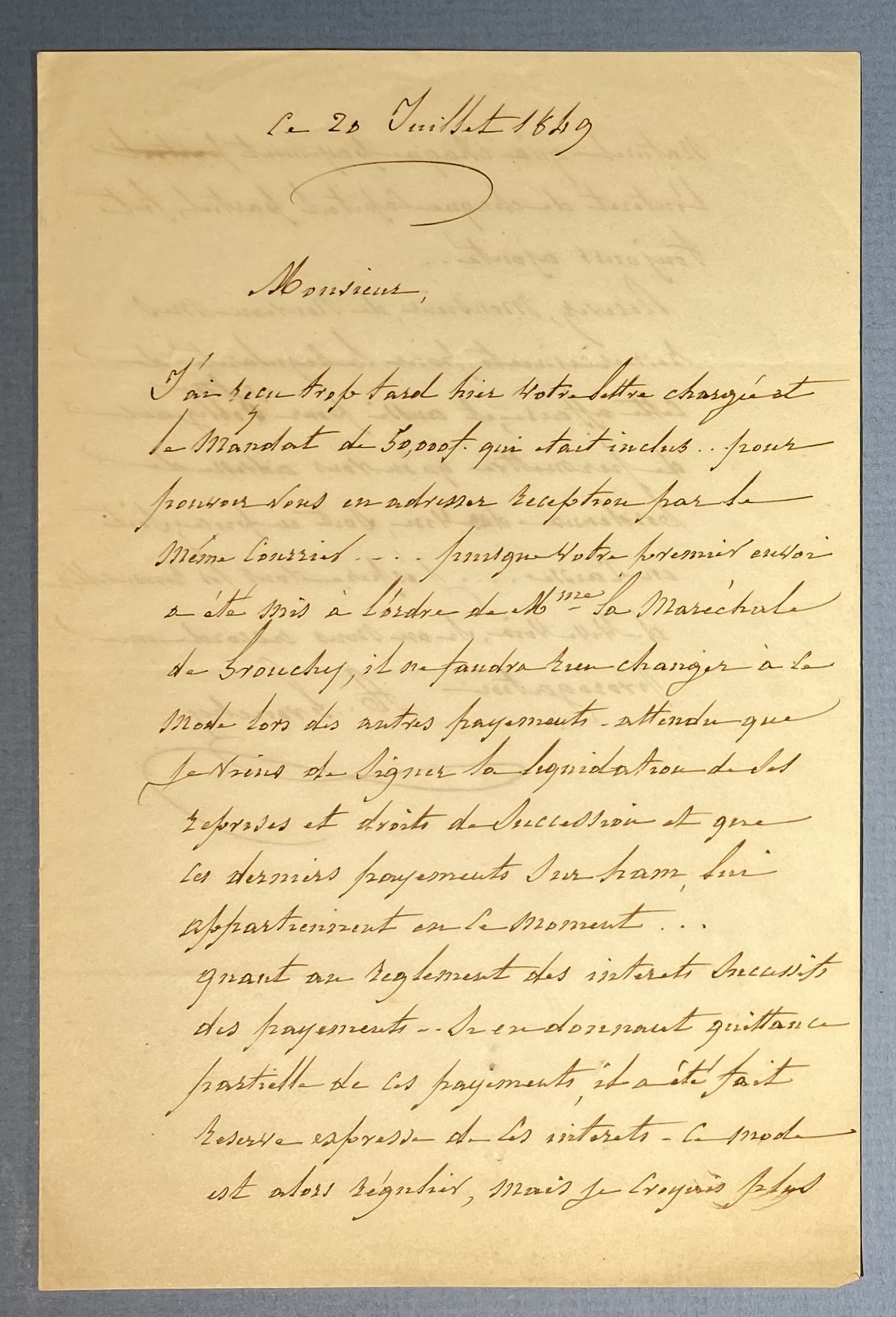 Letter about financial matters concerning the estate of 'Mme la Maréchale de Grouchy'.