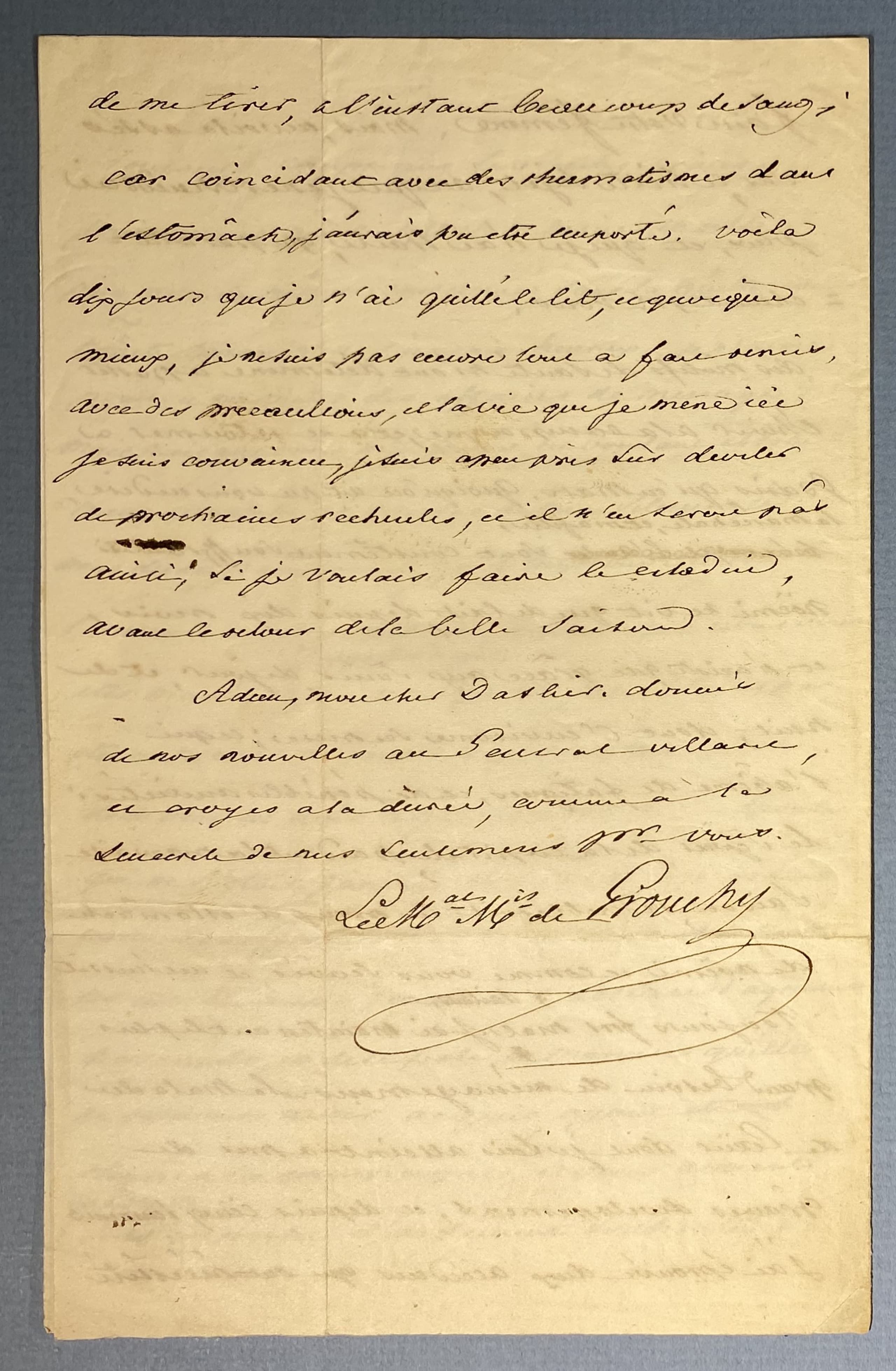 After giving his opinion on his aide-de-camp's relationship with the wife of, Marshal de Grouchy gives news of his health and the health of his wife and their daughter Noémie, aged 10. 'Health reasons have determined me to spend the winter in the country and not to return to Paris until March. Whatever you may have heard, the marshal and my daughter are in constant pain: Noémie has been living on milk alone for ten months, and exists only thanks to the care, day and night, that her mother gives her. [...] I now have the greatest need of care. My heart condition has taken a serious turn for the worse, and in the last five weeks I've had two accidents that required me to draw a lot of blood immediately, because rheumatism in my stomach could have carried me away. I've been in bed for ten days now [...]. Farewell, my dear Dastier, give General Villard your news and believe that my feelings for you will last as long as [...]'.